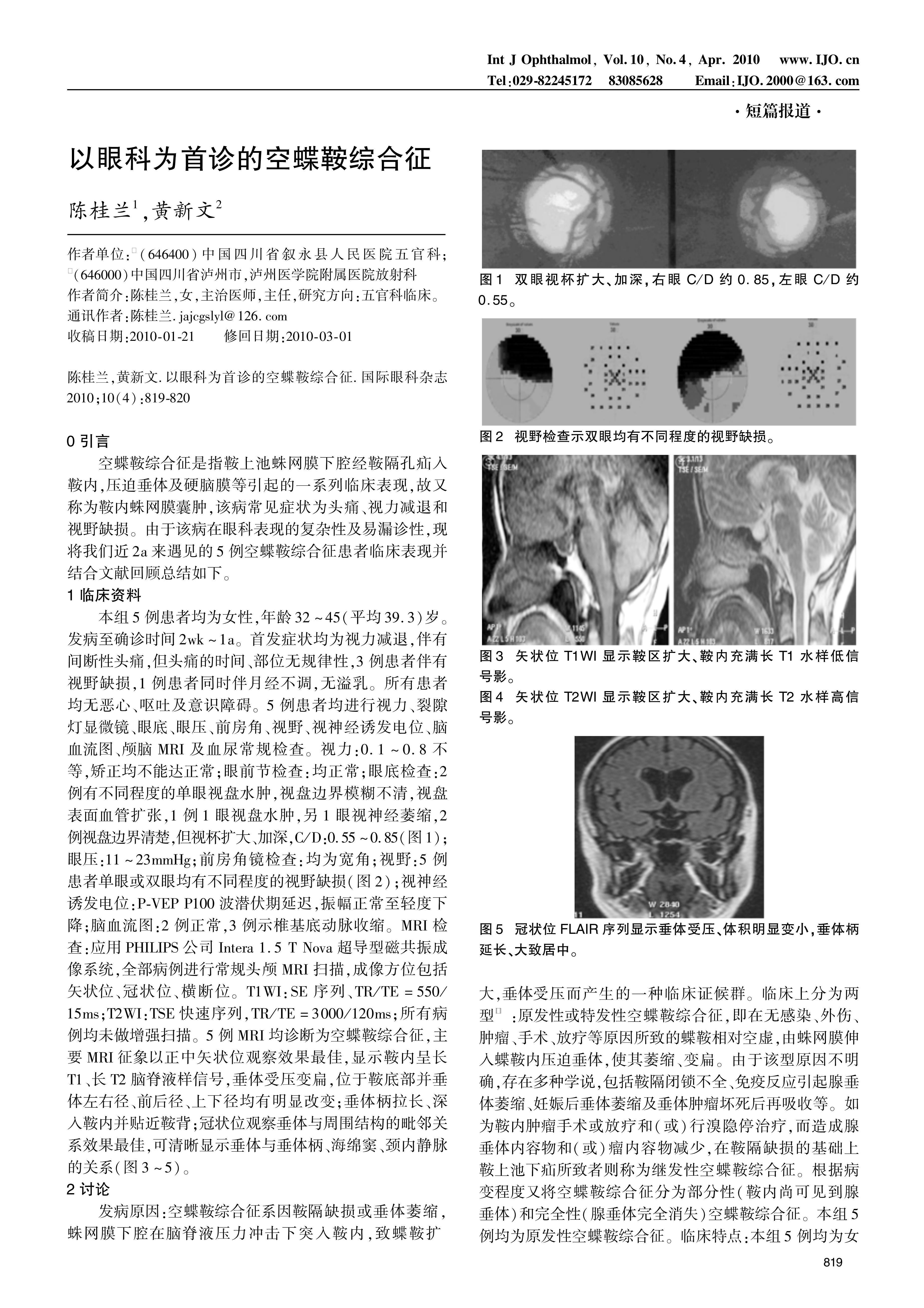 0引言空蝶鞍综合征是指鞍上池蛛网膜下腔经鞍隔孔疝入鞍内,压迫垂体及硬脑膜等引起的一系列临床表现,故又称为鞍内蛛网膜囊肿,该病常见症状为头痛、视力减退和视野缺损。由于该病在眼科表现的复杂性及易漏诊性,现将我们近2a来遇见的5例空蝶鞍综合征患者临床表现并结合文献回顾总结如下。1临床资料本组5例患者均为女性,年龄32~45(平均39.3)岁。发病至确诊时间2wk~1a。首发症状均为视力减退,伴有间断性头痛,但头痛的时间、部位无规律性,3例患者伴有视野缺损,1例患者同时伴月经不调,无溢乳。所有患者均无恶心、呕吐及意识障碍。5例患者均进行视力、裂隙灯显微镜、眼底、眼压、前房角、视野、视神经诱发电位、脑血