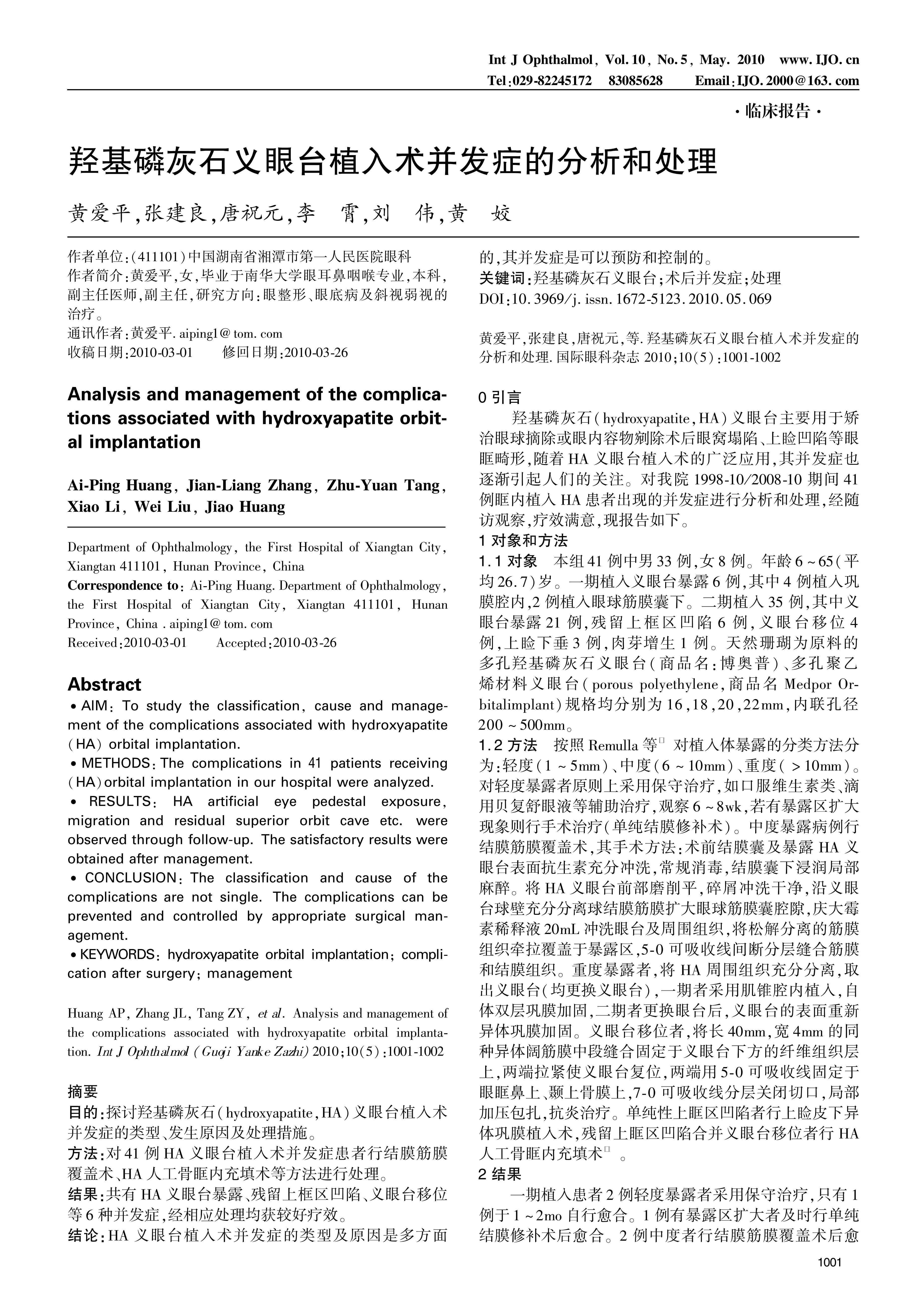 ·AIM:To study the classification,cause and manage-ment of the complications associated with hydroxyapatite(HA)orbital implantation.·METHODS:The complications in 41 patients receiving(HA)orbital implantation in our hospital were analyzed.·RESULTS:HA artificial eye pedestal exposure,migration and residual superior orbit cave etc.were observed through follow-up.The satisfactory results were obtained after management.·CONCLUSION:The classification and cause of the complications are not single.The complications can be prevented and controlled by appropriate surgical man-agement.·