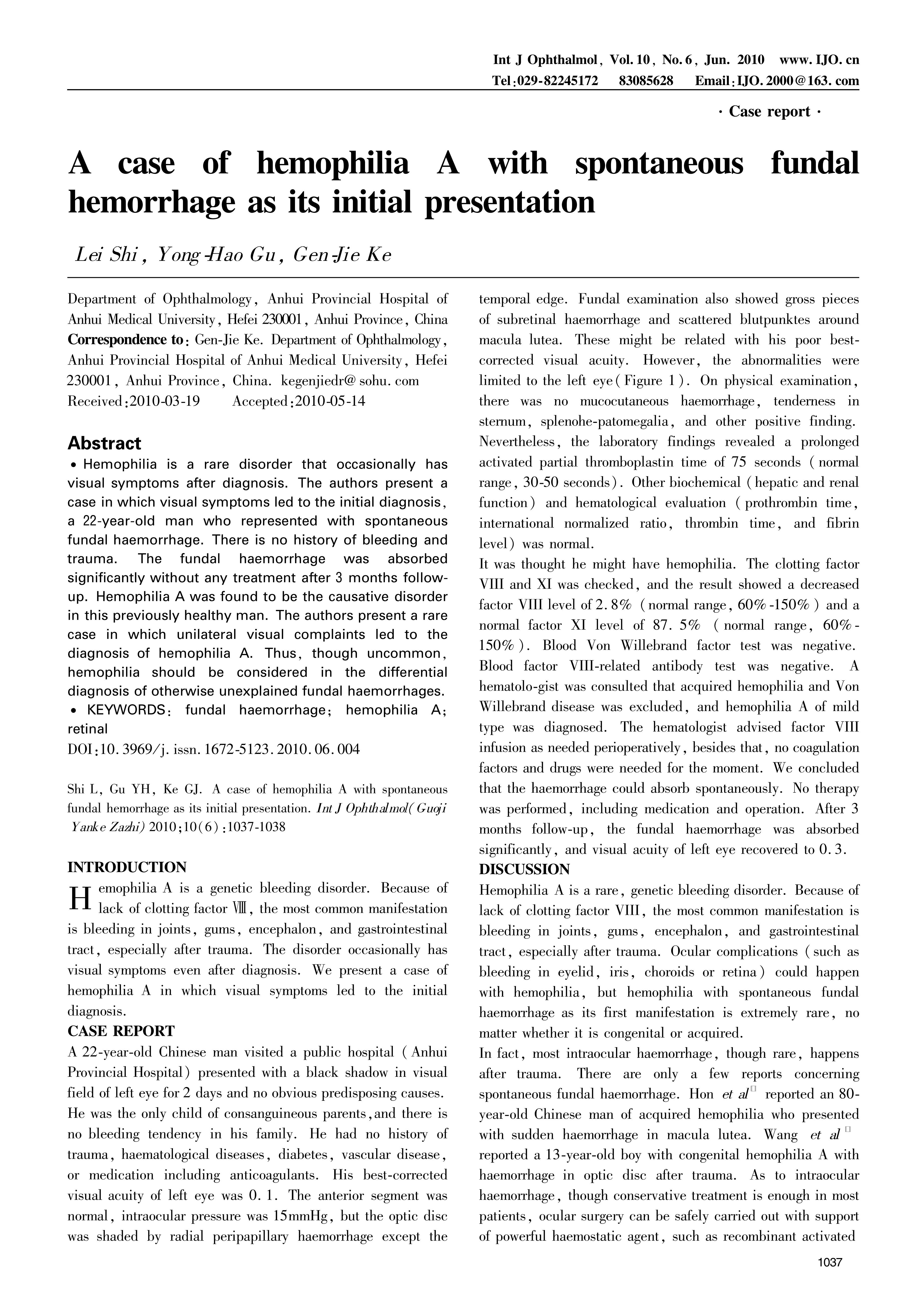 血友病是一种少见的疾病,即使在诊断后也很少发生视力障碍。我们介绍1例因为视力障碍导致了血友病。男,22岁,出现了自发性的眼底出血,没有外伤和出血史,未治疗,随访3mo后眼底出血明显吸收。这名男性青年在被诊断甲型血友病前完全健康。单眼视力障碍导致了甲型血友病。所以,在无法解释的眼底出血时,血友病应作为鉴别诊断之一来考虑。