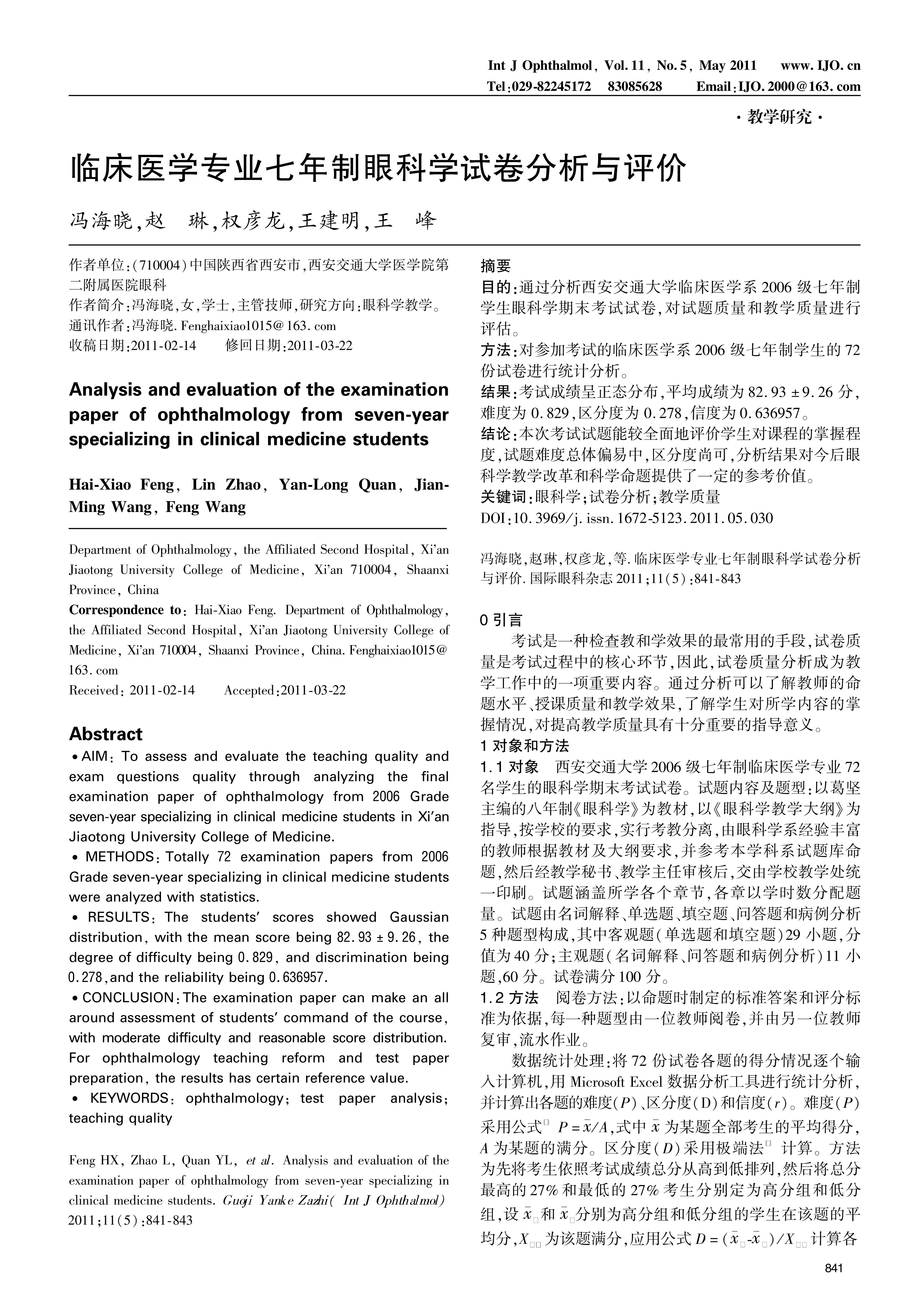 ·AIM:To assess and evaluate the teaching quality and exam questions quality through analyzing the final examination paper of ophthalmology from 2006 Grade seven-year specializing in clinical medicine students in Xi’an Jiaotong University College of Medicine.·METHODS:Totally 72 examination papers from 2006 Grade seven-year specializing in clinical medicine students were analyzed with statistics.·RESULTS:The students’ scores showed Gaussian distribution,with the mean score being 82.93±9.26,the degree of difficulty being 0.829,and discrimination being 0.278,and the reliability being 0.636957.·CONCLUSION:The examination paper can make an all around assessment of students’ command of the course,with moderate difficulty and reasonable score distribution.For ophthalmology teaching reform and test paper preparation,the results has certain reference value.·