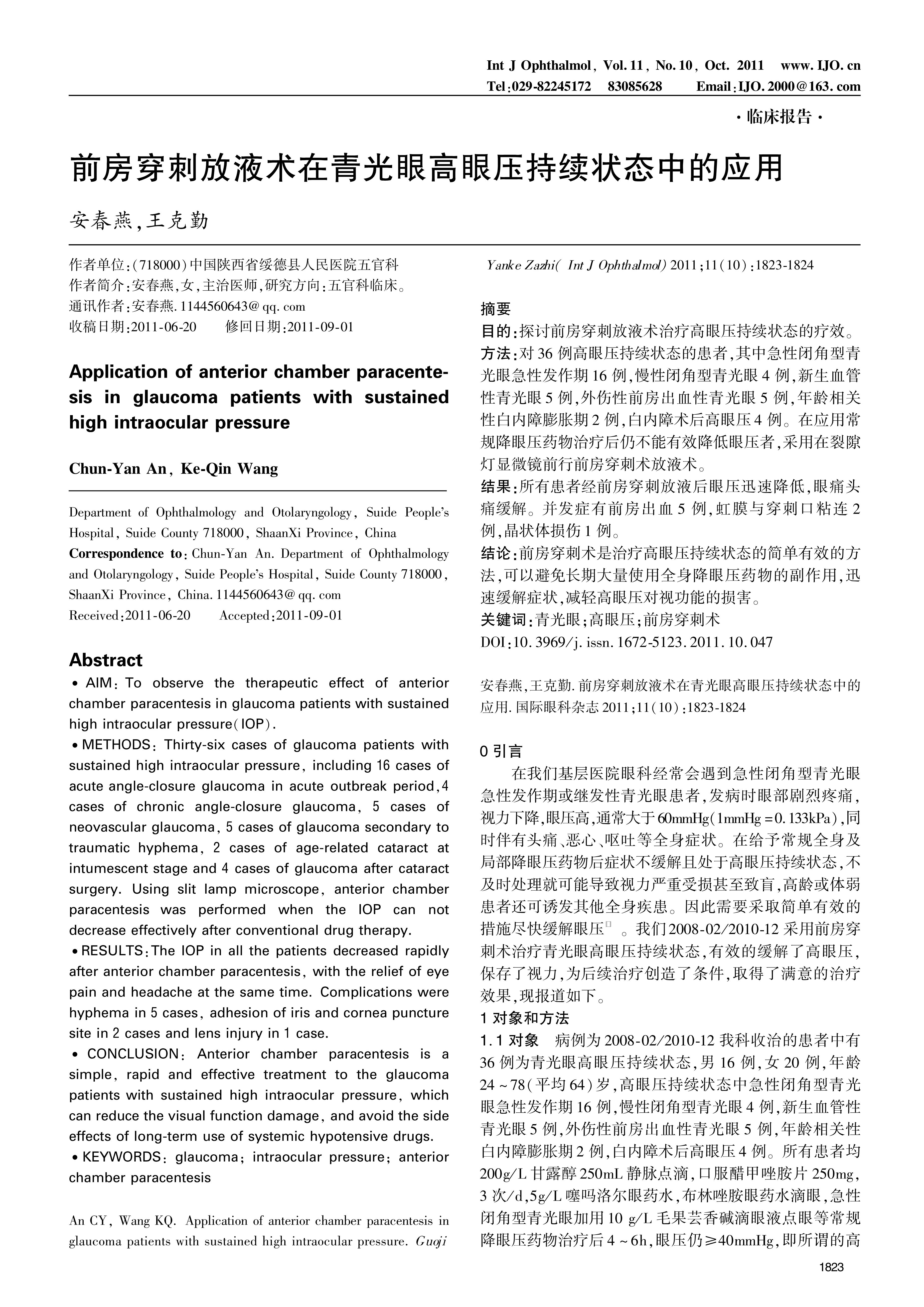 AIM:To observe the therapeutic effect of anterior chamber paracentesis in glaucoma patients with sustained high intraocular pressure(IOP).METHODS:Thirty-six cases of glaucoma patients with sustained high intraocular pressure,including 16 cases of acute angle-closure glaucoma in acute outbreak period,4 cases of chronic angle-closure glaucoma,5 cases of neovascular glaucoma,5 cases of glaucoma secondary to traumatic hyphema,2 cases of age-related cataract at intumescent stage and 4 cases of glaucoma after cataract surgery.Using slit lamp microscope,anterior chamber paracentesis was performed when the IOP can not decrease effectively after conventional drug therapy.RESULTS:The IOP in all the patients decreased rapidly after anterior chamber paracentesis,with the relief of eye pain and headache at the same time.Complications were hyphema in 5 cases,adhesion of iris and cornea puncture site in 2 cases and lens injury in 1 case.CONCLUSION:Anterior chamber paracentesis is a simple,rapid and effective treatment to the glaucoma patients with sustained high intraocular pressure,which can reduce the visual function damage,and avoid the side effects of long-term use of systemic hypotensive drugs.