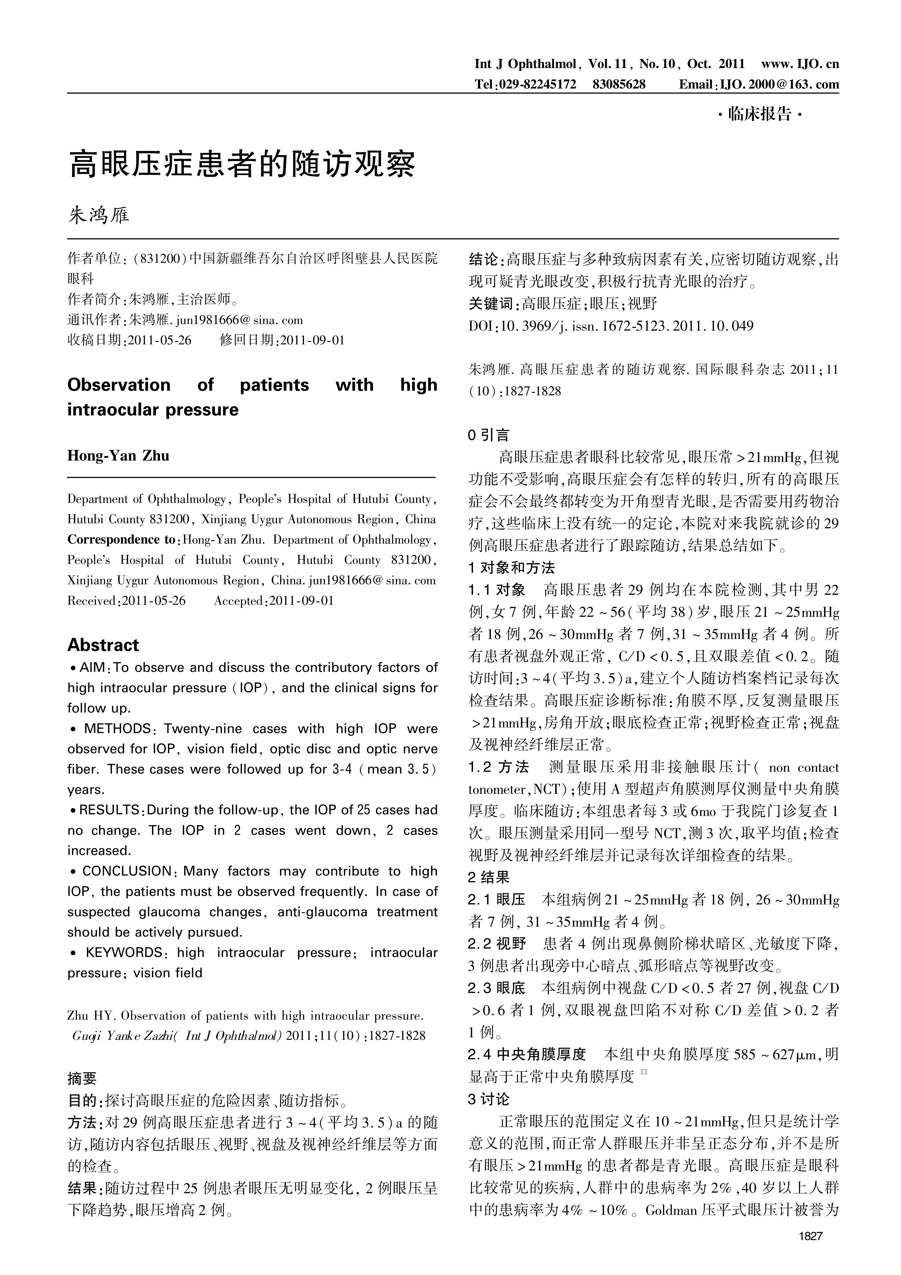AIM:To observe and discuss the contributory factors of high intraocular pressure (IOP),and the clinical signs for follow up.METHODS:Twenty-nine cases with high IOP were observed for IOP,vision field,optic disc and optic nerve fiber.These cases were followed up for 3-4 (mean 3.5) years.RESULTS:During the follow-up,the IOP of 25 cases had no change.The IOP in 2 cases went down,2 cases increased.CONCLUSION:Many factors may contribute to high IOP,the patients must be observed frequently.In case of suspected glaucoma changes,anti-glaucoma treatment should be actively pursued.