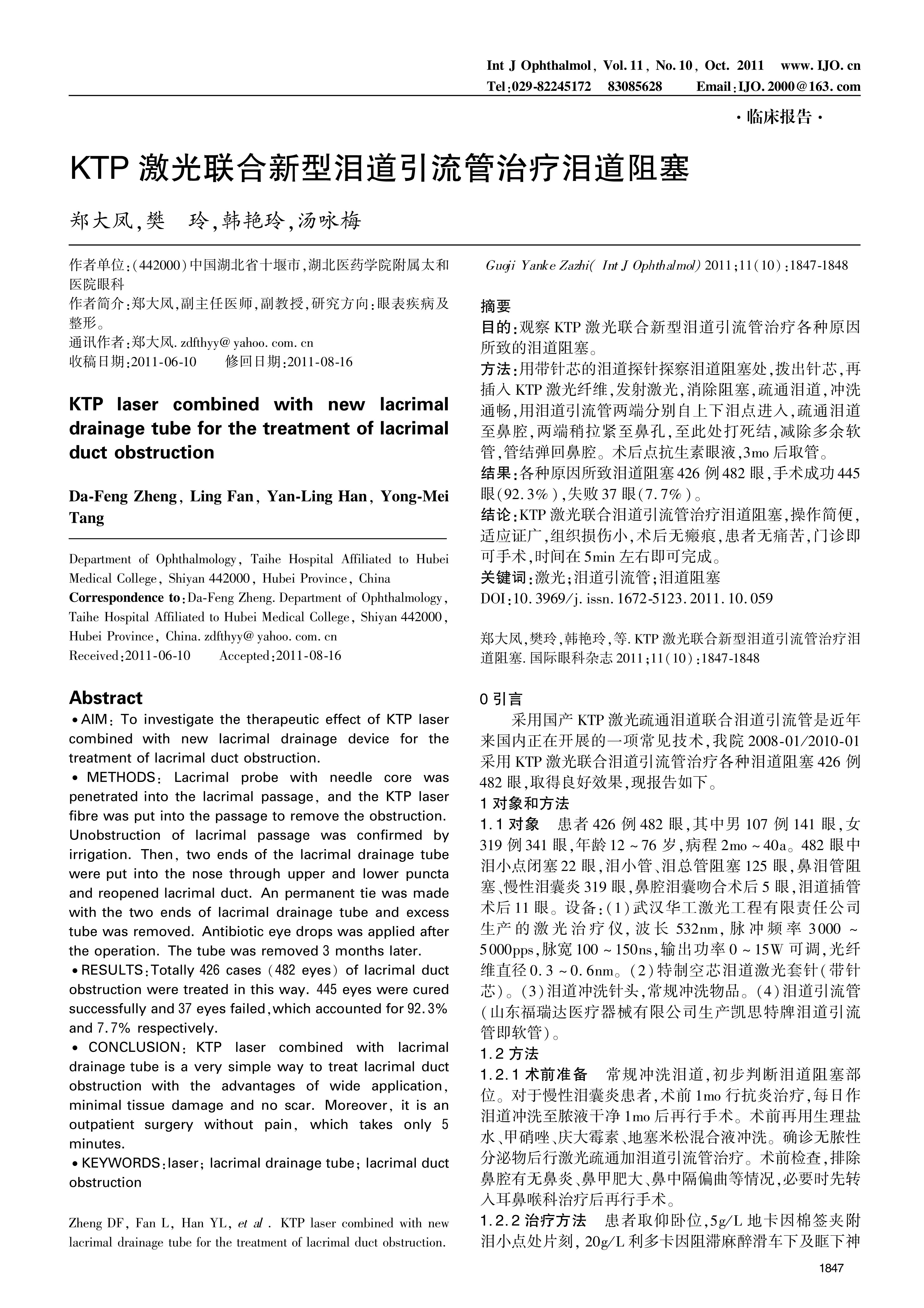 目的:观察KTP激光联合新型泪道引流管治疗各种原因所致的泪道阻塞。方法:用带针芯的泪道探针探察泪道阻塞处,拨出针芯,再插入KTP激光纤维,发射激光,消除阻塞,疏通泪道,冲洗通畅,用泪道引流管两端分别自上下泪点进入,疏通泪道至鼻腔,两端稍拉紧至鼻孔,至此处打死结,减除多余软管,管结弹回鼻腔。术后点抗生素眼液,3mo后取管。结果:各种原因所致泪道阻塞426例482眼,手术成功445眼(92.3%),失败37眼(7.7%)。结论:KTP激光联合泪道引流管治疗泪道阻塞,操作简便,适应证广,组织损伤小,术后无瘢痕,患者无痛苦,门诊即可手术,时间在5min左右即可完成。