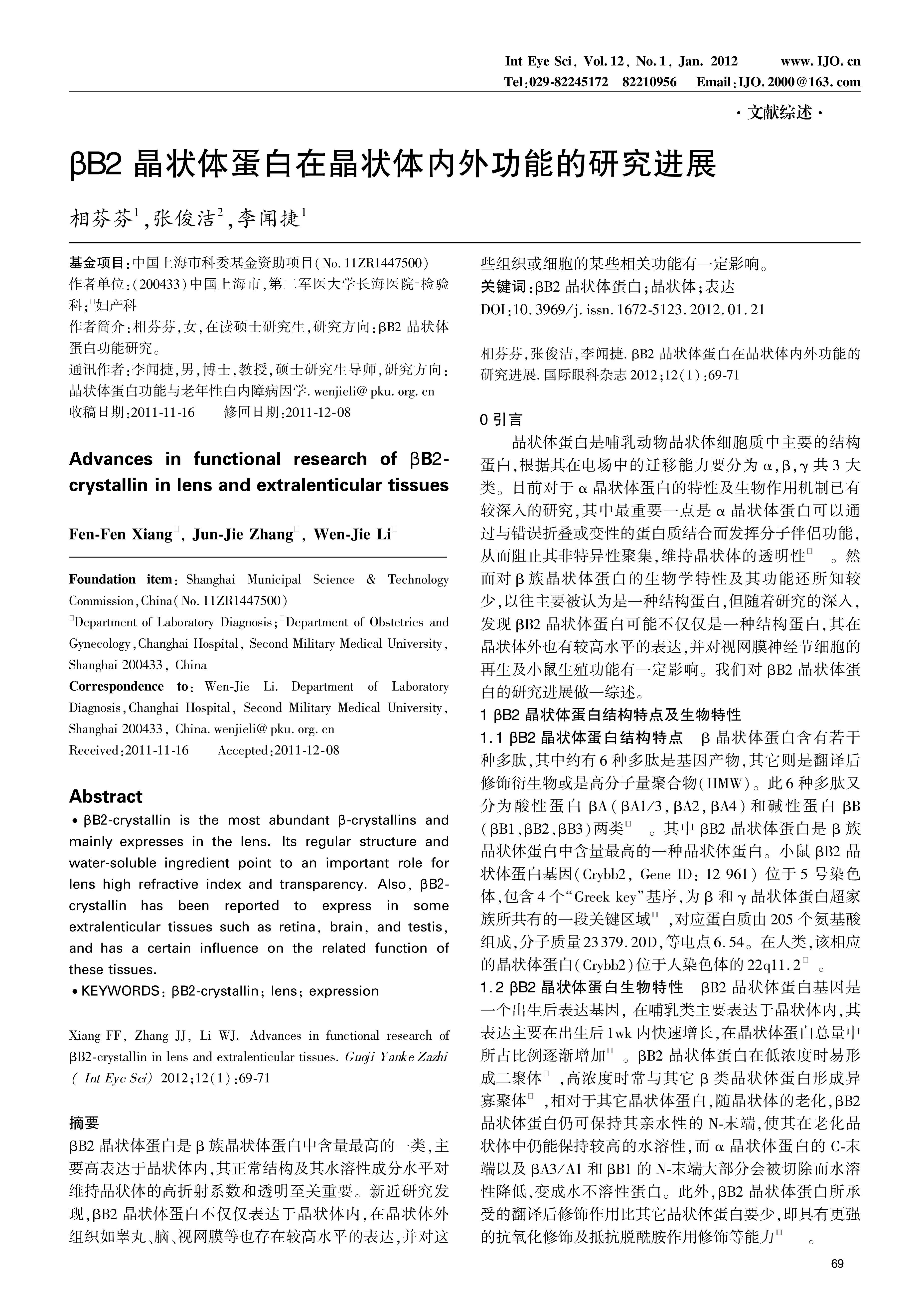 βB2晶状体蛋白是β族晶状体蛋白中含量最高的一类,主要高表达于晶状体内,其正常结构及其水溶性成分水平对维持晶状体的高折射系数和透明至关重要。新近研究发现,βB2晶状体蛋白不仅仅表达于晶状体内,在晶状体外组织如睾丸、脑、视网膜等也存在较高水平的表达,并对这些组织或细胞的某些相关功能有一定影响。