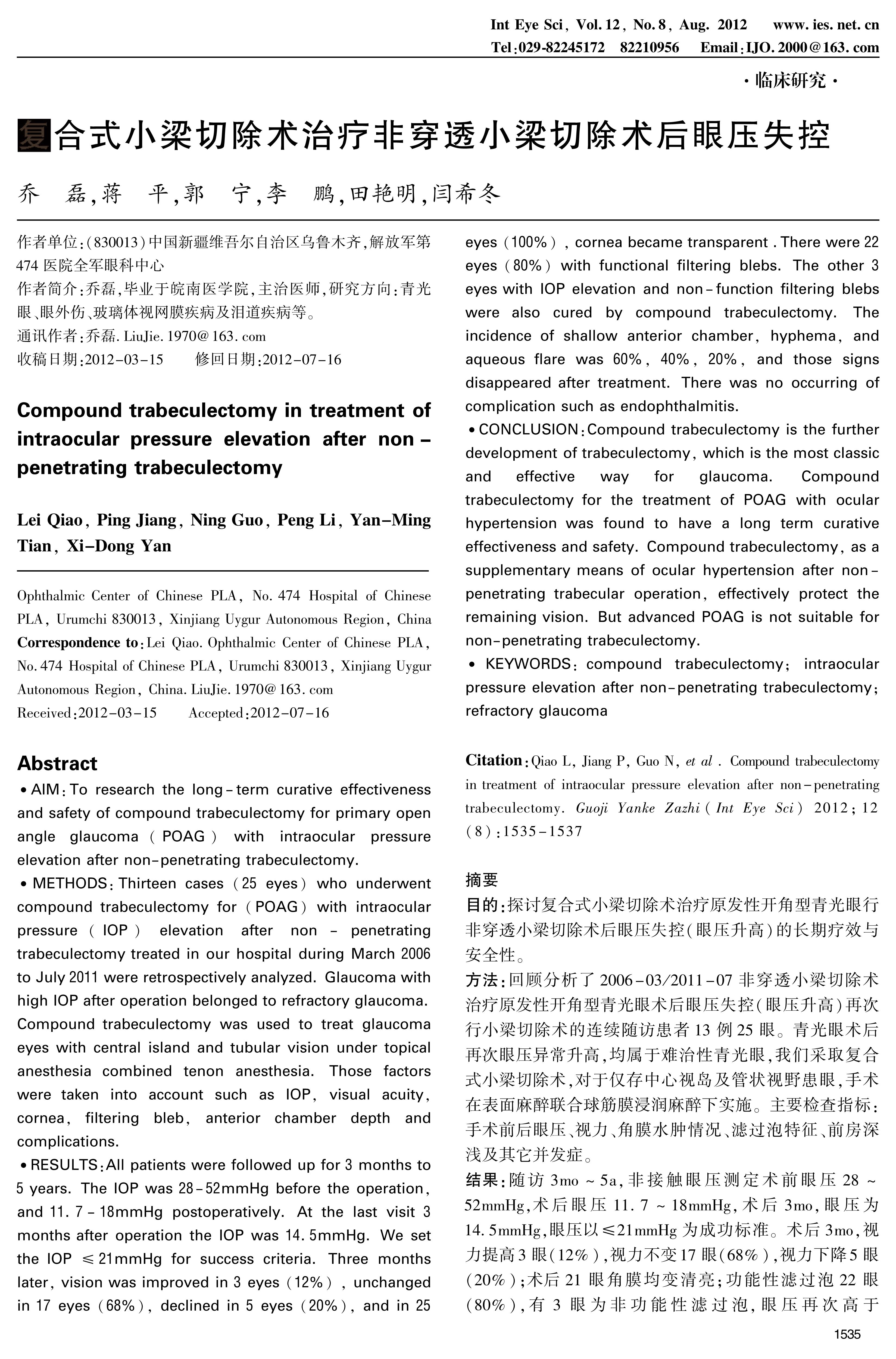 AIM:To research the long-term curative effectiveness and safety of compound trabeculectomy for primary open angle glaucoma(POAG) with intraocular pressure elevation after non-penetrating trabeculectomy. METHODS:Thirteen cases (25 eyes) who underwent compound trabeculectomy for (POAG) with intraocular pressure(IOP) elevation after non-penetrating trabeculectomy treated in our hospital during March 2006 to July 2011 were retrospectively analyzed. Glaucoma with high IOP after operation belonged to refractory glaucoma. Compound trabeculectomy was used to treat glaucoma eyes with central island and tubular vision under topical anesthesia combined tenon anesthesia. Those factors were taken into account such as IOP, visual acuity, cornea, filtering bleb, anterior chamber depth and complications.RESULTS:All patients were followed up for 3 months to 5 years. The IOP was 28-52mmHg before the operation, and 11.7-18mmHg postoperatively. At the last visit 3 months after operation the IOP was 14.5mmHg. We set the IOP ≤21mmHg for success criteria. Three months later, vision was improved in 3 eyes (12%) , unchanged in 17 eyes (68%), declined in 5 eyes (20%), and in 25 eyes (100%) , cornea became transparent .There were 22 eyes (80%) with functional filtering blebs. The other 3 eyes with IOP elevation and non-function filtering blebs were also cured by compound trabeculectomy. The incidence of shallow anterior chamber, hyphema, and aqueous flare was 60%, 40%, 20%, and those signs disappeared after treatment. There was no occurring of complication such as endophthalmitis.CONCLUSION:Compound trabeculectomy is the further development of trabeculectomy, which is the most classic and effective way for glaucoma. Compound trabeculectomy for the treatment of POAG with ocular hypertension was found to have a long term curative effectiveness and safety. Compound trabeculectomy, as a supplementary means of ocular hypertension after non-penetrating trabecular operation, effectively protect the remaining vision. But advanced POAG is not suitable for non-penetrating trabeculectomy.