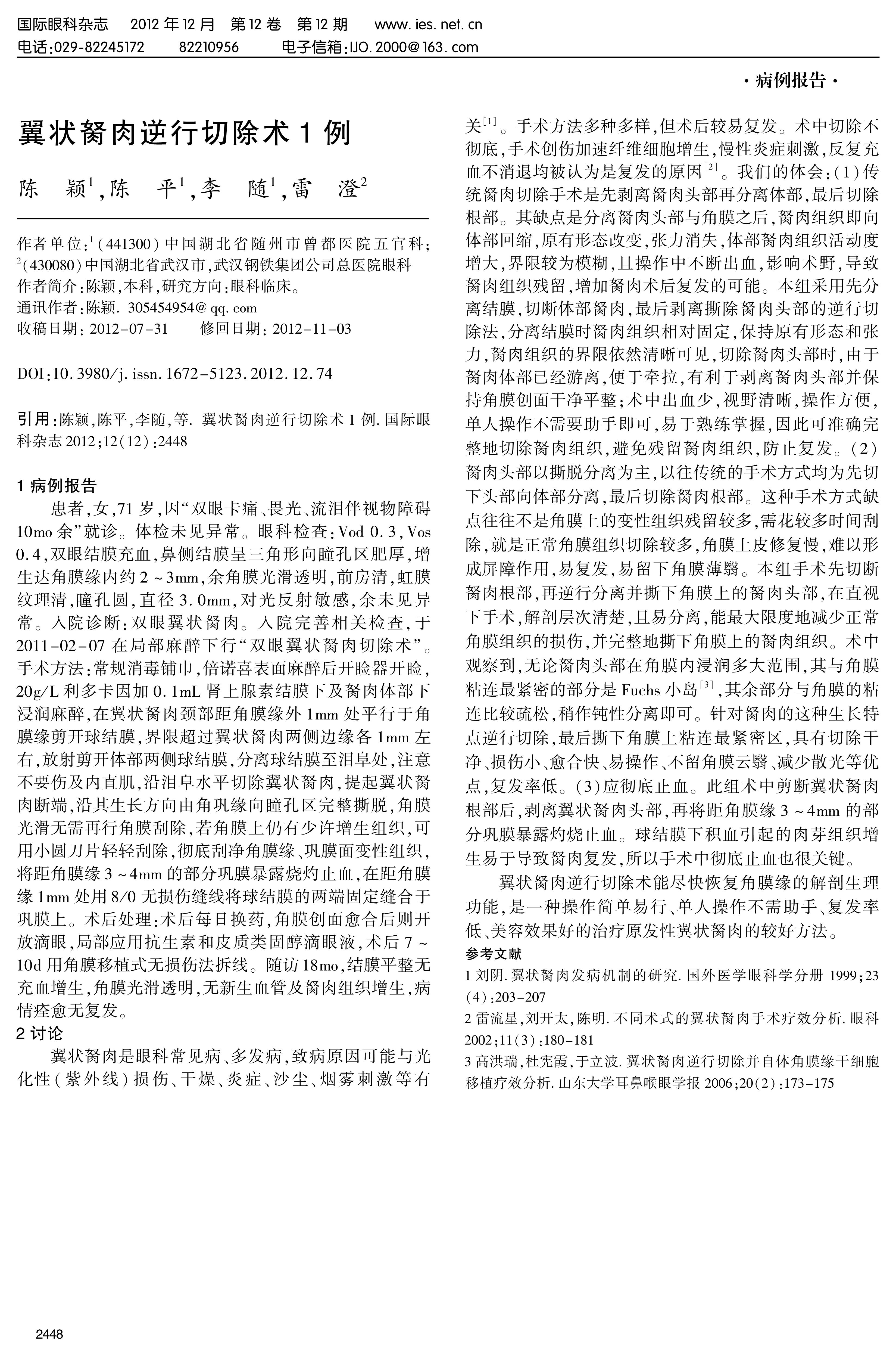 陈颖,陈平,李随,等.翼状胬肉逆行切除术1例.国际眼科杂志, 2012,12(12):2448-0.