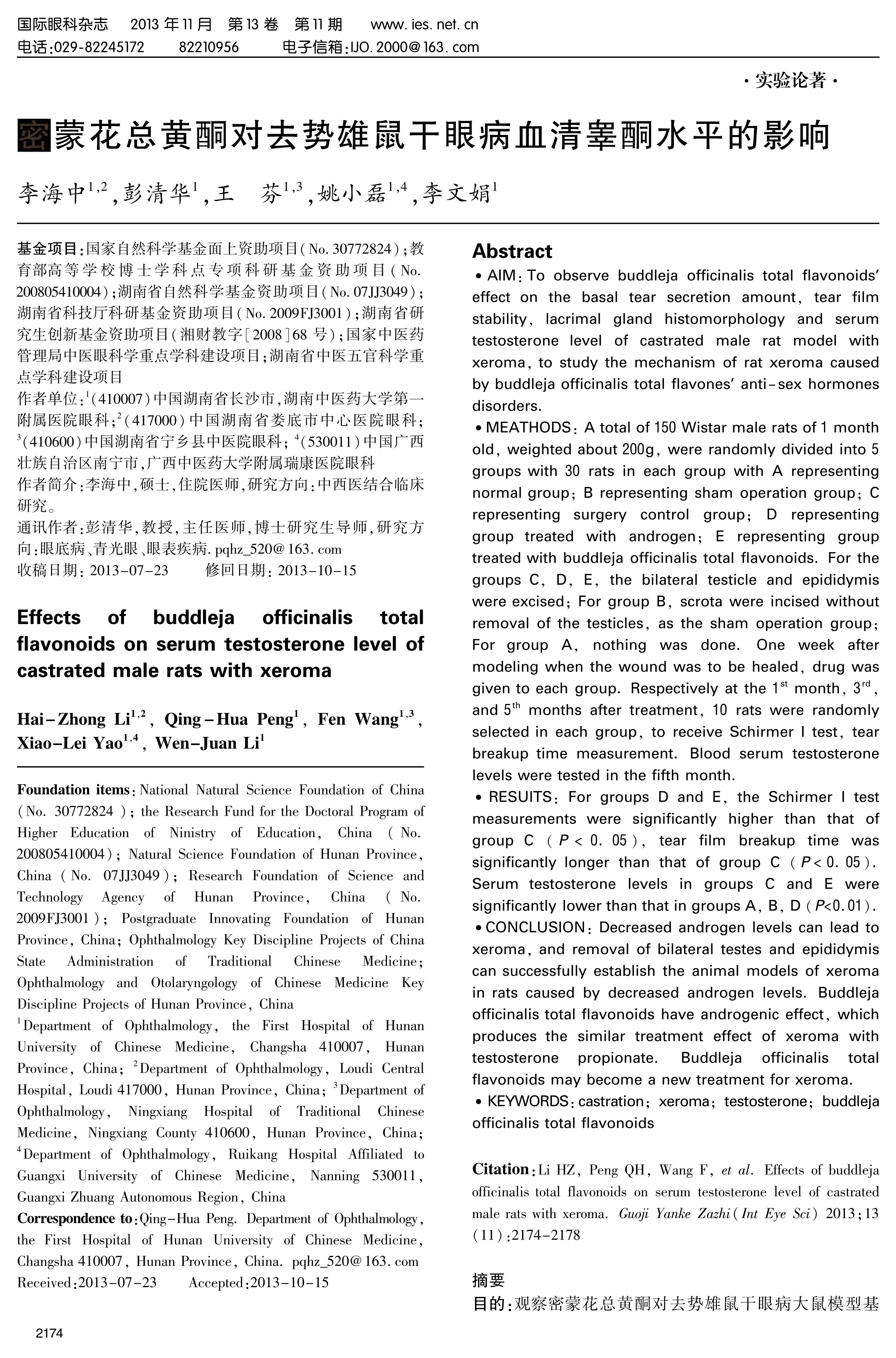 结论: 雄激素水平下降可导致干眼病,采用双侧睾丸及附睾切除的方法可成功建立雄激素水平下降所致的大鼠干眼病动物模型。密蒙花总黄酮具有拟雄激素效应,能够产生同丙酸睾酮治疗干眼病相似的效果。密蒙花总黄酮可能成为治疗干眼病的一个全新药物。
