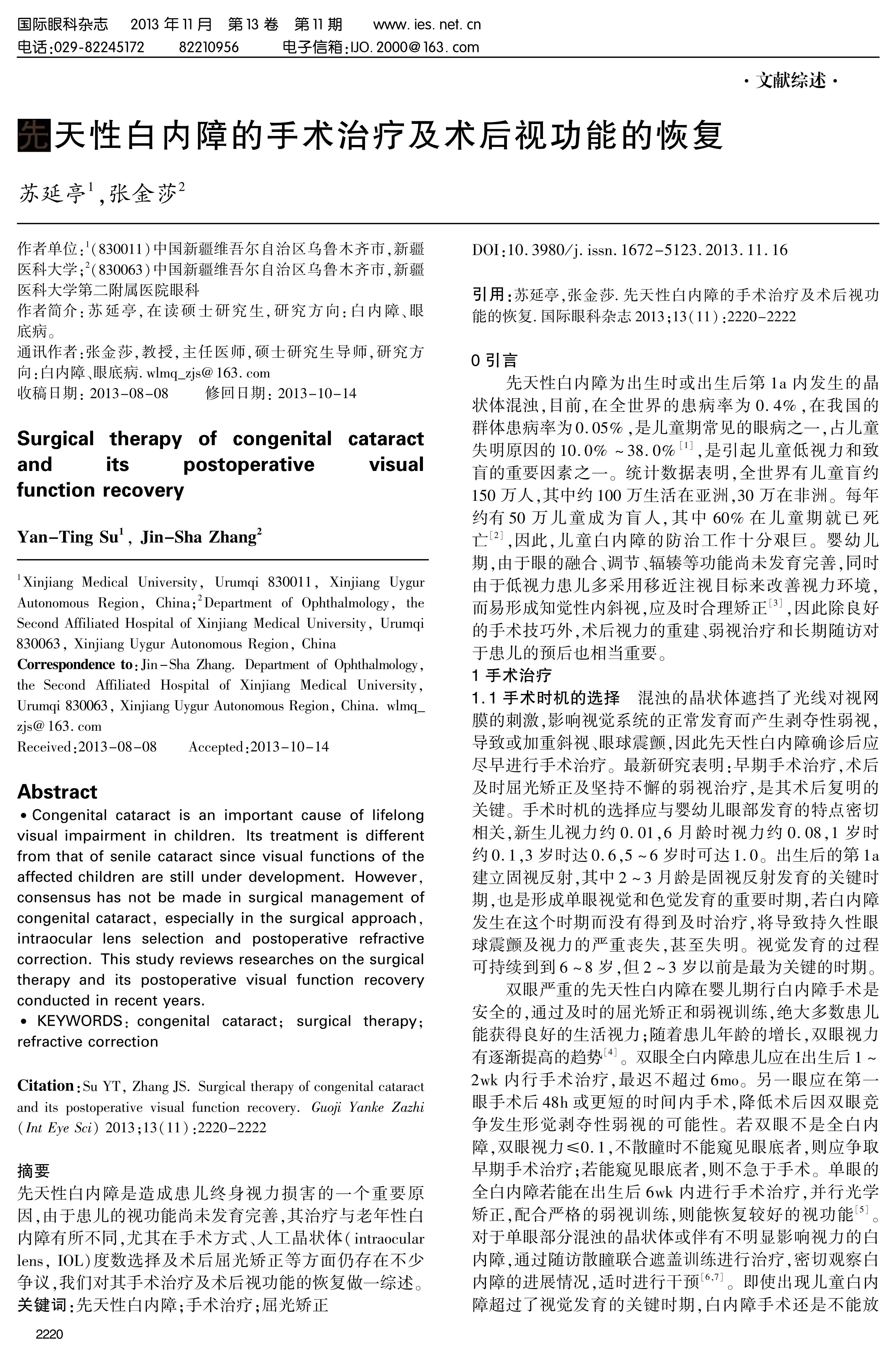 先天性白内障是造成患儿终身视力损害的一个重要原因,由于患儿的视功能尚未发育完善,其治疗与老年性白内障有所不同,尤其在手术方式、人工晶状体(intraocular lens, IOL)度数选择及术后屈光矫正等方面仍存在不少争议,我们对其手术治疗及术后视功能的恢复做一综述。