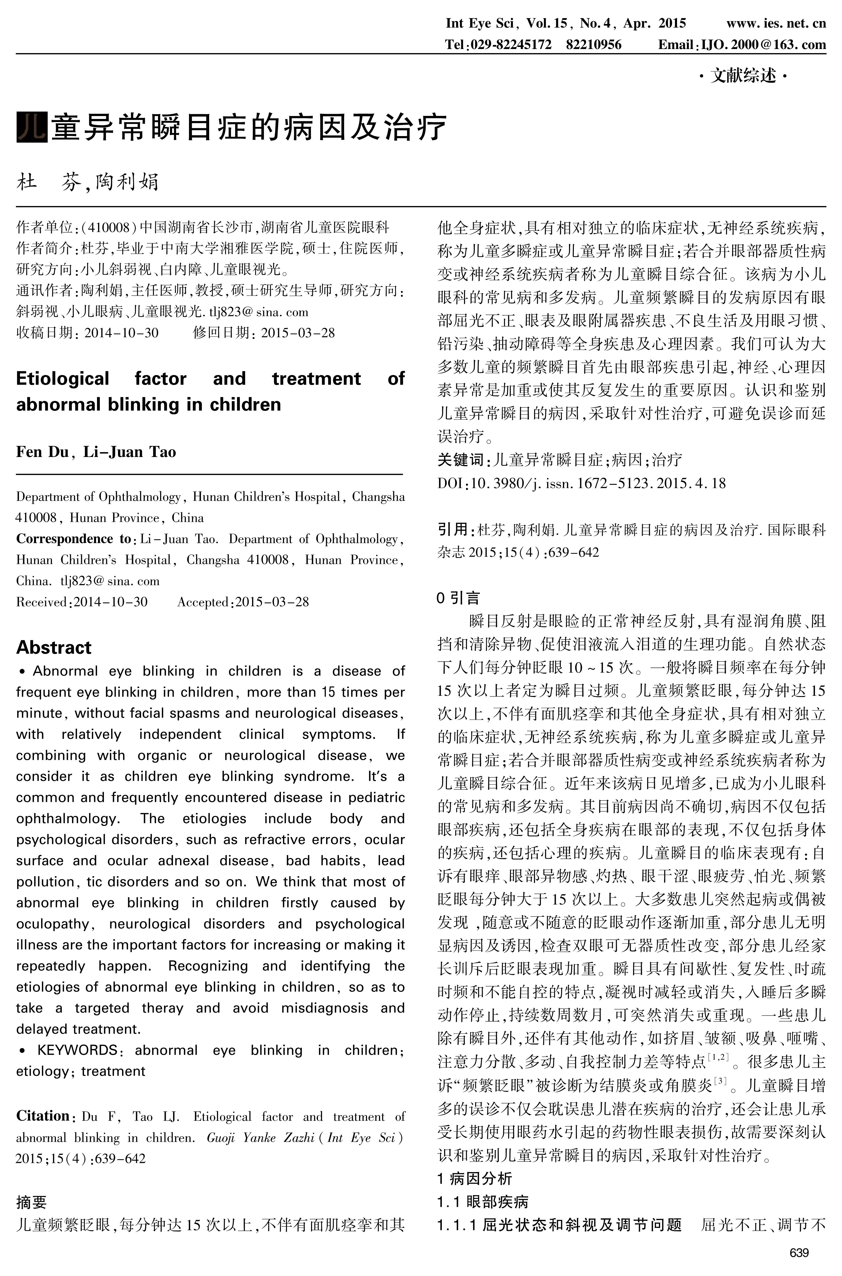 Abnormal eye blinking in children is a disease of frequent eye blinking in children, more than 15 times per minute, without facial spasms and neurological diseases, with relatively independent clinical symptoms. If combining with organic or neurological disease, we consider it as children eye blinking syndrome. It's a common and frequently encountered disease in pediatric ophthalmology. The etiologies include body and psychological disorders, such as refractive errors, ocular surface and ocular adnexal disease, bad habits, lead pollution, tic disorders and so on. We think that most of abnormal eye blinking in children firstly caused by oculopathy, neurological disorders and psychological illness are the important factors for increasing or making it repeatedly happen. Recognizing and identifying the etiologies of abnormal eye blinking in children, so as to take a targeted theray and avoid misdiagnosis and delayed treatment.