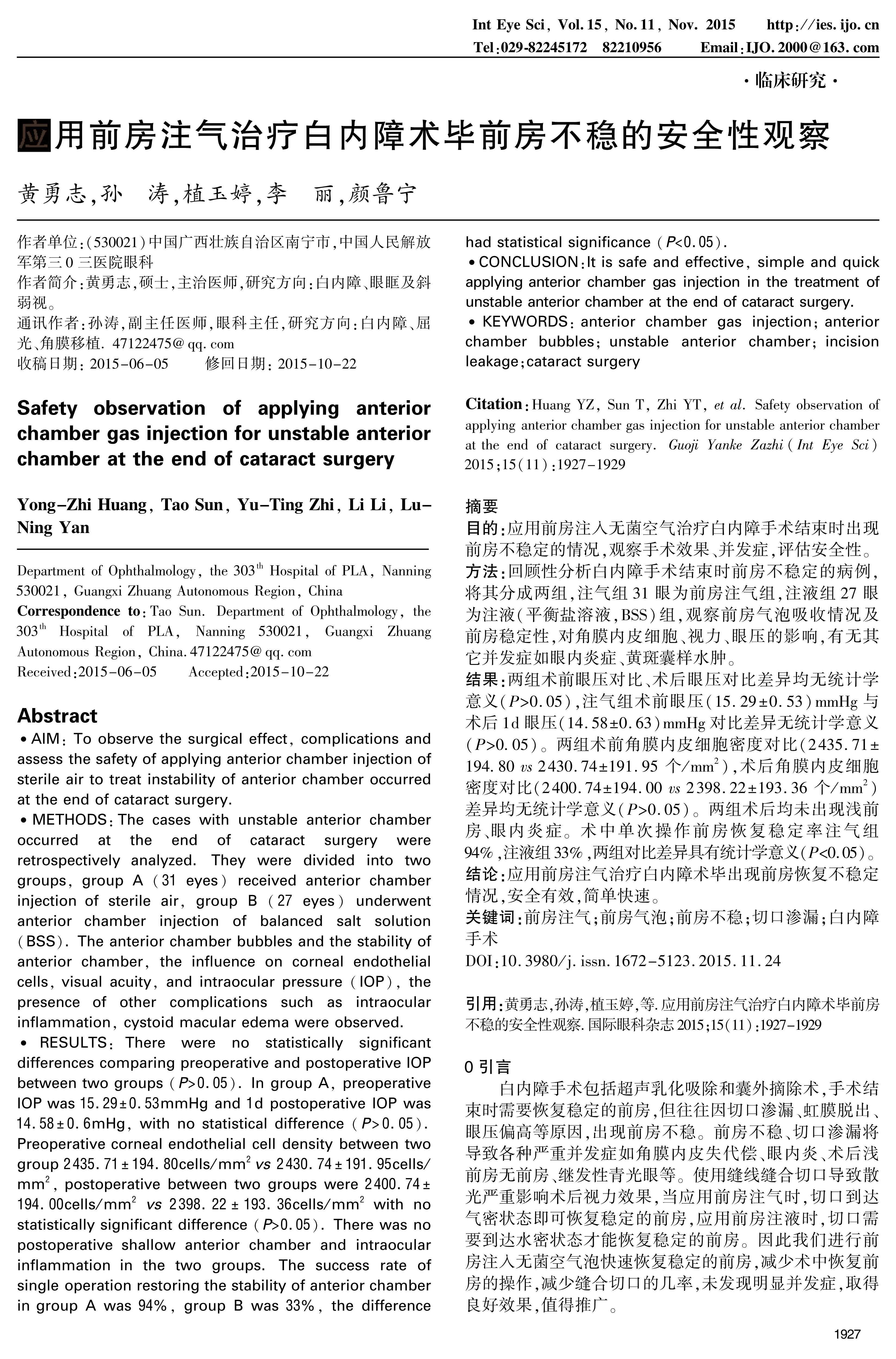 CONCLUSION:It is safe and effective, simple and quick applying anterior chamber gas injection in the treatment of unstable anterior chamber at the end of cataract surgery.