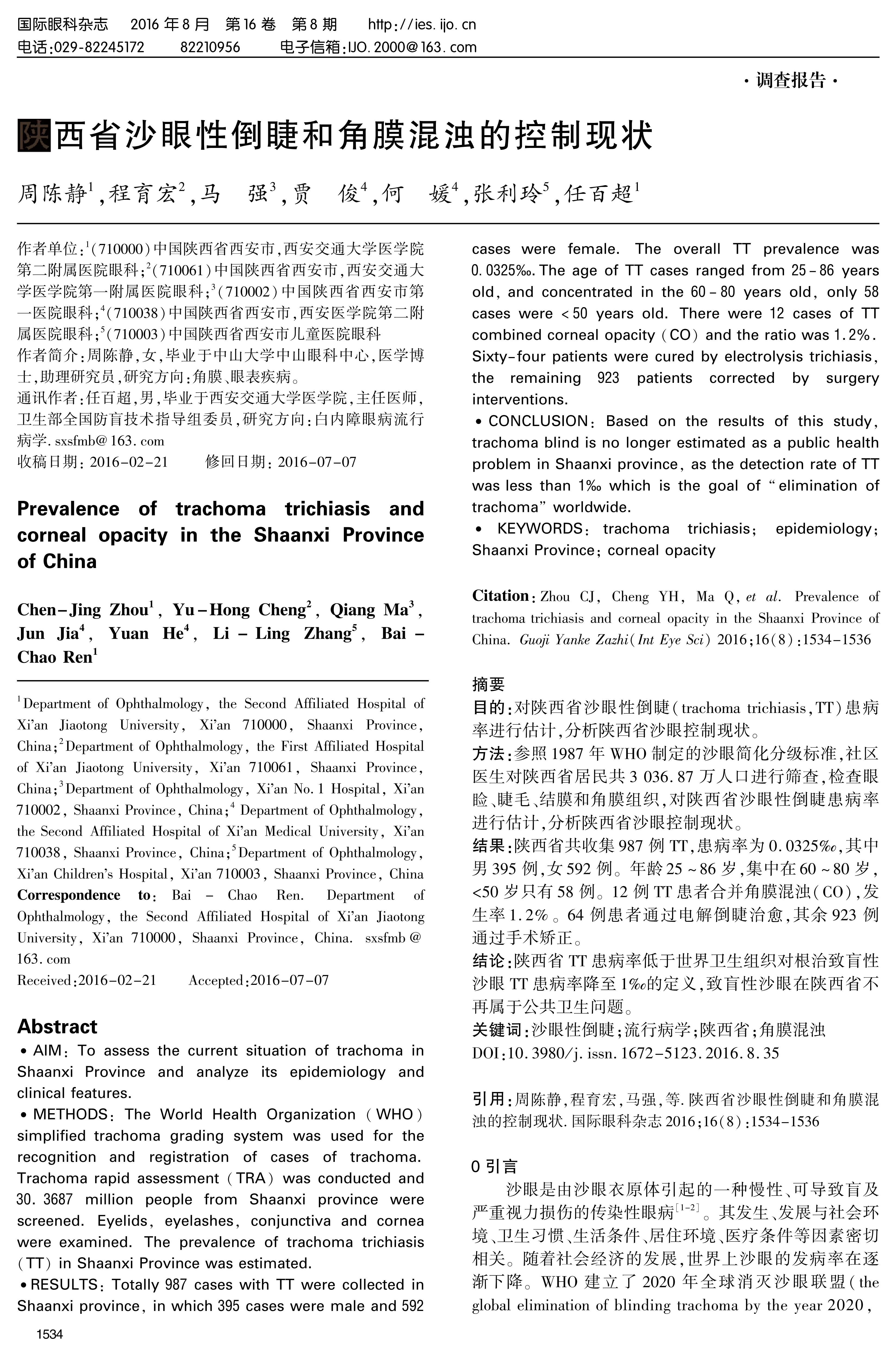 CONCLUSION: Based on the results of this study, trachoma blind is no longer estimated as a public health problem in Shaanxi province, as the detection rate of TT was less than 1‰ which is the goal of “elimination of trachoma” worldwide.