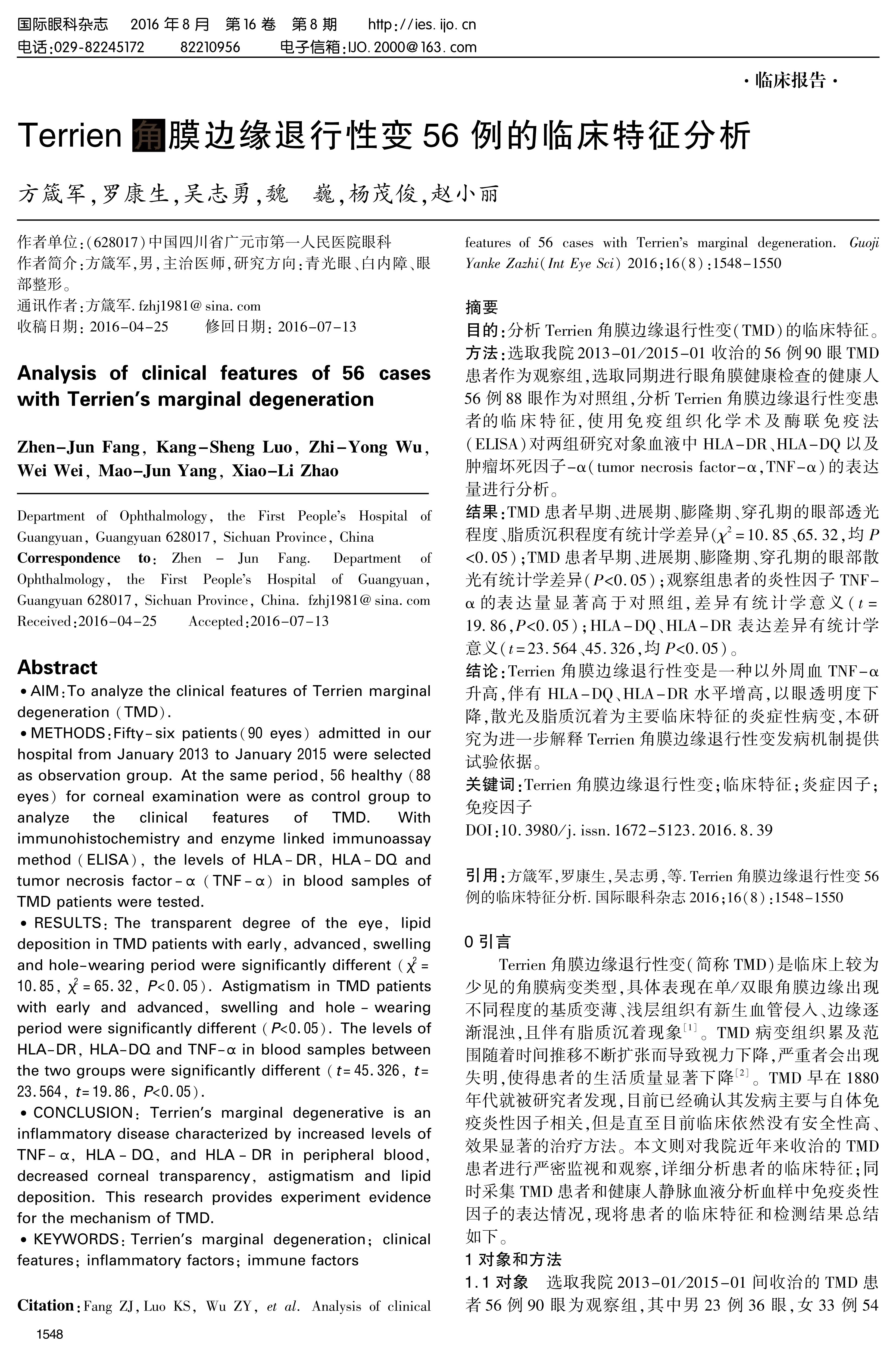 CONCLUSION: Terrien's marginal degenerative is an inflammatory disease characterized by increased levels of TNF-α, HLA-DQ, and HLA-DR in peripheral blood, decreased corneal transparency, astigmatism and lipid deposition. This research provides experiment evidence for the mechanism of TMD.
