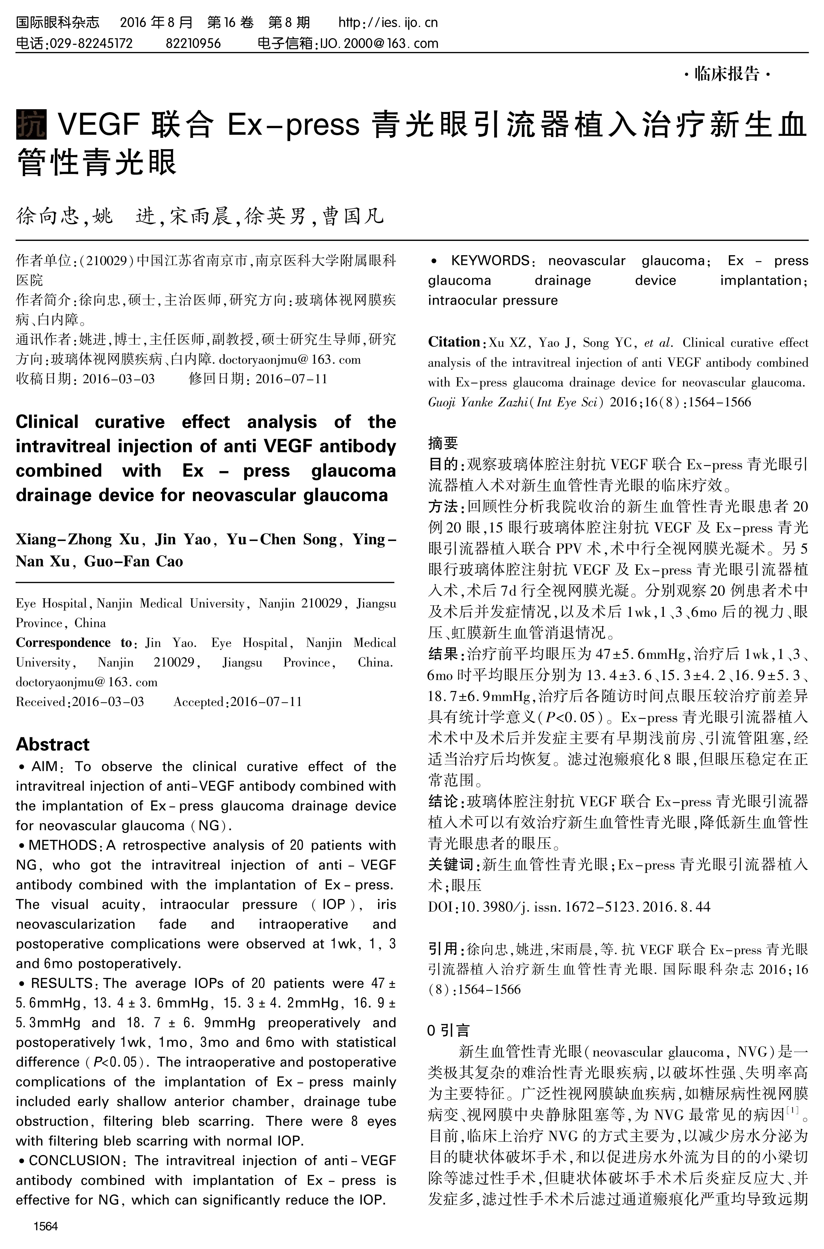 CONCLUSION: The intravitreal injection of anti-VEGF antibody combined with implantation of Ex-press is effective for NG, which can significantly reduce the IOP.