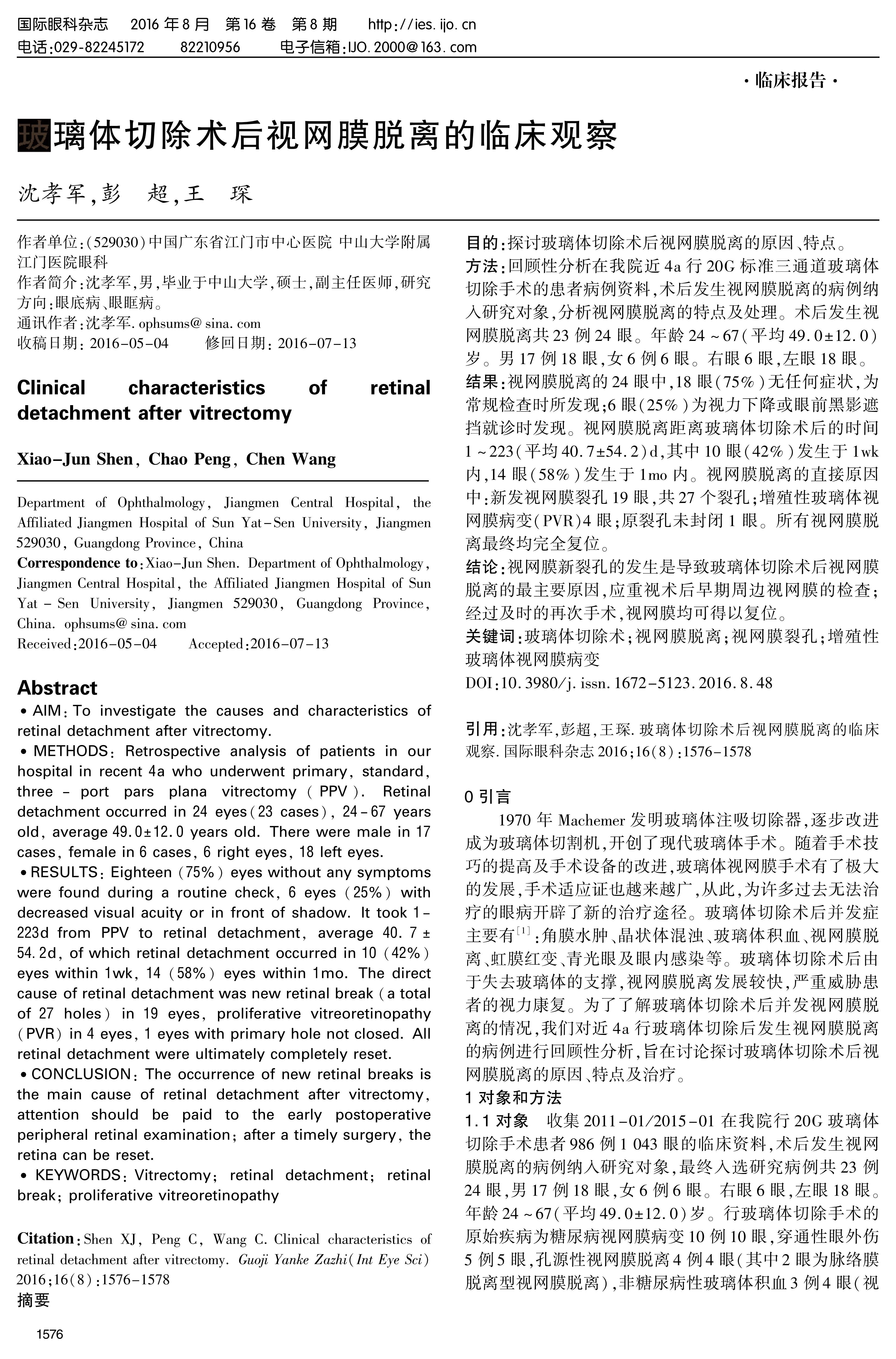 结果:视网膜脱离的24眼中,18眼(75%)无任何症状,为常规检查时所发现; 6眼(25%)为视力下降或眼前黑影遮挡就诊时发现。视网膜脱离距离玻璃体切除术后的时间1~223(平均40.7±54.2)d,其中10眼(42%)发生于1wk内,14眼(58%)发生于1mo内。视网膜脱离的直接原因中:新发视网膜裂孔19眼,共27个裂孔; 增殖性玻璃体视网膜病变(PVR)4眼; 原裂孔未封闭1眼。所有视网膜脱离最终均完全复位。