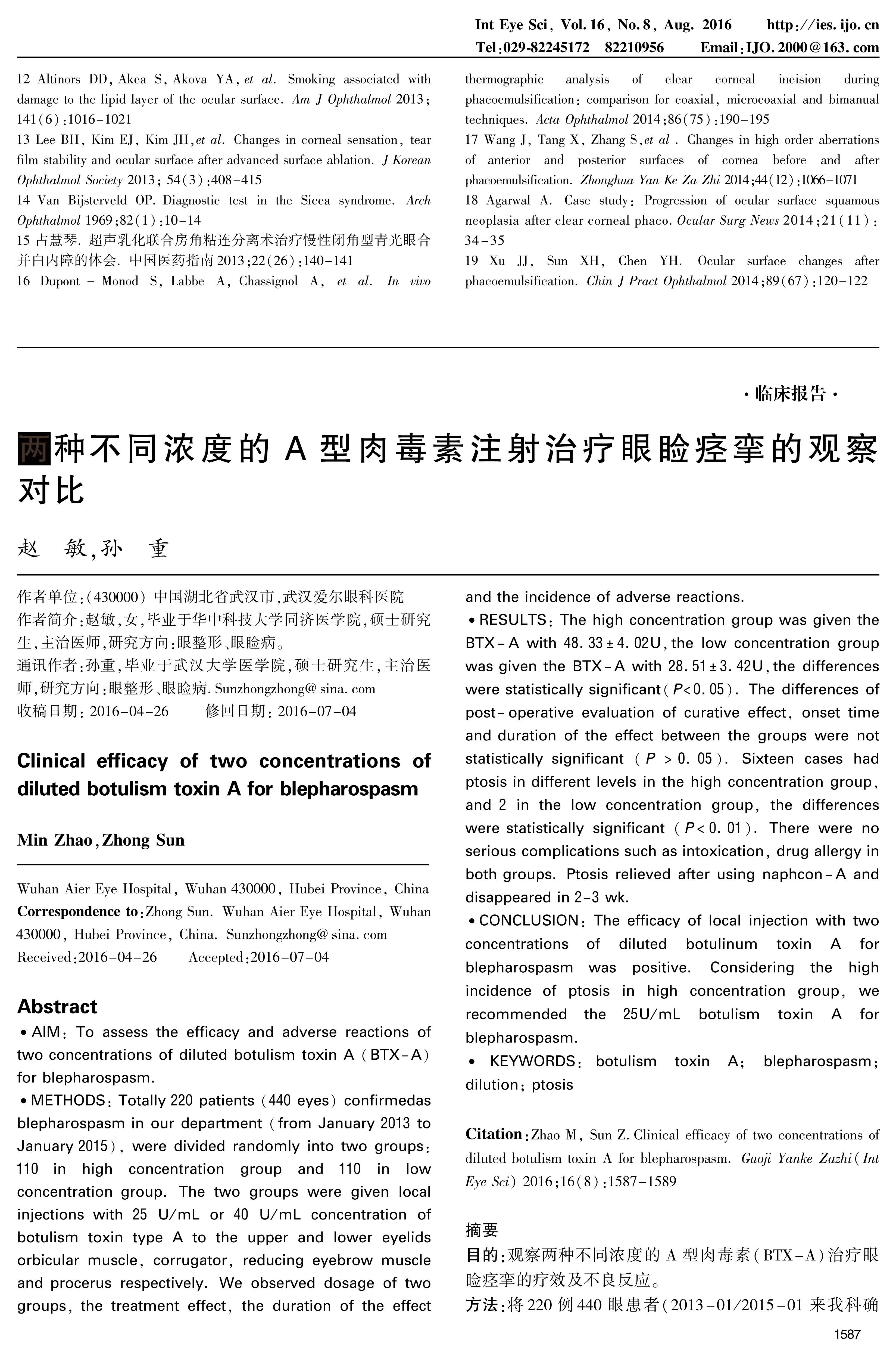 CONCLUSION: The efficacy of local injection with two concentrations of diluted botulinum toxin A for blepharospasm was positive. Considering the high incidence of ptosis in high concentration group, we recommended the 25U/mL botulism toxin A for blepharospasm.