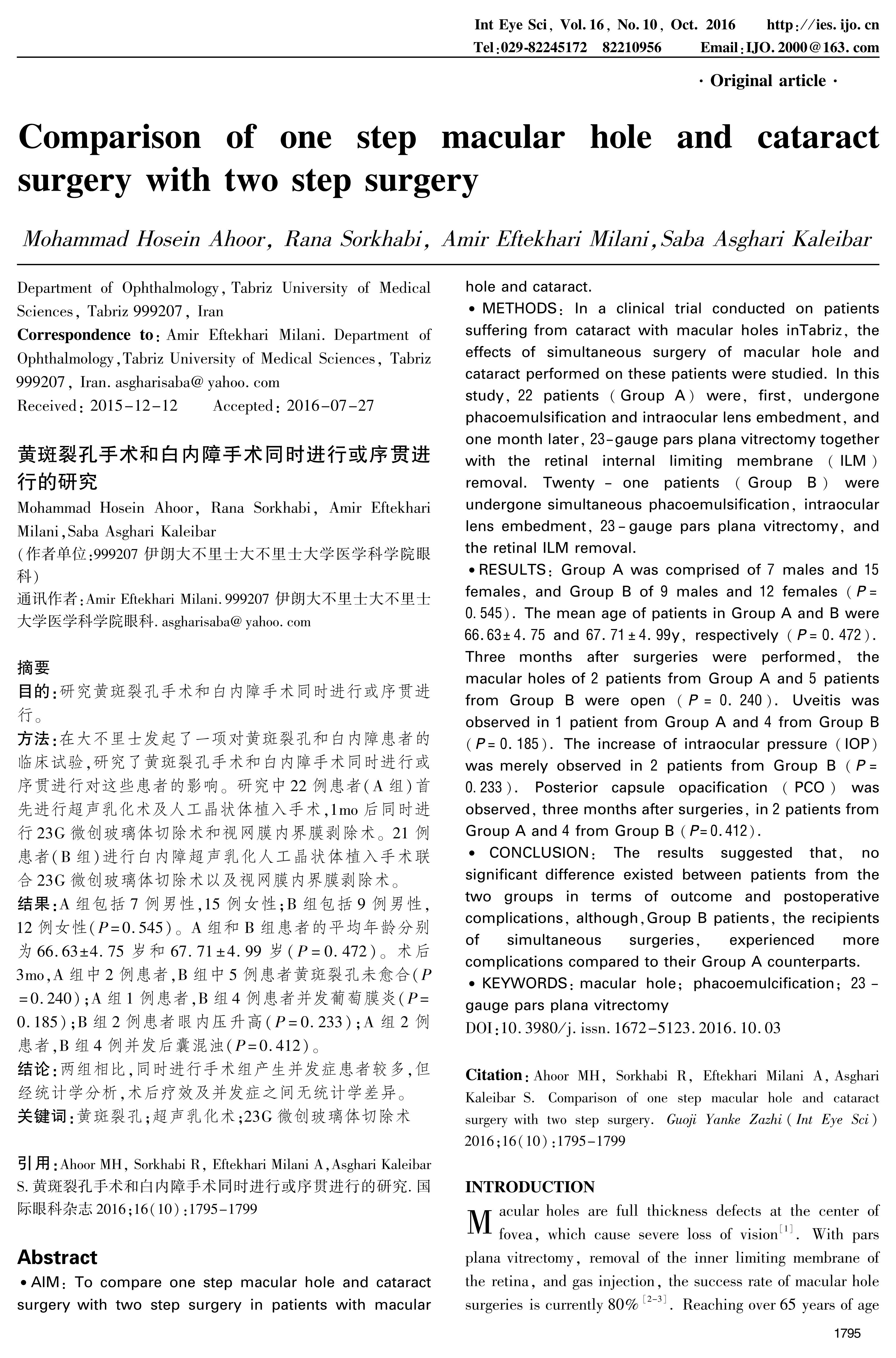 方法:在大不里士发起了一项对黄斑裂孔和白内障患者的临床试验,研究了黄斑裂孔手术和白内障手术同时进行或序贯进行对这些患者的影响。研究中22例患者(A组)首先进行超声乳化术及人工晶状体植入手术,1mo后同时进行23G微创玻璃体切除术和视网膜内界膜剥除术。21例患者(B组)进行白内障超声乳化人工晶状体植入手术联合23G微创玻璃体切除术以及视网膜内界膜剥除术。