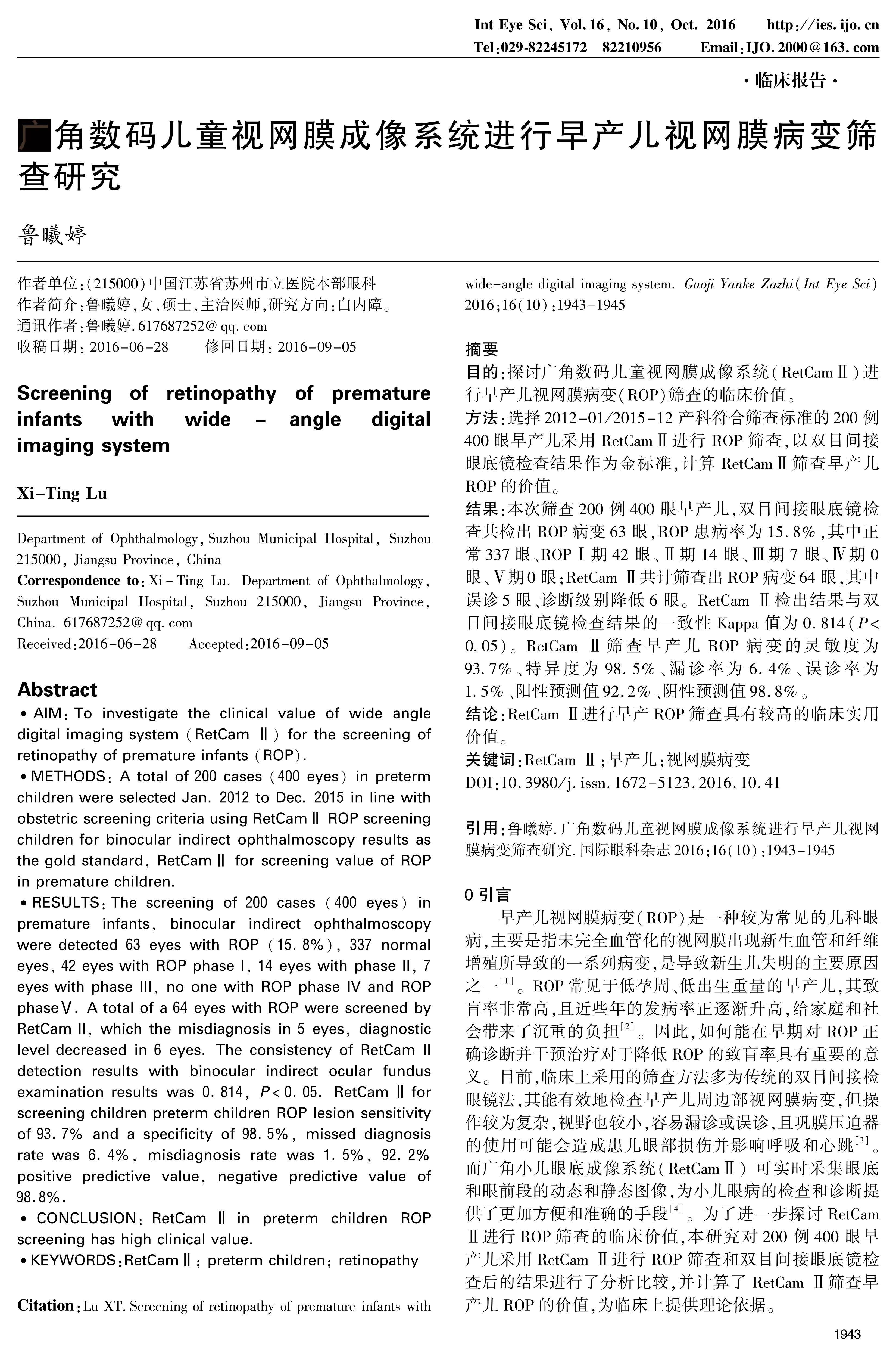 RESULTS:The screening of 200 cases(400 eyes)in premature infants, binocular indirect ophthalmoscopy were detected 63 eyes with ROP(15.8%), 337 normal eyes, 42 eyes with ROP phase I, 14 eyes with phase II, 7 eyes with phase III, no one with ROP phase IV and ROP phaseⅤ. A total of a 64 eyes with ROP were screened by RetCam II, which the misdiagnosis in 5 eyes, diagnostic level decreased in 6 eyes. The consistency of RetCam II detection results with binocular indirect ocular fundus examination results was 0.814, P<0.05. RetCamⅡfor screening children preterm children ROP lesion sensitivity of 93.7% and a specificity of 98.5%, missed diagnosis rate was 6.4%, misdiagnosis rate was 1.5%, 92.2% positive predictive value, negative predictive value of 98.8%.