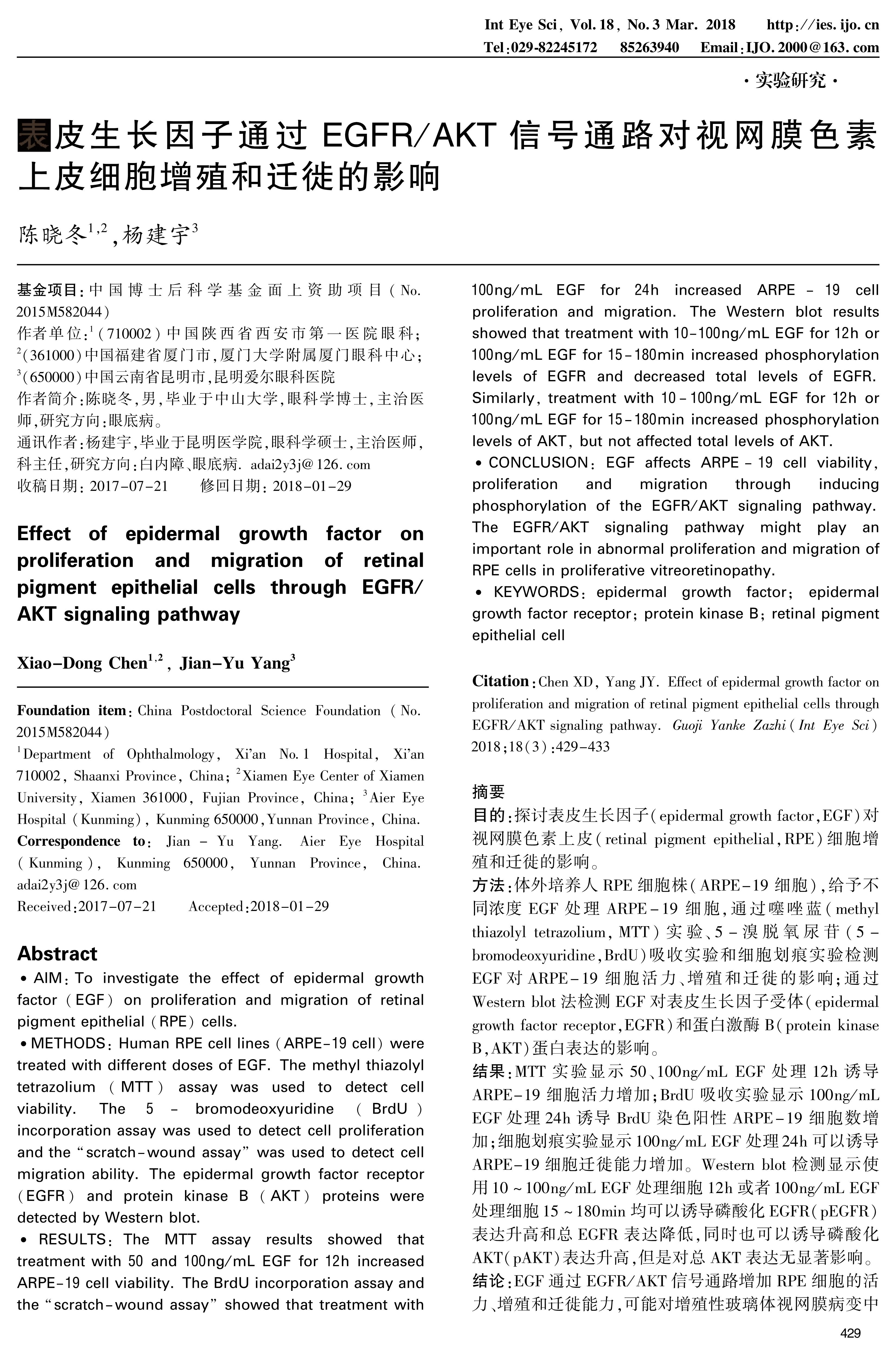 RESULTS:The MTT assay results showed that treatment with 50 and 100ng/mL EGF for 12h increased ARPE-19 cell viability. The BrdU incorporation assay and the “scratch-wound assay” showed that treatment with 100ng/mL EGF for 24h increased ARPE-19 cell proliferation and migration. The Western blot results showed that treatment with 10-100ng/mL EGF for 12h or 100ng/mL EGF for 15-180min increased phosphorylation levels of EGFR and decreased total levels of EGFR. Similarly, treatment with 10-100ng/mL EGF for 12h or 100ng/mL EGF for 15-180min increased phosphorylation levels of AKT, but not affected total levels of AKT.
