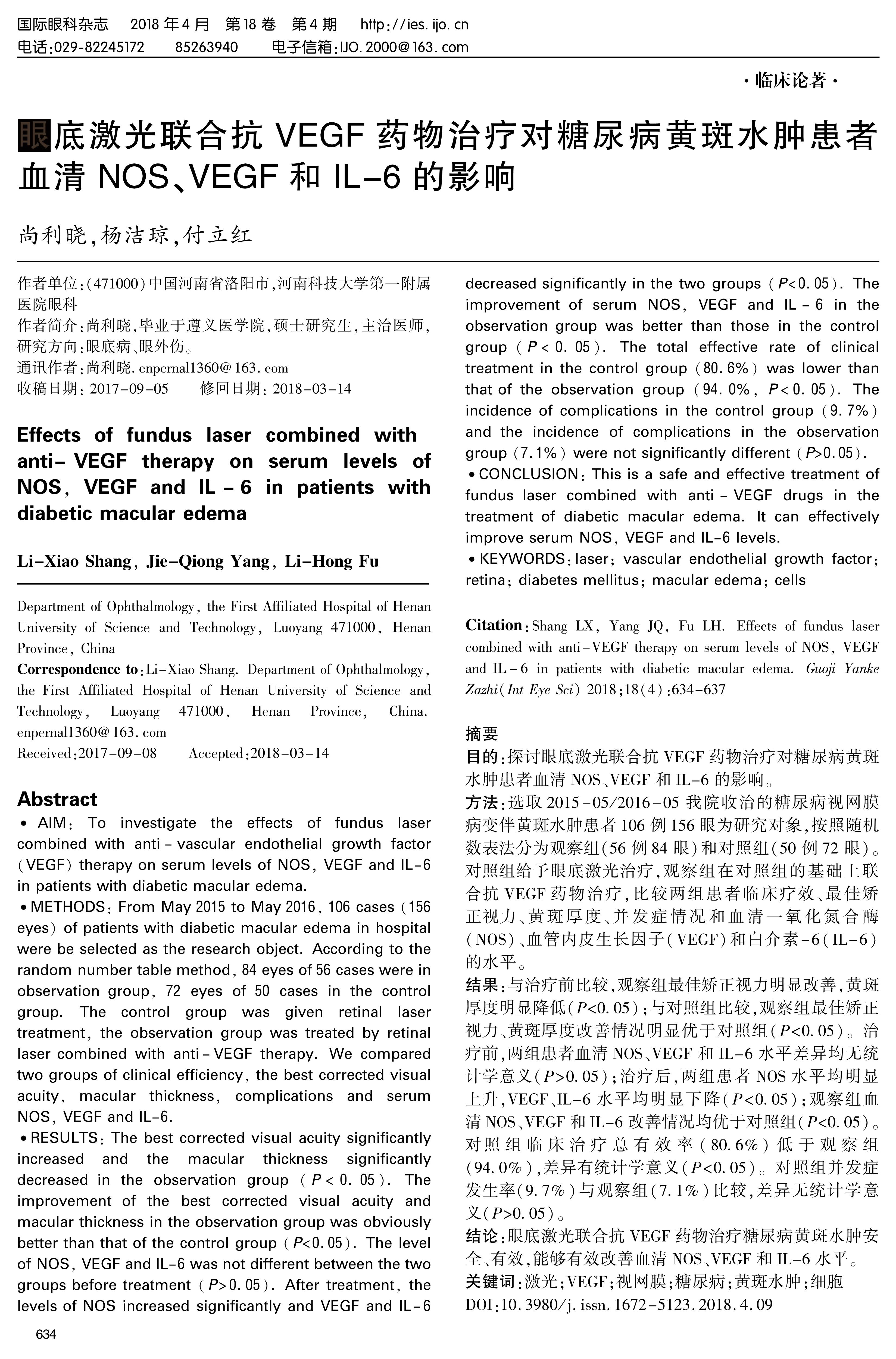 结论:眼底激光联合抗VEGF药物治疗糖尿病黄斑水肿安全、有效,能够有效改善血清NOS、VEGF和IL-6水平。