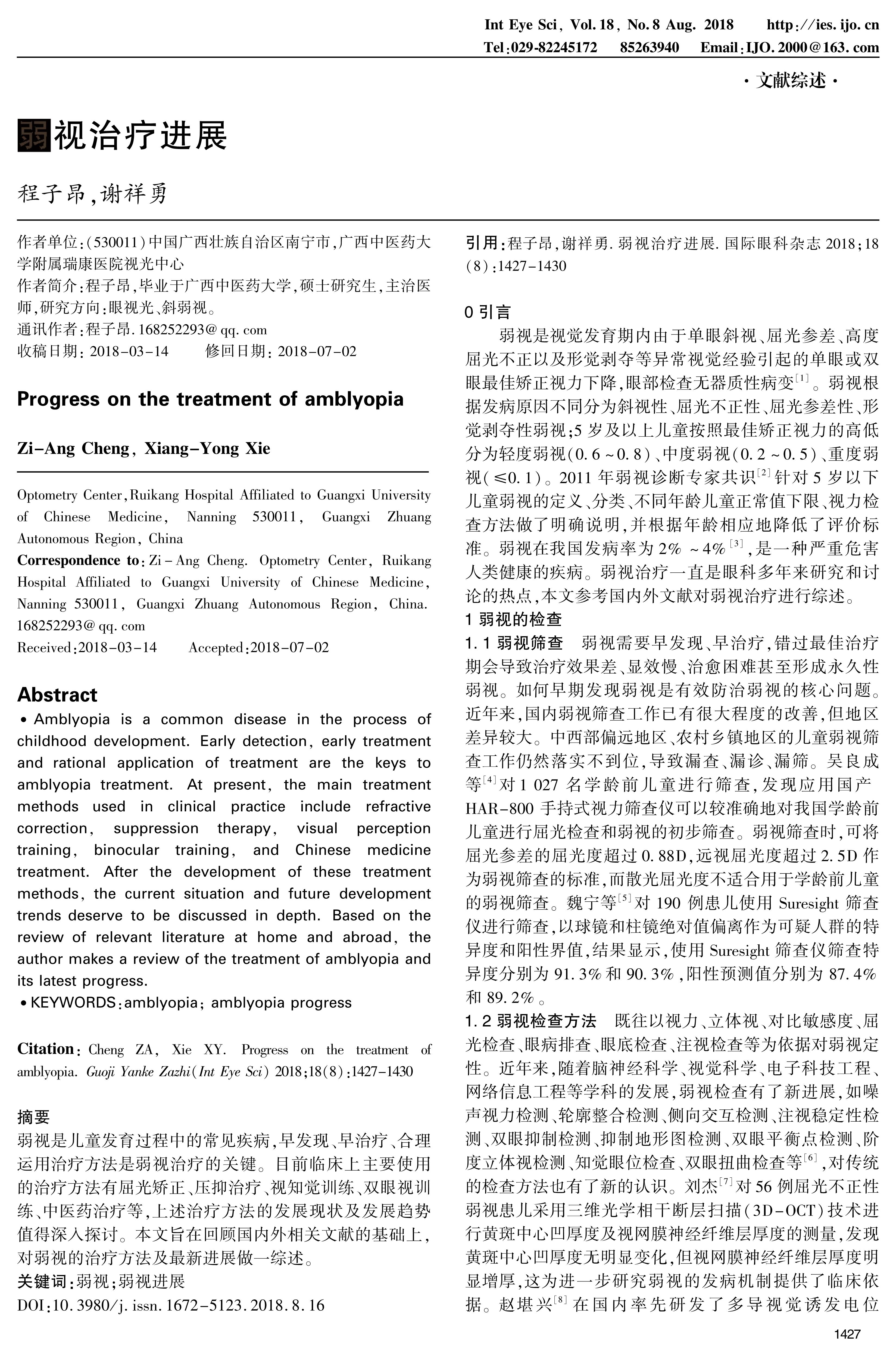弱视是儿童发育过程中的常见疾病,早发现、早治疗、合理运用治疗方法是弱视治疗的关键。目前临床上主要使用的治疗方法有屈光矫正、压抑治疗、视知觉训练、双眼视训练、中医药治疗等,上述治疗方法的发展现状及发展趋势值得深入探讨。本文旨在回顾国内外相关文献的基础上,对弱视的治疗方法及最新进展做一综述。