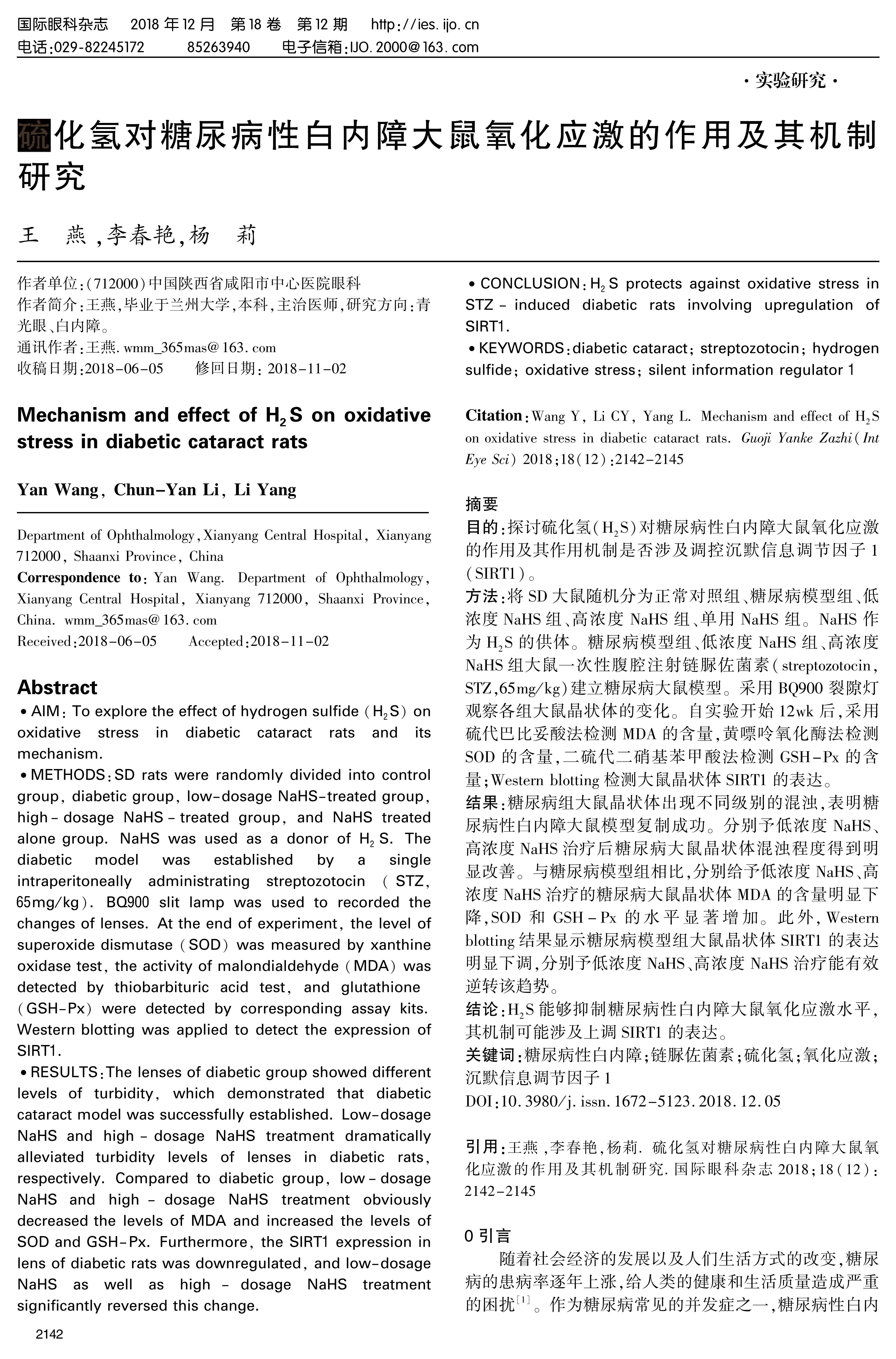 结论:H2S能够抑制糖尿病性白内障大鼠氧化应激水平,其机制可能涉及上调SIRT1的表达。