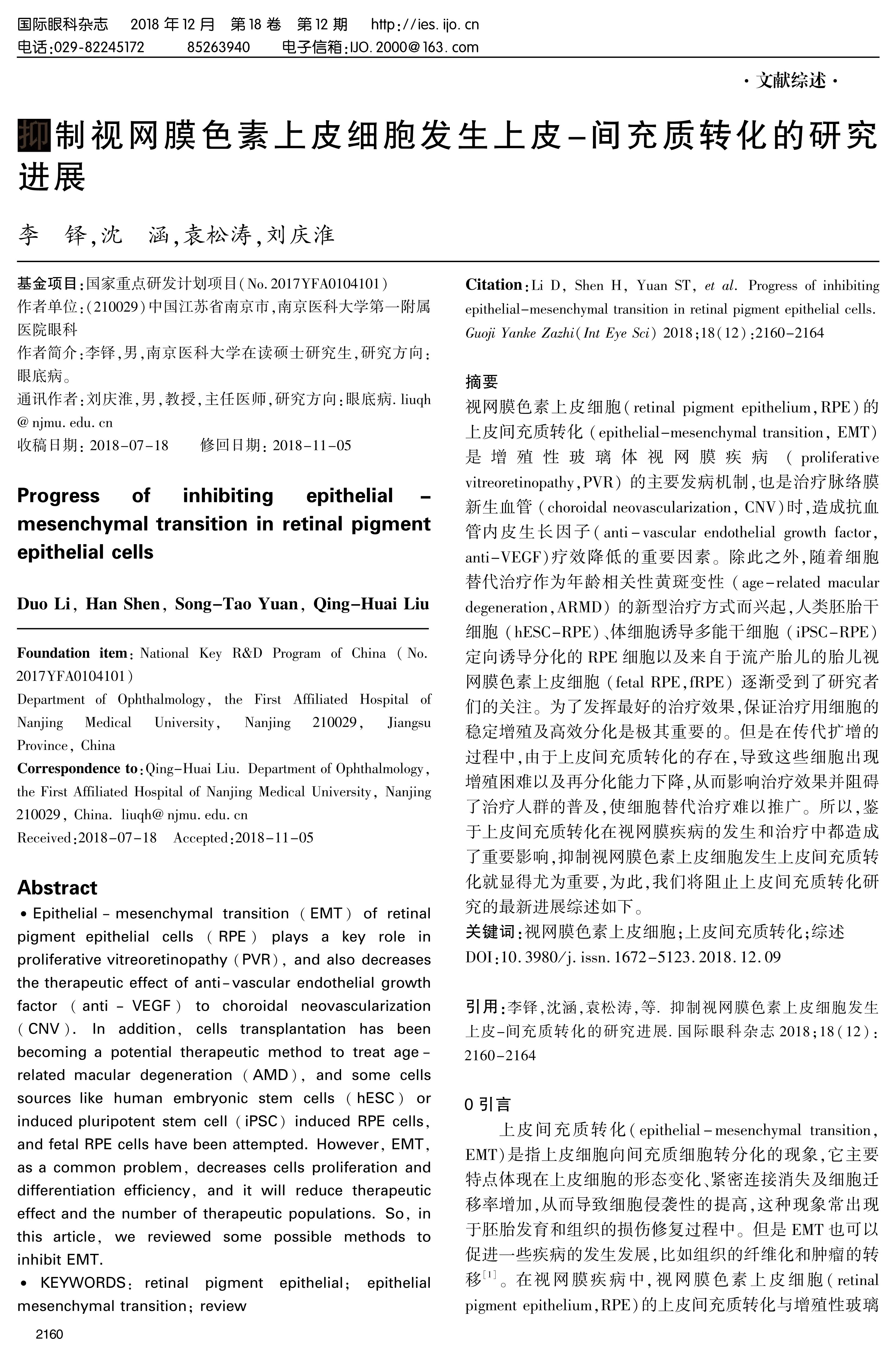 视网膜色素上皮细胞(retinal pigment epithelium,RPE)的上皮间充质转化(epithelial-mesenchymal transition, EMT)是增殖性玻璃体视网膜疾病(proliferative vitreoretinopathy,PVR)的主要发病机制,也是治疗脉络膜新生血管(choroidal neovascularization, CNV)时,造成抗血管内皮生长因子(anti-vascular endothelial growth factor, anti-VEGF)疗效降低的重要因素。除此之外,随着细胞替代治疗作为年龄相关性黄斑变性(age-related macular degeneration,ARMD)的新型治疗方式而兴起,人类胚胎干细胞(hESC-RPE)、体细胞诱导多能干细胞(iPSC-RPE)定向诱导分化的RPE细胞以及来自于流产胎儿的胎儿视网膜色素上皮细胞(fetal RPE,fRPE)逐渐受到了研究者们的关注。为了发挥最好的治疗效果,保证治疗用细胞的稳定增殖及高效分化是极其重要的。但是在传代扩增的过程中,由于上皮间充质转化的存在,导致这些细胞出现增殖困难以及再分化能力下降,从而影响治疗效果并阻碍了治疗人群的普及,使细胞替代治疗难以推广。所以,鉴于上皮间充质转化在视网膜疾病的发生和治疗中都造成了重要影响,抑制视网膜色素上皮细胞发生上皮间充质转化就显得尤为重要,为此,我们将阻止上皮间充质转化研究的最新进展综述如下。