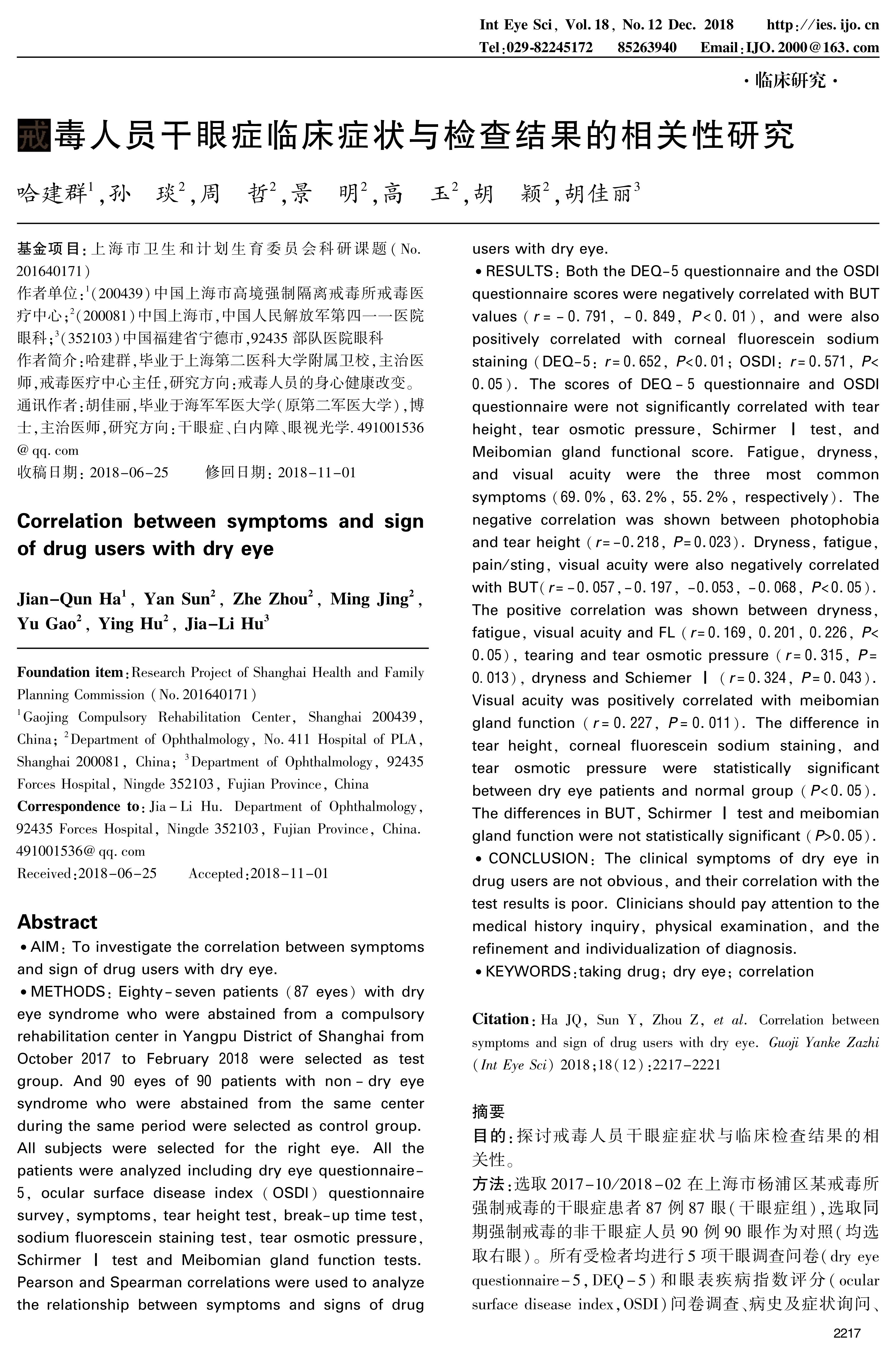 METHODS: Eighty-seven patients(87 eyes)with dry eye syndrome who were abstained from a compulsory rehabilitation center in Yangpu District of Shanghai from October 2017 to February 2018 were selected as test group. And 90 eyes of 90 patients with non-dry eye syndrome who were abstained from the same center during the same period were selected as control group. All subjects were selected for the right eye. All the patients were analyzed including dry eye questionnaire-5, ocular surface disease index(OSDI)questionnaire survey, symptoms, tear height test, break-up time test, sodium fluorescein staining test, tear osmotic pressure, Schirmer Ⅰ test and Meibomian gland function tests. Pearson and Spearman correlations were used to analyze the relationship between symptoms and signs of drug users with dry eye.