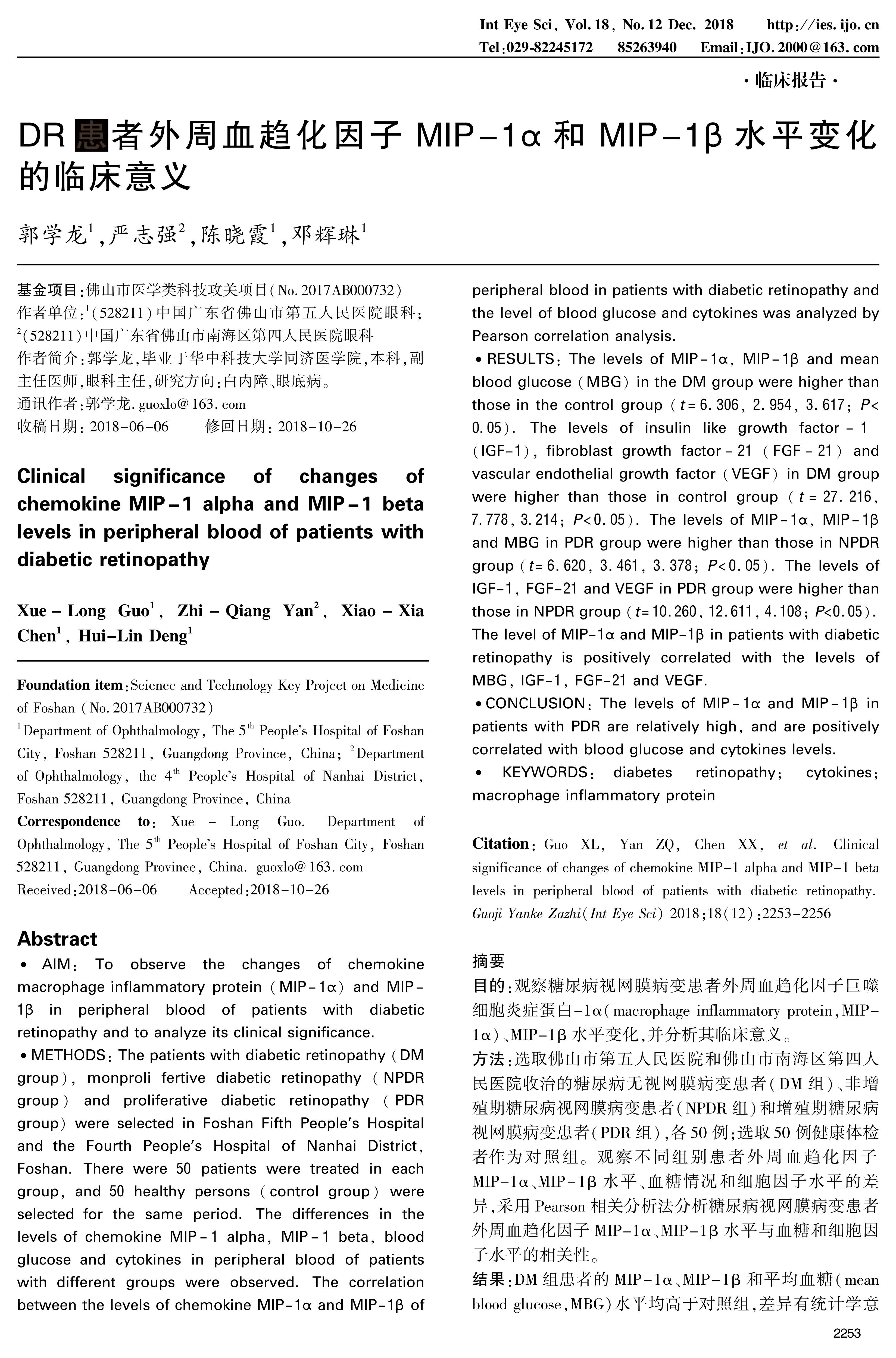 AIM: To observe the changes of chemokine macrophage inflammatory protein(MIP-1α)and MIP-1β in peripheral blood of patients with diabetic retinopathy and to analyze its clinical significance.