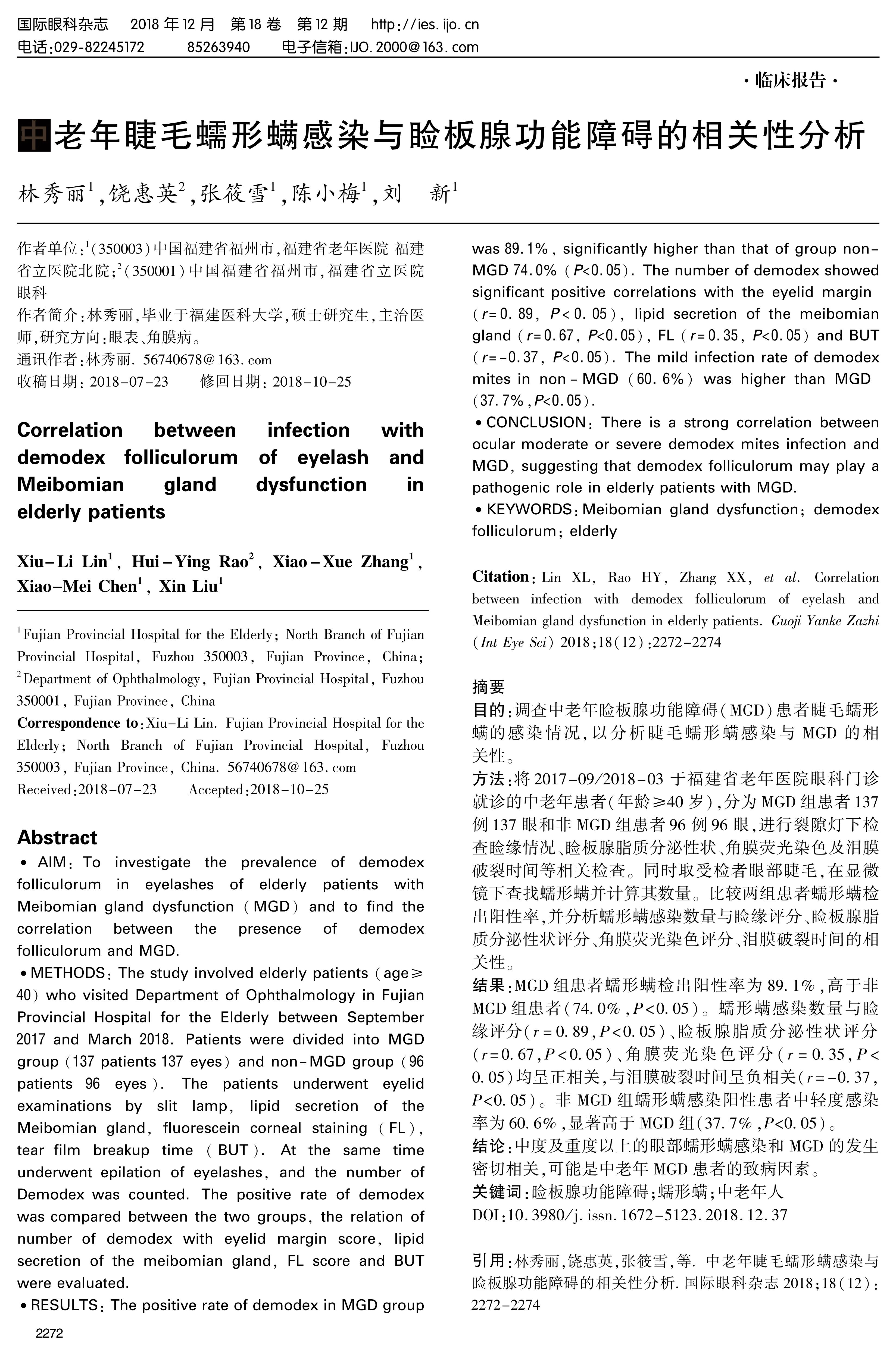 RESULTS: The positive rate of demodex in MGD group was 89.1%, significantly higher than that of group non-MGD 74.0%(P<0.05). The number of demodex showed significant positive correlations with the eyelid margin(r=0.89, P<0.05), lipid secretion of the meibomian gland(r=0.67, P<0.05), FL(r=0.35, P<0.05)and BUT(r=-0.37, P<0.05). The mild infection rate of demodex mites in non-MGD(60.6%)was higher than MGD(37.7%, P<0.05).