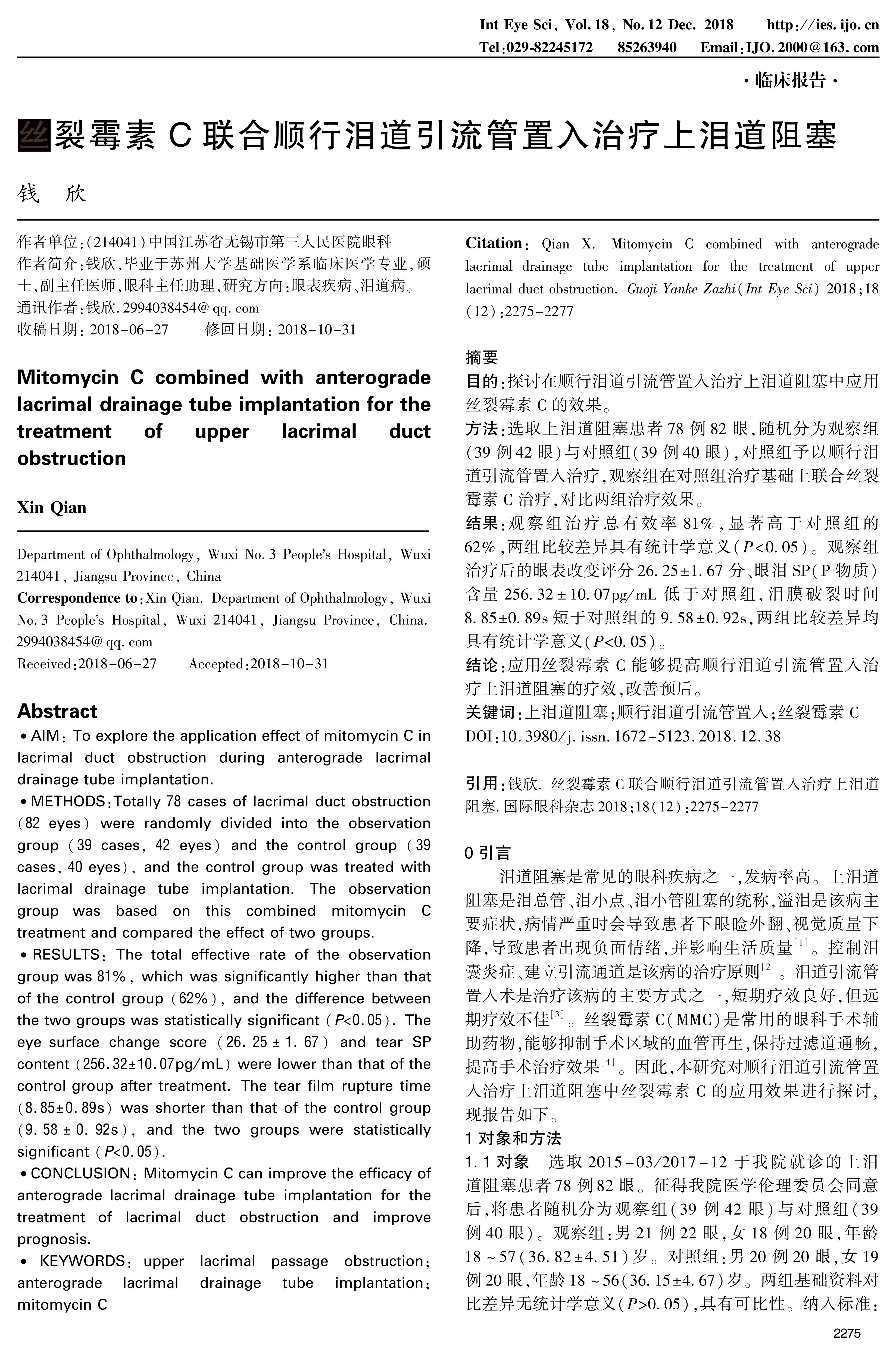 CONCLUSION: Mitomycin C can improve the efficacy of anterograde lacrimal drainage tube implantation for the treatment of lacrimal duct obstruction and improve prognosis.