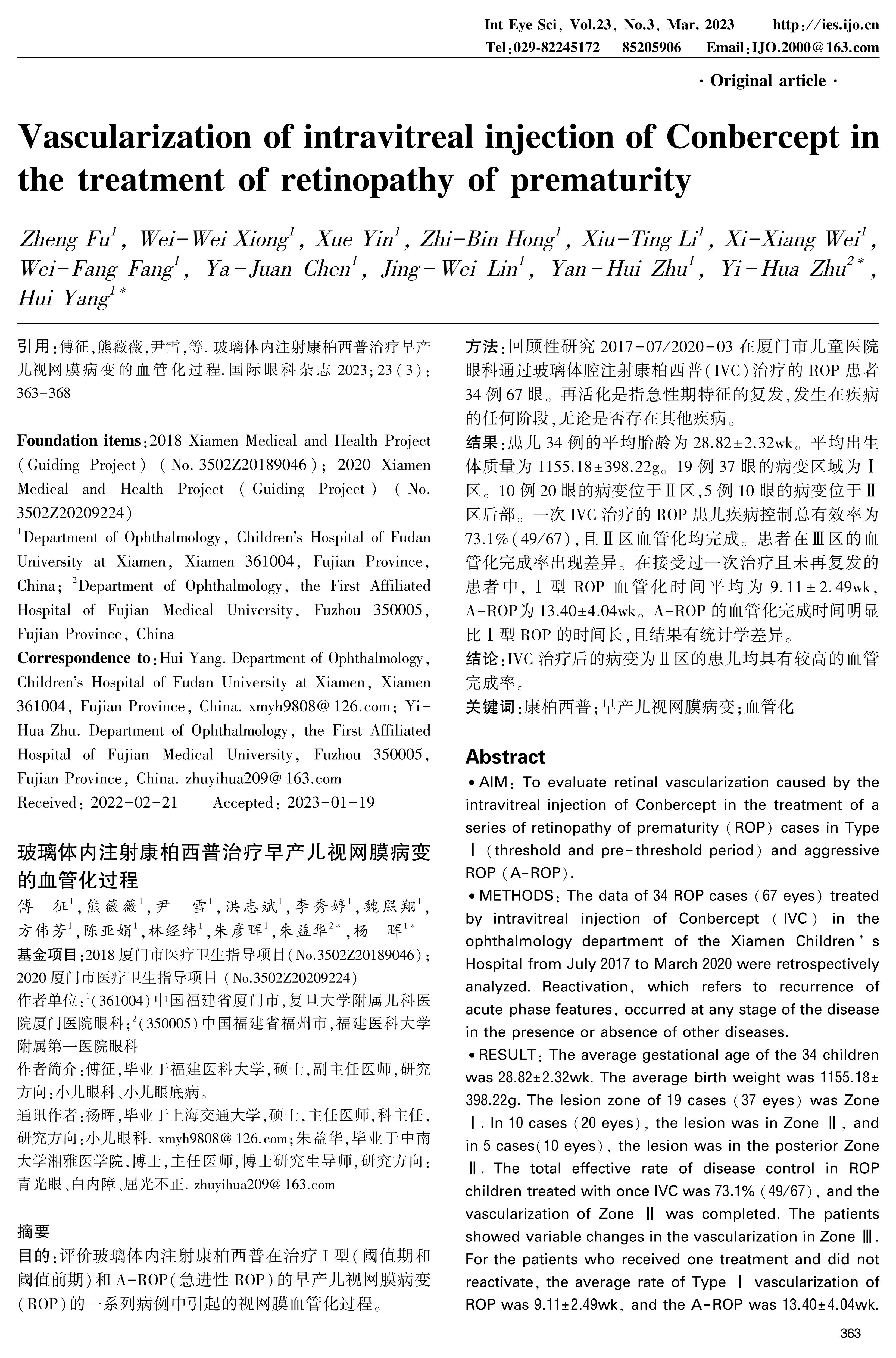 AIM: To evaluate retinal vascularization caused by the intravitreal injection of Conbercept in the treatment of a series of retinopathy of prematurity(ROP)cases in Type Ⅰ(threshold and pre-threshold period)and aggressive ROP(A-ROP).METHODS: The data of 34 ROP cases(67 eyes)treated by intravitreal injection of Conbercept(IVC)in the ophthalmology department of the Xiamen Children's Hospital from July 2017 to March 2020 were retrospectively analyzed. Reactivation, which refers to recurrence of acute phase features, occurred at any stage of the disease in the presence or absence of other diseases. RESULT: The average gestational age of the 34 children was 28.82±2.32wk. The average birth weight was 1155.18±398.22g. The lesion zone of 19 cases(37 eyes)was Zone Ⅰ. In 10 cases(20 eyes), the lesion was in Zone Ⅱ, and in 5 cases(10 eyes), the lesion was in the posterior Zone Ⅱ. The total effective rate of disease control in ROP children treated with once IVC was 73.1%(49/67), and the vascularization of Zone Ⅱ was completed. The patients showed variable changes in the vascularization in Zone Ⅲ. For the patients who received one treatment and did not reactivate, the average rate of Type Ⅰ vascularization of ROP was 9.11±2.49wk, and the A-ROP was 13.40±4.04wk. The rate of A-ROP vascularization in Zone Ⅱ was significantly longer compared to Type Ⅰ.CONCLUSION: IVC effectively completes vascularization in Zone Ⅱ.