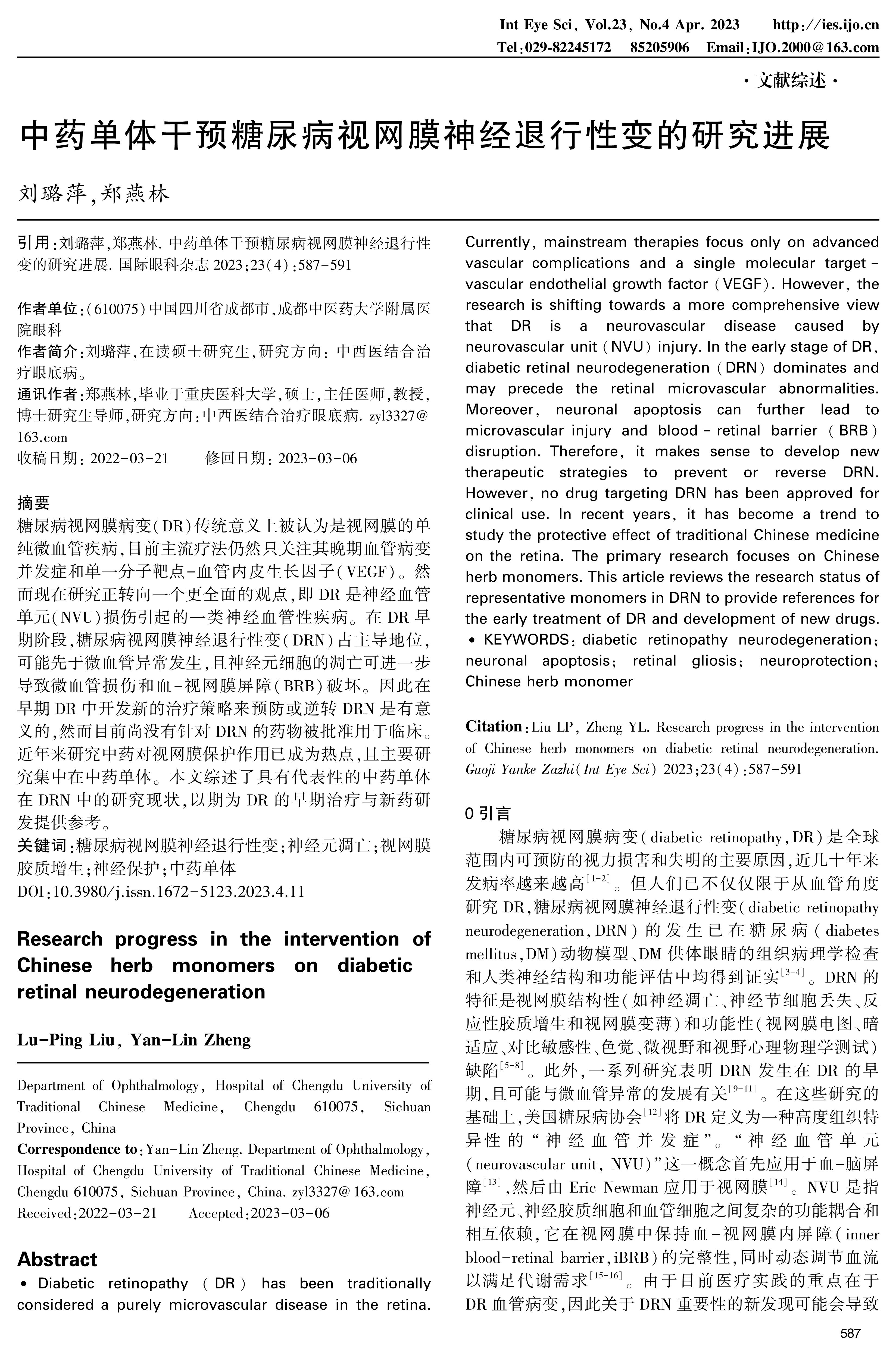 糖尿病视网膜病变(DR)传统意义上被认为是视网膜的单纯微血管疾病,目前主流疗法仍然只关注其晚期血管病变并发症和单一分子靶点-血管内皮生长因子(VEGF)。然而现在研究正转向一个更全面的观点,即DR是神经血管单元(NVU)损伤引起的一类神经血管性疾病。在DR早期阶段,糖尿病视网膜神经退行性变(DRN)占主导地位,可能先于微血管异常发生,且神经元细胞的凋亡可进一步导致微血管损伤和血-视网膜屏障(BRB)破坏。因此在早期DR中开发新的治疗策略来预防或逆转DRN是有意义的,然而目前尚没有针对DRN的药物被批准用于临床。近年来研究中药对视网膜保护作用已成为热点,且主要研究集中在中药单体。本文综述了具有代表性的中药单体在DRN中的研究现状,以期为DR的早期治疗与新药研发提供参考。