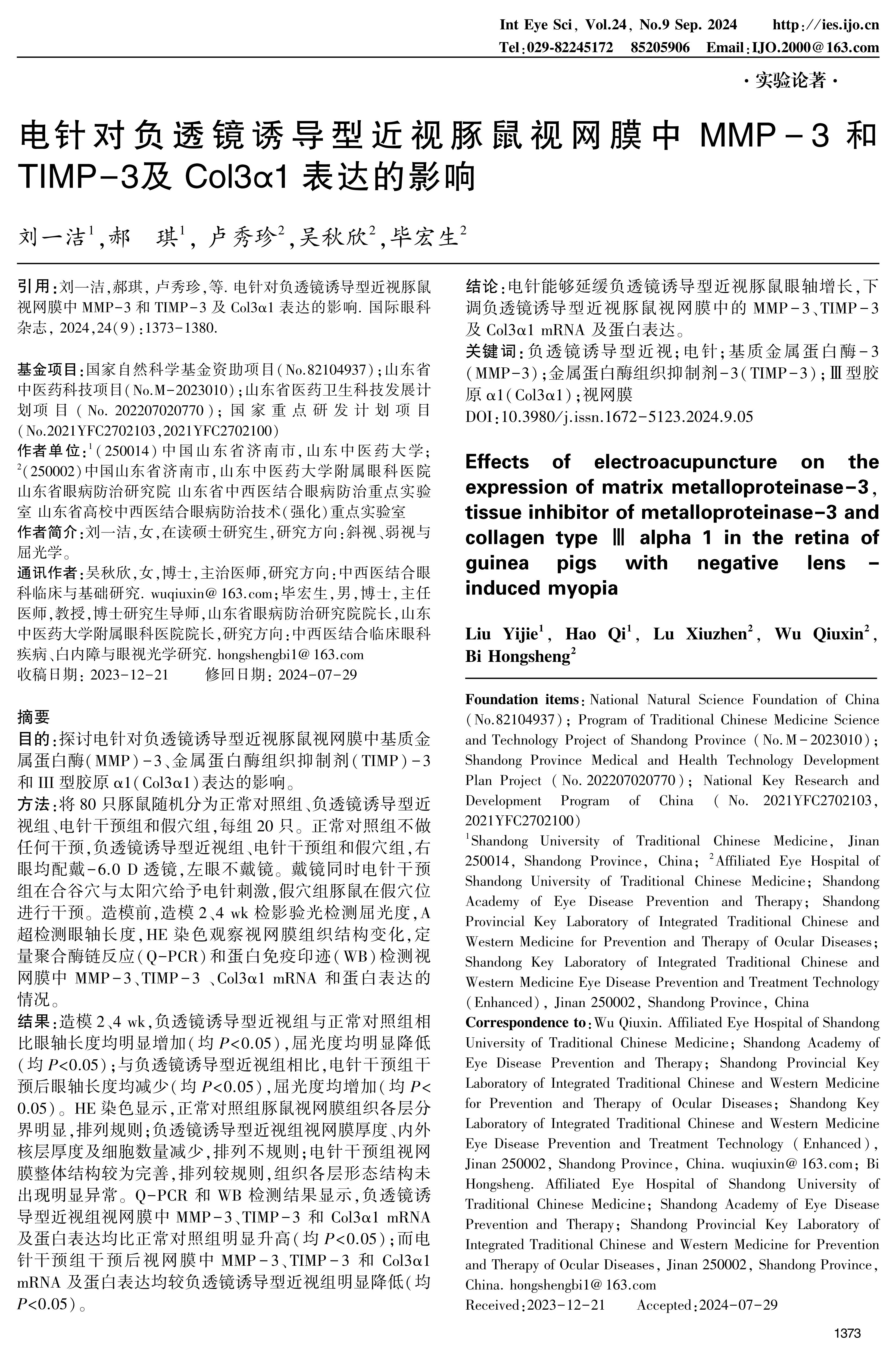 METHODS:A total of 80 guinea pigs were randomly divided into the normal control(NC)group, negative lens-induced myopia(LIM)group, electro-acupuncture(EA)group, and sham group, with 20 guinea pigs in each group. The NC group did not receive any intervention, the LIM, EA and the sham groups were all wearing -6.0 D lens in the right eye and no lens in the left eye. The EA group was given electroacupuncture stimulation at Hegu Point and temple, and guinea pigs in the sham group were given intervention at false points. The refraction was measured by optometry, the axial length was measured by A-ultrasound, and the changes in retinal tissue structure were observed by HE staining. Quantitative polymerase chain reaction(Q-PCR)and western blot(WB)were used to detect the expression of MMP-3, TIMP-3, and Col3α1 at mRNA and protein levels before modeling and at 2 and 4 wk after modeling.