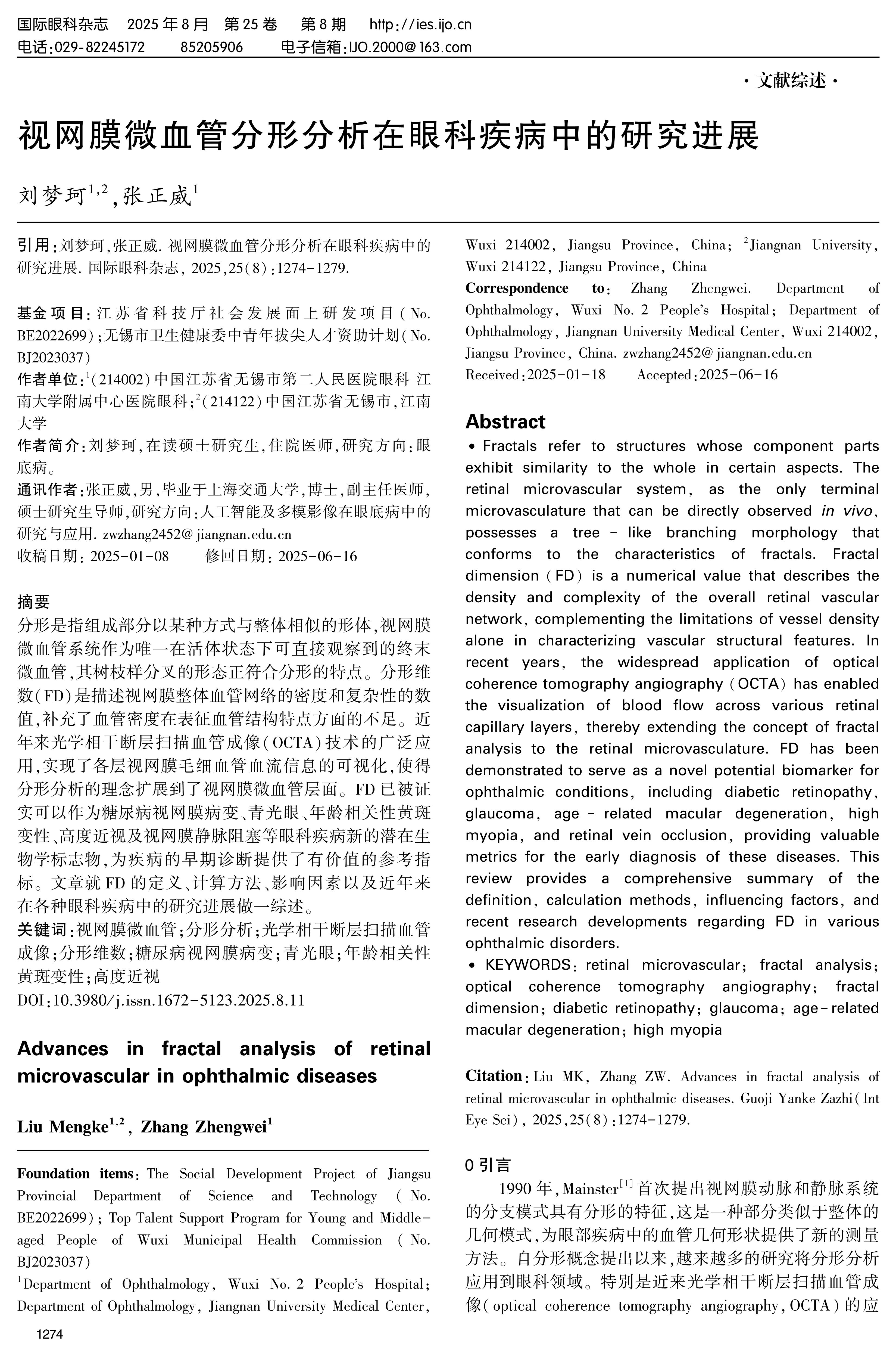 分形是指组成部分以某种方式与整体相似的形体,视网膜微血管系统作为唯一在活体状态下可直接观察到的终末微血管,其树枝样分叉的形态正符合分形的特点。分形维数(FD)是描述视网膜整体血管网络的密度和复杂性的数值,补充了血管密度在表征血管结构特点方面的不足。近年来光学相干断层扫描血管成像(OCTA)技术的广泛应用,实现了各层视网膜毛细血管血流信息的可视化,使得分形分析的理念扩展到了视网膜微血管层面。FD已被证实可以作为糖尿病视网膜病变、青光眼、年龄相关性黄斑变性、高度近视及视网膜静脉阻塞等眼科疾病新的潜在生物学标志物,为疾病的早期诊断提供了有价值的参考指标。文章就FD的定义、计算方法、影响因素以及近年来在各种眼科疾病中的研究进展做一综述。