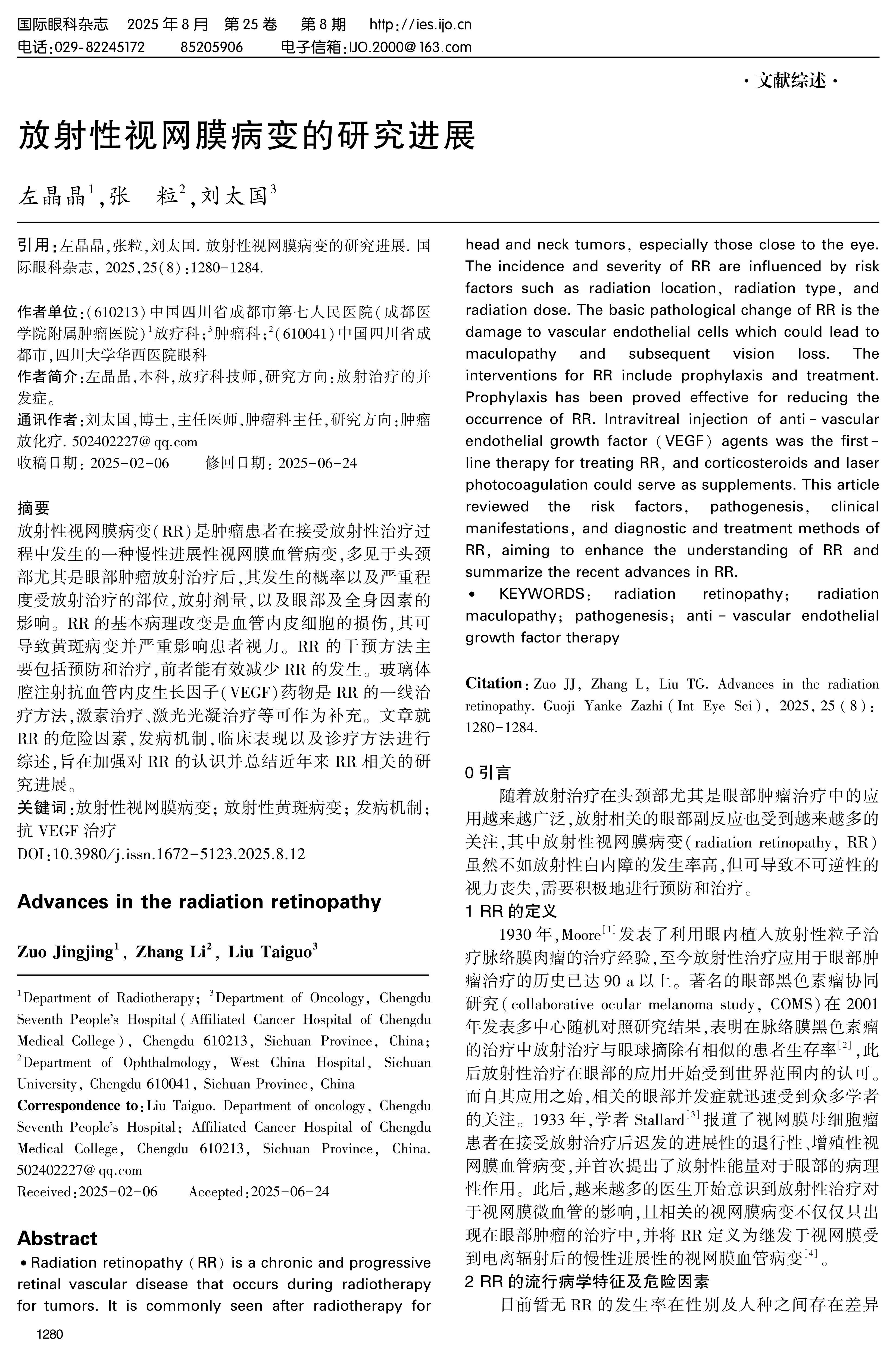 放射性视网膜病变(RR)是肿瘤患者在接受放射性治疗过程中发生的一种慢性进展性视网膜血管病变,多见于头颈部尤其是眼部肿瘤放射治疗后,其发生的概率以及严重程度受放射治疗的部位,放射剂量,以及眼部及全身因素的影响。RR的基本病理改变是血管内皮细胞的损伤,其可导致黄斑病变并严重影响患者视力。RR的干预方法主要包括预防和治疗,前者能有效减少RR的发生。玻璃体腔注射抗血管内皮生长因子(VEGF)药物是RR的一线治疗方法,激素治疗、激光光凝治疗等可作为补充。文章就RR的危险因素,发病机制,临床表现以及诊疗方法进行综述,旨在加强对RR的认识并总结近年来RR相关的研究进展。