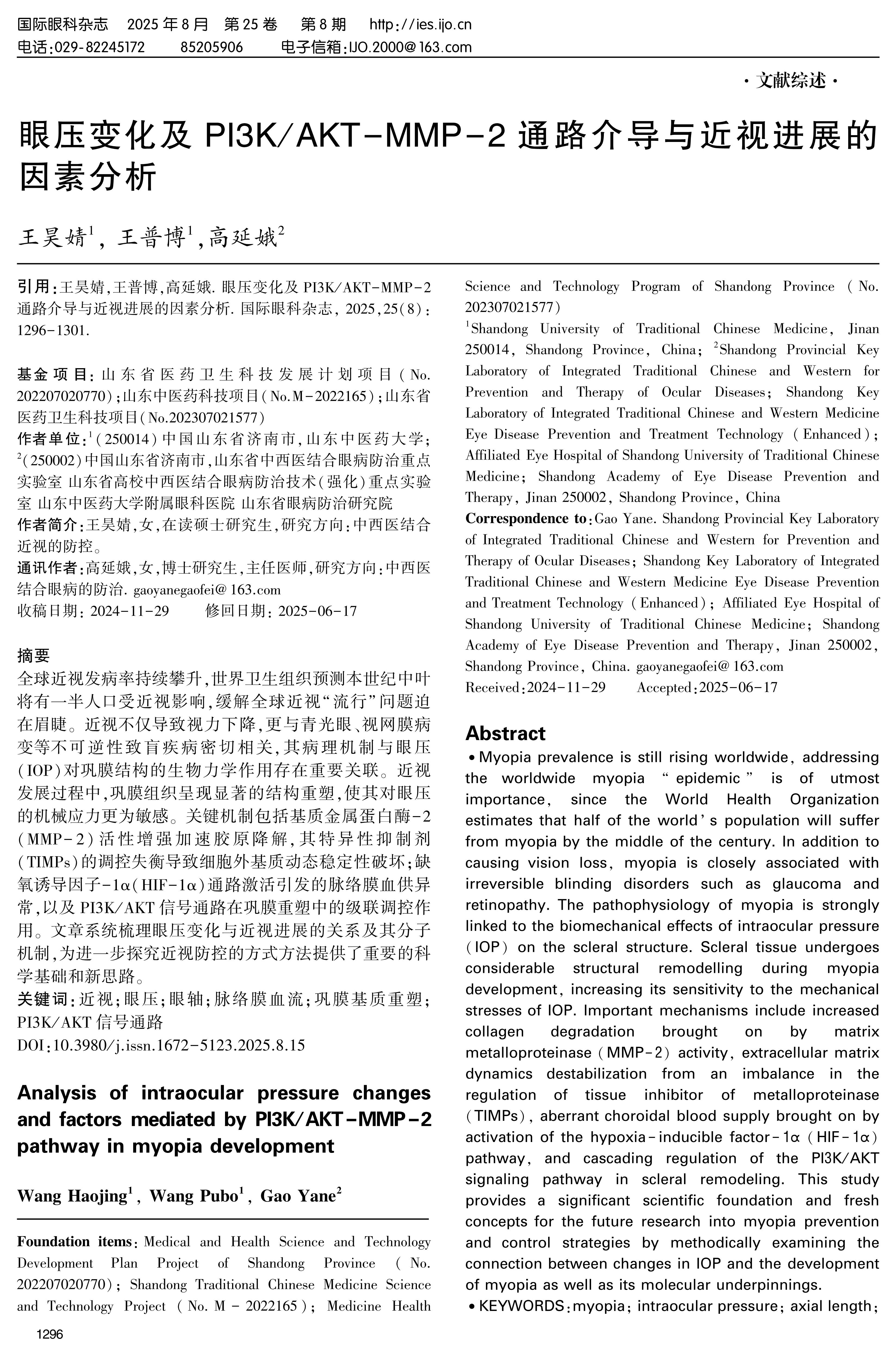 全球近视发病率持续攀升,世界卫生组织预测本世纪中叶将有一半人口受近视影响,缓解全球近视“流行”问题迫在眉睫。近视不仅导致视力下降,更与青光眼、视网膜病变等不可逆性致盲疾病密切相关,其病理机制与眼压(IOP)对巩膜结构的生物力学作用存在重要关联。近视发展过程中,巩膜组织呈现显著的结构重塑,使其对眼压的机械应力更为敏感。关键机制包括基质金属蛋白酶-2(MMP-2)活性增强加速胶原降解,其特异性抑制剂(TIMPs)的调控失衡导致细胞外基质动态稳定性破坏; 缺氧诱导因子-1α(HIF-1α)通路激活引发的脉络膜血供异常,以及PI3K/AKT信号通路在巩膜重塑中的级联调控作用。文章系统梳理眼压变化与近视进展的关系及其分子机制,为进一步探究近视防控的方式方法提供了重要的科学基础和新思路。