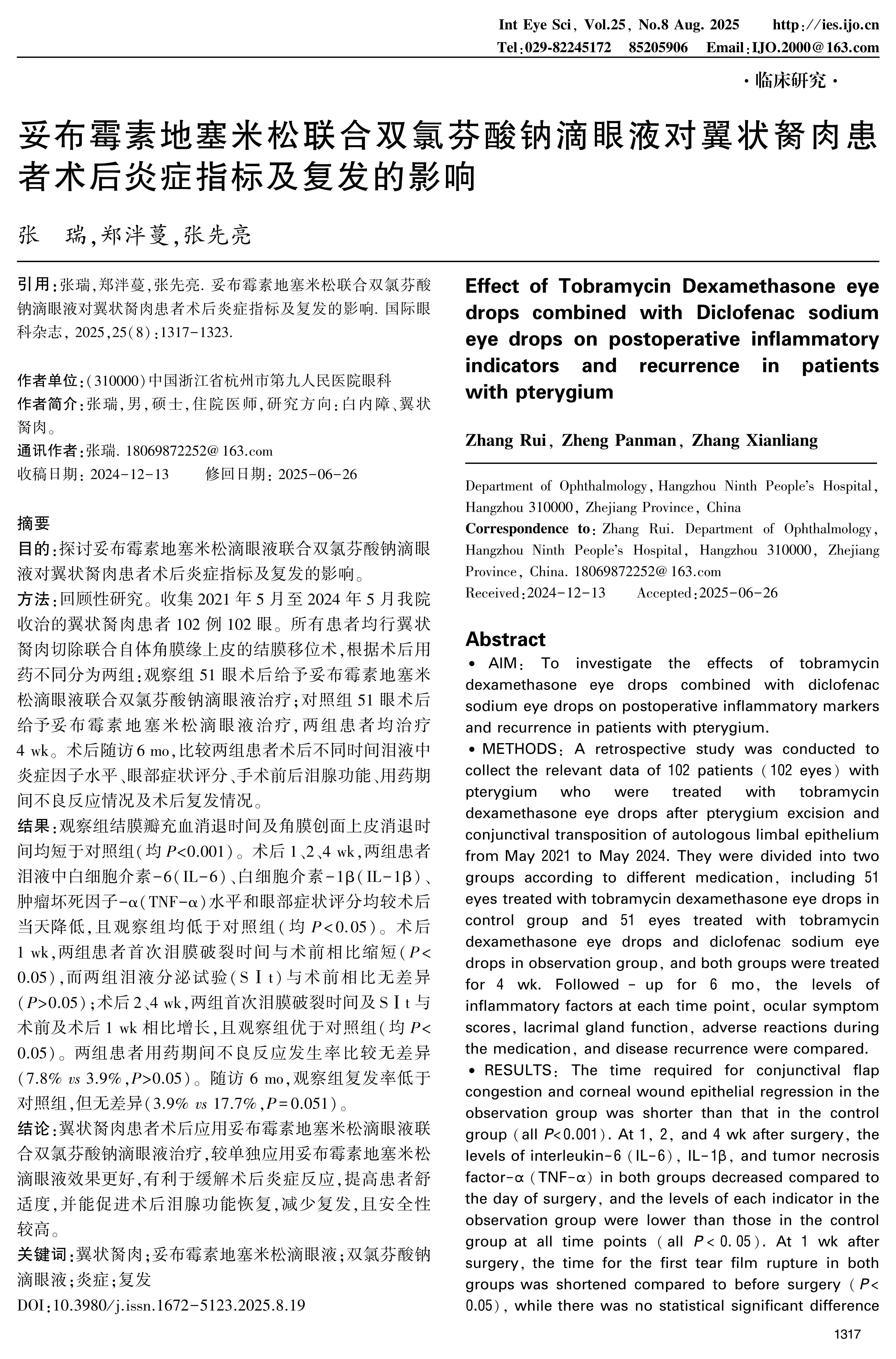 METHODS: A retrospective study was conducted to collect the relevant data of 102 patients(102 eyes)with pterygium who were treated with tobramycin dexamethasone eye drops after pterygium excision and conjunctival transposition of autologous limbal epithelium from May 2021 to May 2024. They were divided into two groups according to different medication, including 51 eyes treated with tobramycin dexamethasone eye drops in control group and 51 eyes treated with tobramycin dexamethasone eye drops and diclofenac sodium eye drops in observation group, and both groups were treated for 4 wk. Followed-up for 6 mo, the levels of inflammatory factors at each time point, ocular symptom scores, lacrimal gland function, adverse reactions during the medication, and disease recurrence were compared.