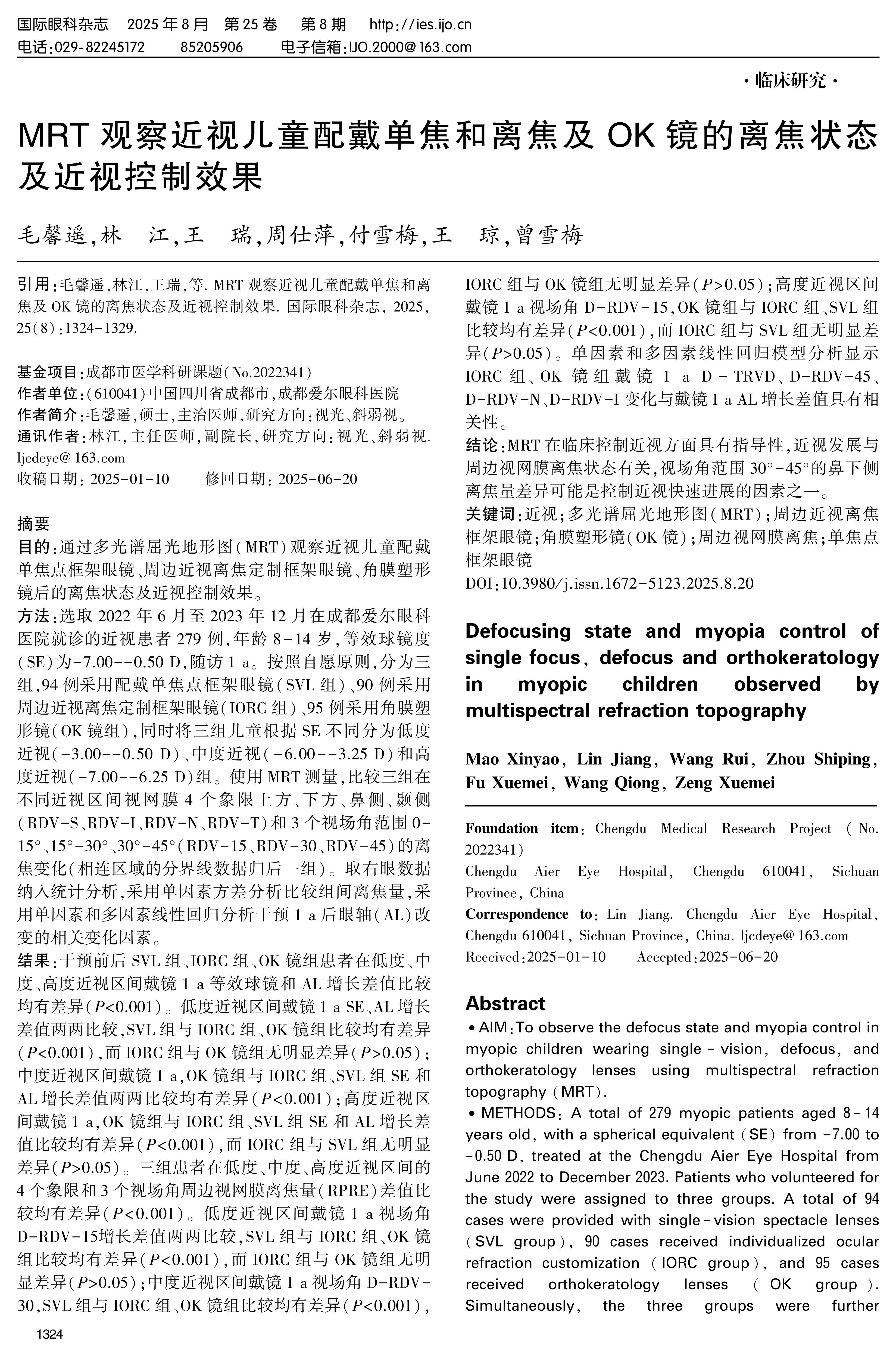 结论:MRT在临床控制近视方面具有指导性,近视发展与周边视网膜离焦状态有关,视场角范围30°-45°的鼻下侧离焦量差异可能是控制近视快速进展的因素之一。