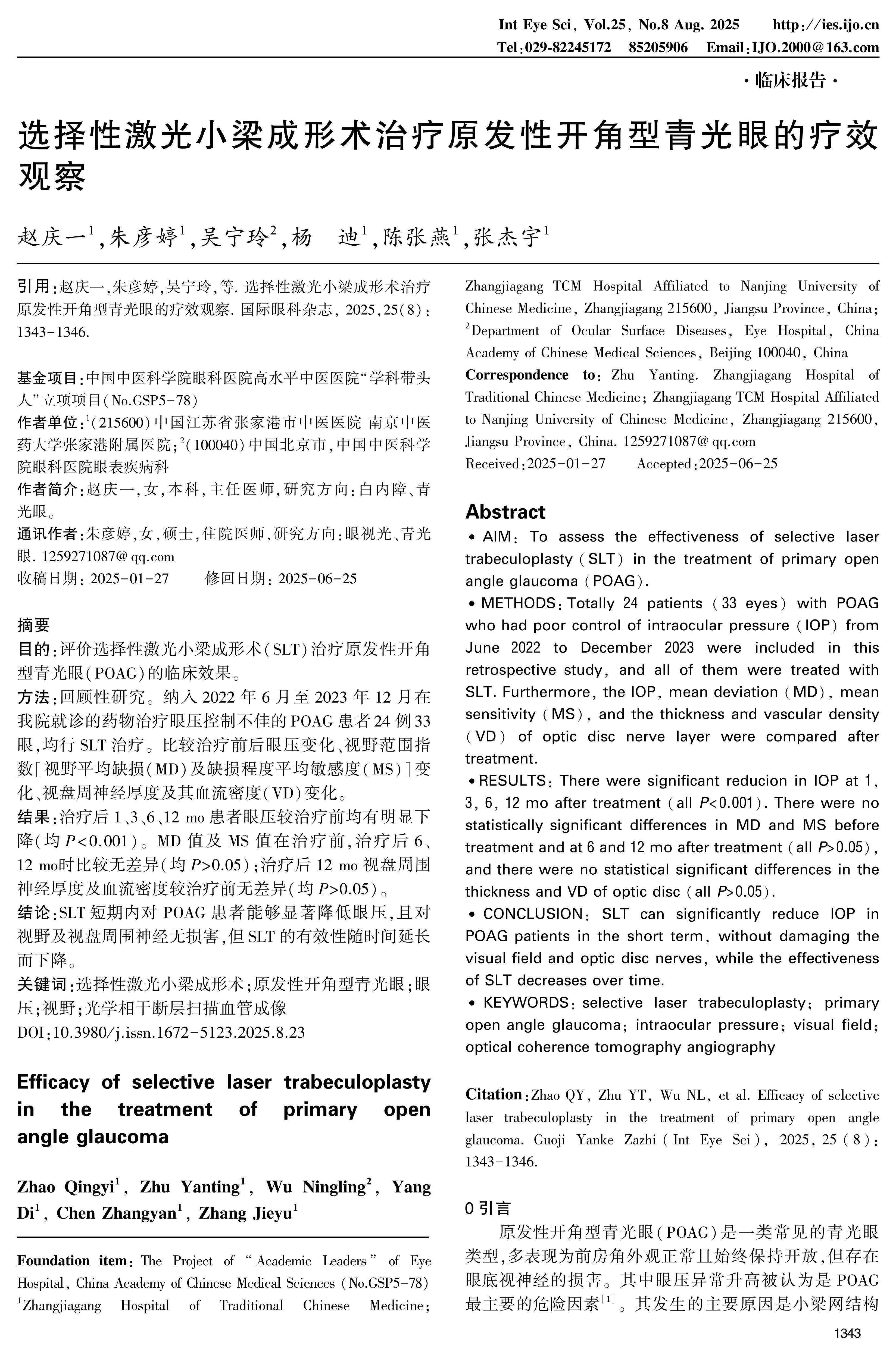 方法:回顾性研究。纳入2022年6月至2023年12月在我院就诊的药物治疗眼压控制不佳的POAG患者24例33眼,均行SLT治疗。比较治疗前后眼压变化、视野范围指数[视野平均缺损(MD)及缺损程度平均敏感度(MS)]变化、视盘周神经厚度及其血流密度(VD)变化。