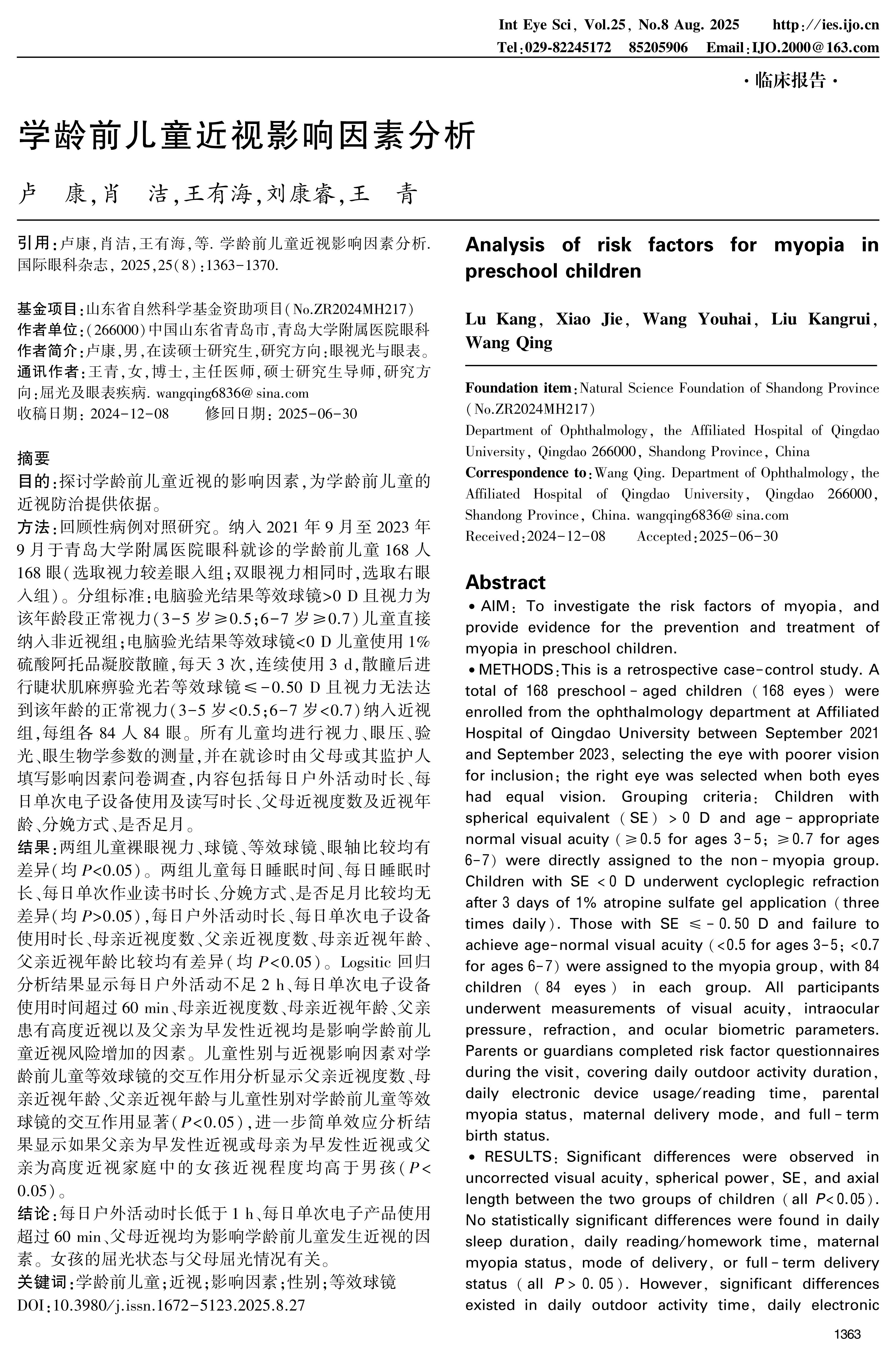 METHODS:This is a retrospective case-control study. A total of 168 preschool-aged children(168 eyes)were enrolled from the ophthalmology department at Affiliated Hospital of Qingdao University between September 2021 and September 2023, selecting the eye with poorer vision for inclusion; the right eye was selected when both eyes had equal vision. Grouping criteria: Children with spherical equivalent(SE)>0 D and age-appropriate normal visual acuity(≥0.5 for ages 3-5; ≥0.7 for ages 6-7)were directly assigned to the non-myopia group. Children with SE <0 D underwent cycloplegic refraction after 3 days of 1% atropine sulfate gel application(three times daily). Those with SE ≤-0.50 D and failure to achieve age-normal visual acuity(<0.5 for ages 3-5; <0.7 for ages 6-7)were assigned to the myopia group, with 84 children(84 eyes)in each group. All participants underwent measurements of visual acuity, intraocular pressure, refraction, and ocular biometric parameters. Parents or guardians completed risk factor questionnaires during the visit, covering daily outdoor activity duration, daily electronic device usage/reading time, parental myopia status, maternal delivery mode, and full-term birth status.