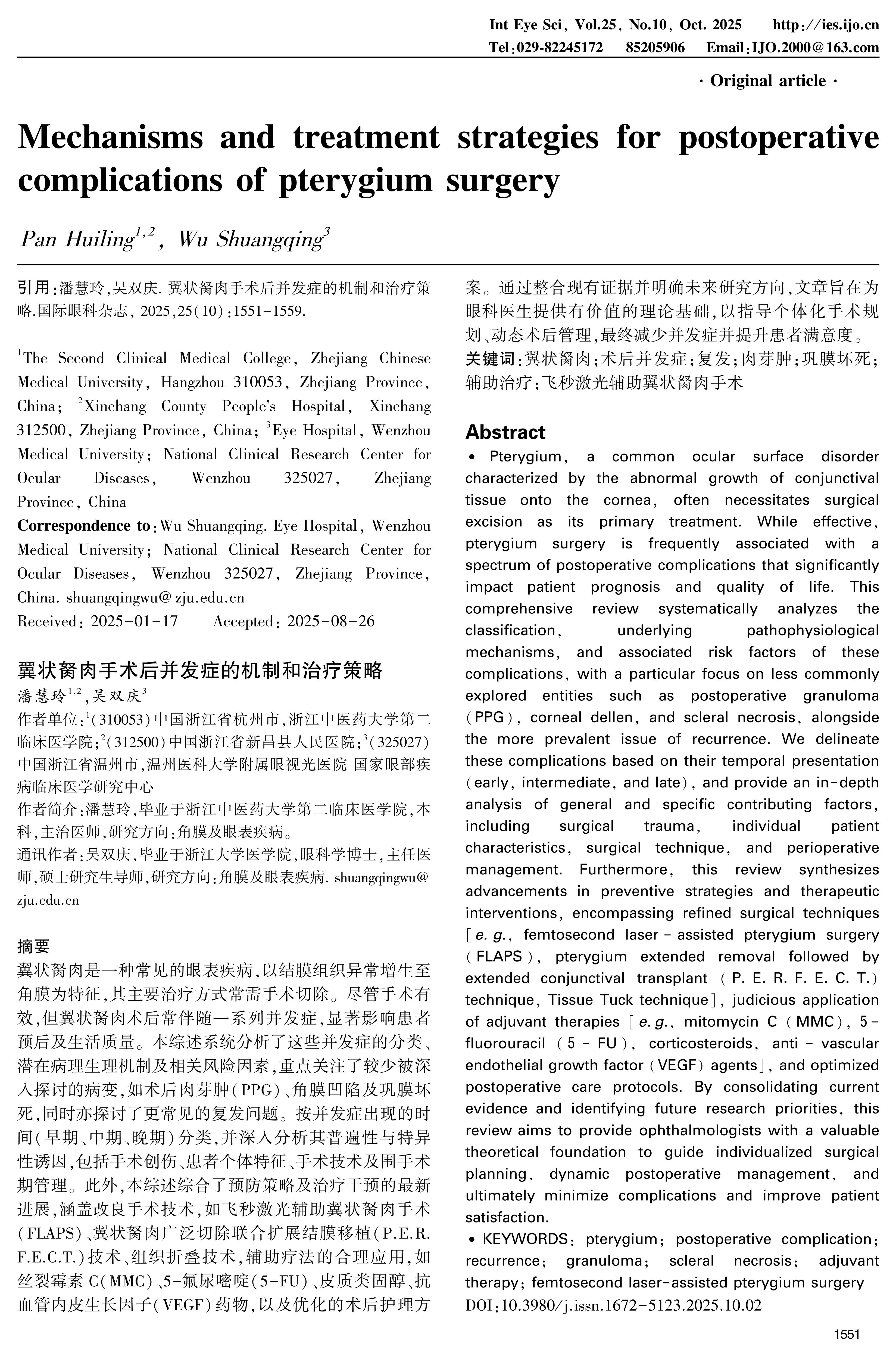 翼状胬肉是一种常见的眼表疾病,以结膜组织异常增生至角膜为特征,其主要治疗方式常需手术切除。尽管手术有效,但翼状胬肉术后常伴随一系列并发症,显著影响患者预后及生活质量。本综述系统分析了这些并发症的分类、潜在病理生理机制及相关风险因素,重点关注了较少被深入探讨的病变,如术后肉芽肿(PPG)、角膜凹陷及巩膜坏死,同时亦探讨了更常见的复发问题。按并发症出现的时间(早期、中期、晚期)分类,并深入分析其普遍性与特异性诱因,包括手术创伤、患者个体特征、手术技术及围手术期管理。此外,本综述综合了预防策略及治疗干预的最新进展,涵盖改良手术技术,如飞秒激光辅助翼状胬肉手术(FLAPS)、翼状胬肉广泛切除联合扩展结膜移植(P.E.R.F.E.C.T.)技术、组织折叠技术,辅助疗法的合理应用,如丝裂霉素C(MMC)、5-氟尿嘧啶(5-FU)、皮质类固醇、抗血管内皮生长因子(VEGF)药物,以及优化的术后护理方案。通过整合现有证据并明确未来研究方向,文章旨在为眼科医生提供有价值的理论基础,以指导个体化手术规划、动态术后管理,最终减少并发症并提升患者满意度。