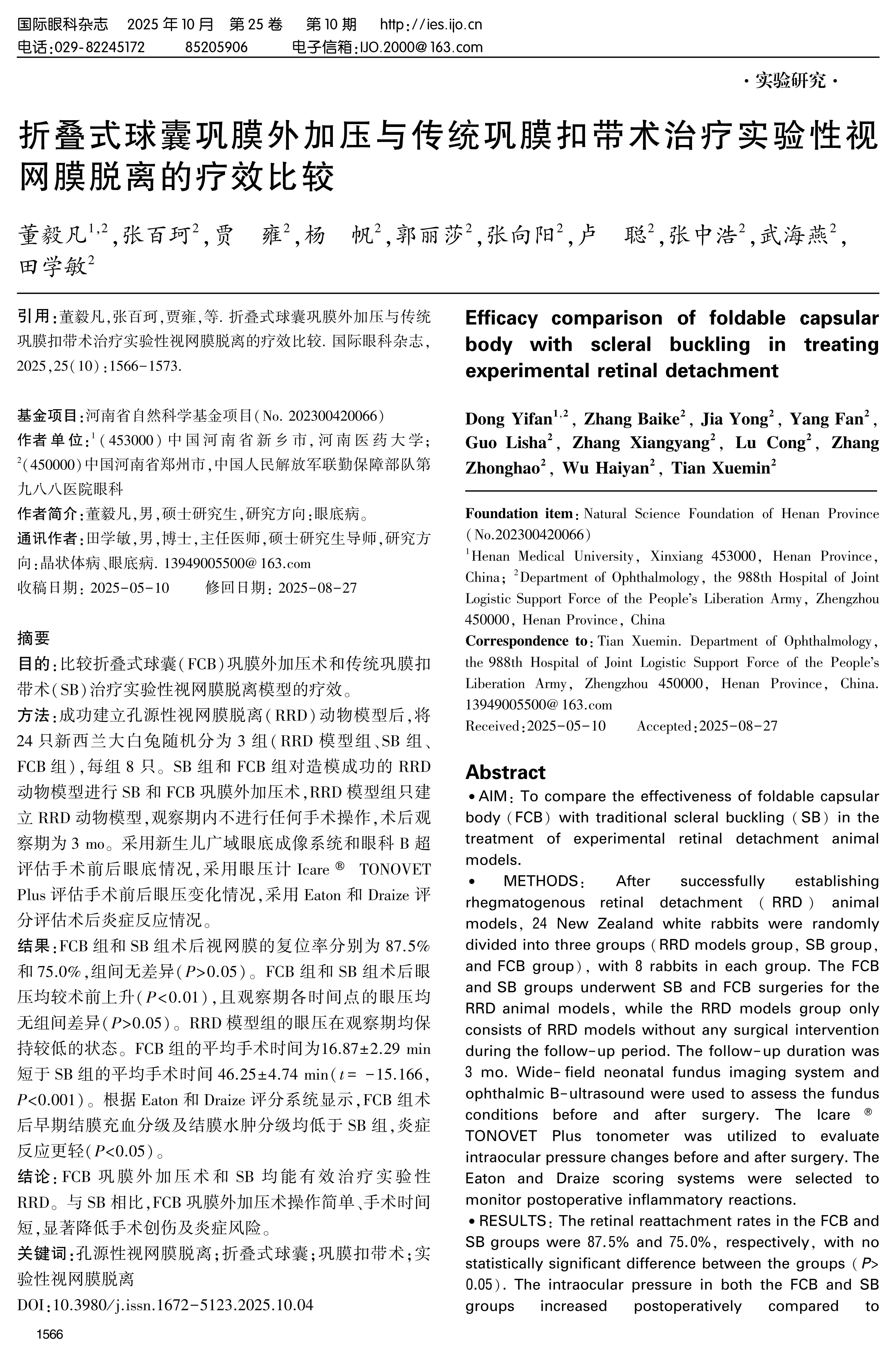 AIM: To compare the effectiveness of foldable capsular body(FCB)with traditional scleral buckling(SB)in the treatment of experimental retinal detachment animal models.METHODS: After successfully establishing rhegmatogenous retinal detachment(RRD)animal models, 24 New Zealand white rabbits were randomly divided into three groups(RRD models group, SB group, and FCB group), with 8 rabbits in each group. The FCB and SB groups underwent SB and FCB surgeries for the RRD animal models, while the RRD models group only consists of RRD models without any surgical intervention during the follow-up period. The follow-up duration was 3 mo. Wide-field neonatal fundus imaging system and ophthalmic B-ultrasound were used to assess the fundus conditions before and after surgery. The Icare® TONOVET Plus tonometer was utilized to evaluate intraocular pressure changes before and after surgery. The Eaton and Draize scoring systems were selected to monitor postoperative inflammatory reactions.RESULTS: The retinal reattachment rates in the FCB and SB groups were 87.5% and 75.0%, respectively, with no statistically significant difference between the groups(P>0.05). The intraocular pressure in both the FCB and SB groups increased postoperatively compared to preoperative levels(P<0.01), and there were no significant differences in intraocular pressure at any time points during the follow-up period between the groups(P>0.05). The intraocular pressure in the RRD models group remained at a low level throughout the follow-up period. The average surgical time for the FCB group was 16.87±2.29 min, which was shorter than 46.25±4.74 min in the SB group(t=-15.166, P<0.001). According to the Eaton and Draize scoring systems, the FCB group had lower grades of conjunctival hyperemia and edema in the early postoperative period compared to the SB group, indicating milder inflammatory reactions(P<0.05).CONCLUSION: Both FCB and SB are effective in treating experimental RRD. Compared to SB, FCB is simpler to operate, and also has a shorter surgical time and milder postoperative inflammatory reactions.