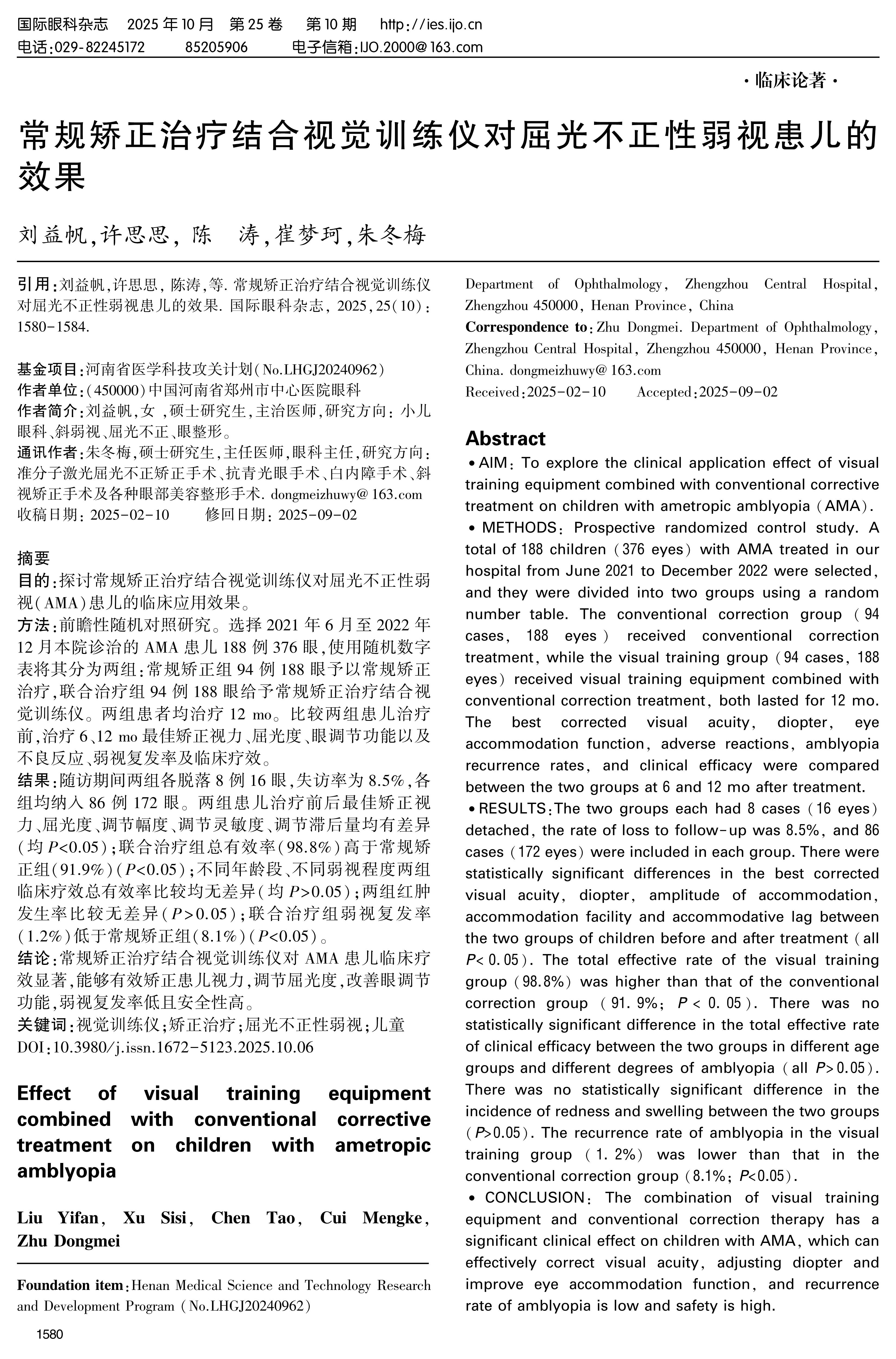 目的:探讨常规矫正治疗结合视觉训练仪对屈光不正性弱视(AMA)患儿的临床应用效果。方法:前瞻性随机对照研究。选择2021年6月至2022年12月本院诊治的AMA患儿188例376眼,使用随机数字表将其分为两组:常规矫正组94例188眼予以常规矫正治疗,联合治疗组94例188眼给予常规矫正治疗结合视觉训练仪。两组患者均治疗12 mo。比较两组患儿治疗前,治疗6、12 mo最佳矫正视力、屈光度、眼调节功能以及不良反应、弱视复发率及临床疗效。结果:随访期间两组各脱落8例16眼,失访率为8.5%,各组均纳入86例172眼。两组患儿治疗前后最佳矫正视力、屈光度、调节幅度、调节灵敏度、调节滞后量均有差异(均P<0.05); 联合治疗组总有效率(98.8%)高于常规矫正组(91.9%)(P<0.05); 不同年龄段、不同弱视程度两组临床疗效总有效率比较均无差异(均P>0.05); 两组红肿发生率比较无差异(P>0.05); 联合治疗组弱视复发率(1.2%)低于常规矫正组(8.1%)(P<0.05)。结论:常规矫正治疗结合视觉训练仪对AMA患儿临床疗效显著,能够有效矫正患儿视力,调节屈光度,改善眼调节功能,弱视复发率低且安全性高。