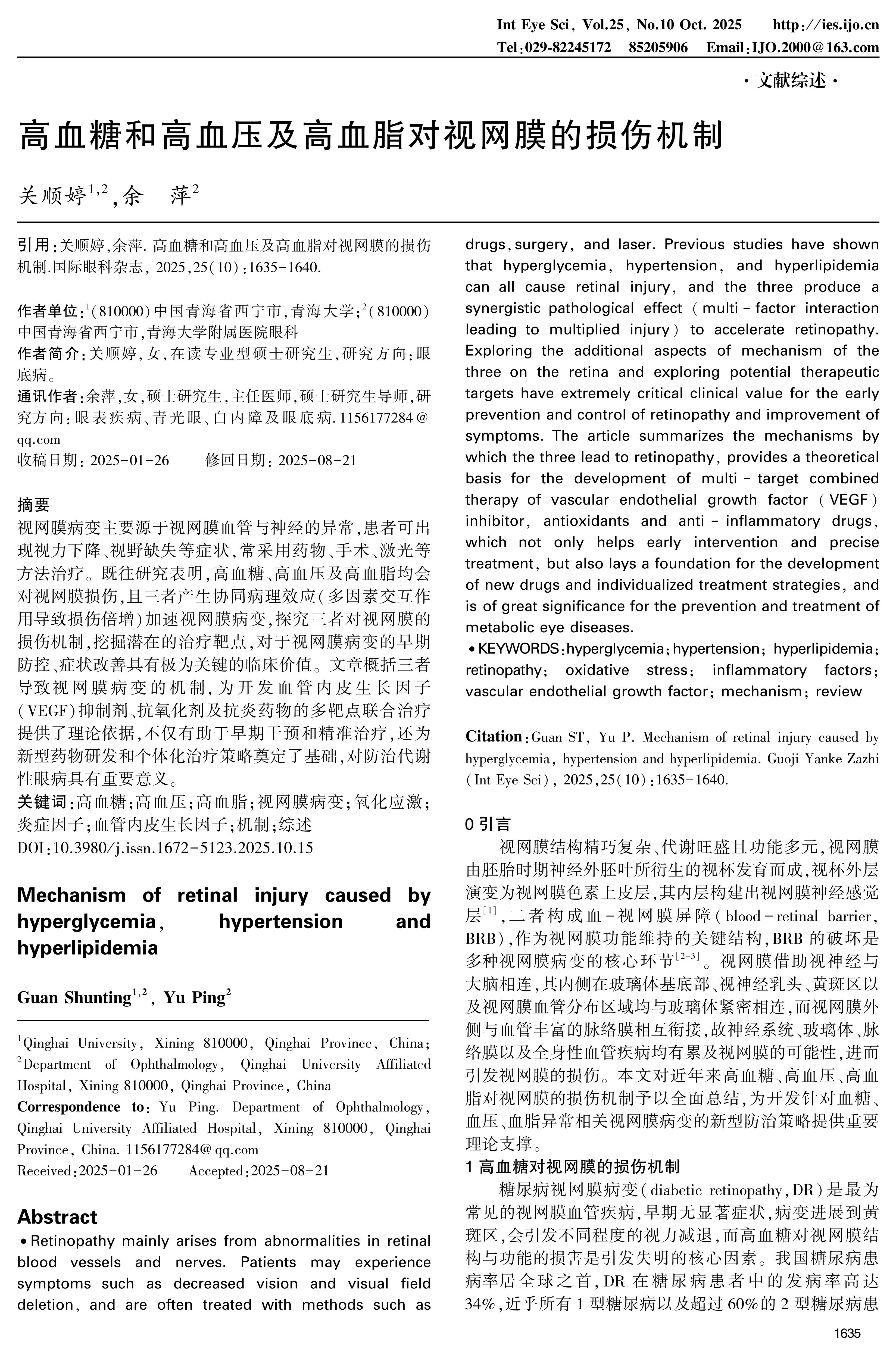 视网膜病变主要源于视网膜血管与神经的异常,患者可出现视力下降、视野缺失等症状,常采用药物、手术、激光等方法治疗。既往研究表明,高血糖、高血压及高血脂均会对视网膜损伤,且三者产生协同病理效应(多因素交互作用导致损伤倍增)加速视网膜病变,探究三者对视网膜的损伤机制,挖掘潜在的治疗靶点,对于视网膜病变的早期防控、症状改善具有极为关键的临床价值。文章概括三者导致视网膜病变的机制,为开发血管内皮生长因子(VEGF)抑制剂、抗氧化剂及抗炎药物的多靶点联合治疗提供了理论依据,不仅有助于早期干预和精准治疗,还为新型药物研发和个体化治疗策略奠定了基础,对防治代谢性眼病具有重要意义。