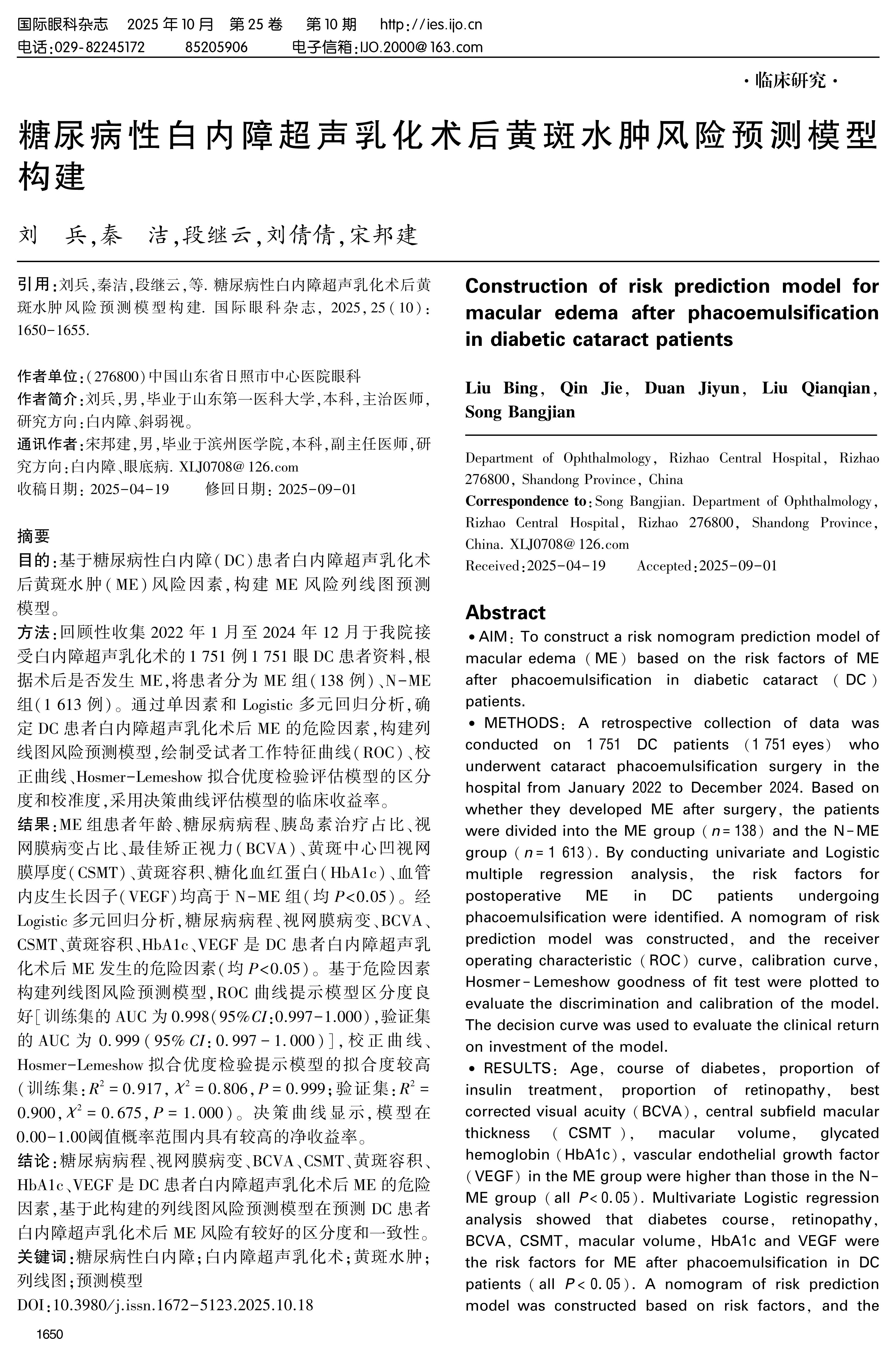 AIM: To construct a risk nomogram prediction model of macular edema(ME)based on the risk factors of ME after phacoemulsification in diabetic cataract(DC)patients.METHODS: A retrospective collection of data was conducted on 1 751 DC patients(1 751 eyes)who underwent cataract phacoemulsification surgery in the hospital from January 2022 to December 2024. Based on whether they developed ME after surgery, the patients were divided into the ME group(n=138)and the N-ME group(n=1 613). By conducting univariate and Logistic multiple regression analysis, the risk factors for postoperative ME in DC patients undergoing phacoemulsification were identified. A nomogram of risk prediction model was constructed, and the receiver operating characteristic(ROC)curve, calibration curve, Hosmer-Lemeshow goodness of fit test were plotted to evaluate the discrimination and calibration of the model. The decision curve was used to evaluate the clinical return on investment of the model.RESULTS: Age, course of diabetes, proportion of insulin treatment, proportion of retinopathy, best corrected visual acuity(BCVA), central subfield macular thickness(CSMT), macular volume, glycated hemoglobin(HbA1c), vascular endothelial growth factor(VEGF)in the ME group were higher than those in the N-ME group(all P<0.05). Multivariate Logistic regression analysis showed that diabetes course, retinopathy, BCVA, CSMT, macular volume, HbA1c and VEGF were the risk factors for ME after phacoemulsification in DC patients(all P<0.05). A nomogram of risk prediction model was constructed based on risk factors, and the ROC curve suggested good model differentiation [AUC of training set was 0.998(95% CI: 0.997-1.000), and AUC of validation set was 0.999(95% CI: 0.997-1.000)], set: R2=0.917, χ2=0.806, P=0.999; verification set: R2=0.900, χ2=0.675, P=1.000). The decision curve showed that the model had a high net return rate within the probability range of 0.00-1.00 threshold.CONCLUSION: Diabetes course, retinopathy, BCVA, CSMT, macular volume, HbA1c and VEGF are risk factors for ME after cataract phacoemulsification in DC patients. The nomogram of risk prediction model based on this construction has good differentiation and consistency in predicting the risk of ME after cataract phacoemulsification in DC patients.