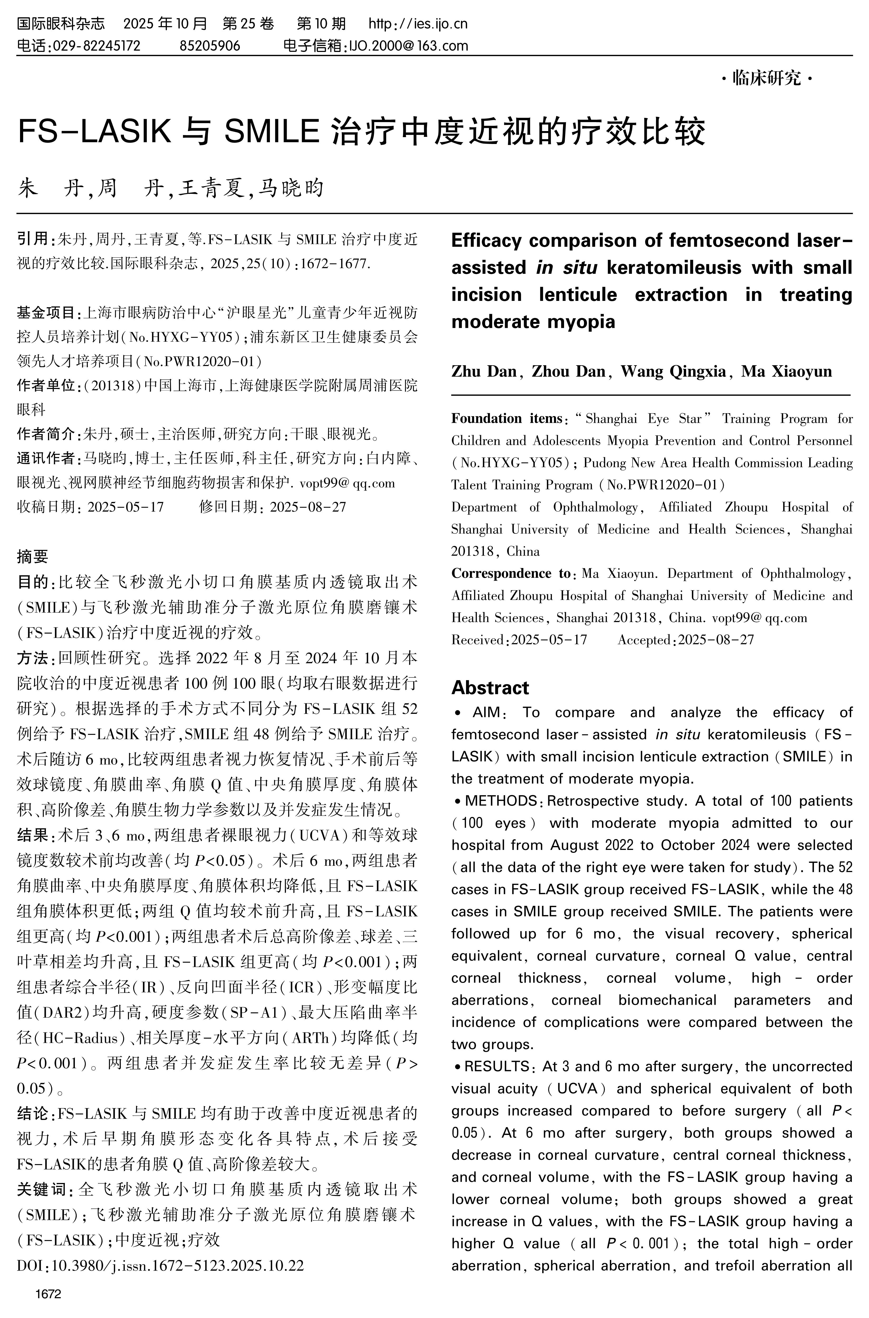 目的:比较全飞秒激光小切口角膜基质内透镜取出术(SMILE)与飞秒激光辅助准分子激光原位角膜磨镶术(FS-LASIK)治疗中度近视的疗效。方法:回顾性研究。选择2022年8月至2024年10月本院收治的中度近视患者100例100眼(均取右眼数据进行研究)。根据选择的手术方式不同分为FS-LASIK组52例给予FS-LASIK治疗,SMILE组48例给予SMILE治疗。术后随访6 mo,比较两组患者视力恢复情况、手术前后等效球镜度、角膜曲率、角膜Q值、中央角膜厚度、角膜体积、高阶像差、角膜生物力学参数以及并发症发生情况。结果:术后3、6 mo,两组患者裸眼视力(UCVA)和等效球镜度数较术前均改善(均P<0.05)。术后6 mo,两组患者角膜曲率、中央角膜厚度、角膜体积均降低,且FS-LASIK组角膜体积更低; 两组Q值均较术前升高,且FS-LASIK组更高(均P<0.001); 两组患者术后总高阶像差、球差、三叶草相差均升高,且FS-LASIK组更高(均P<0.001); 两组患者综合半径(IR)、反向凹面半径(ICR)、形变幅度比值(DAR2)均升高,硬度参数(SP-A1)、最大压陷曲率半径(HC-Radius)、相关厚度-水平方向(ARTh)均降低(均P<0.001)。两组患者并发症发生率比较无差异(P>0.05)。结论:FS-LASIK与SMILE均有助于改善中度近视患者的视力,术后早期角膜形态变化各具特点,术后接受FS-LASIK的患者角膜Q值、高阶像差较大。