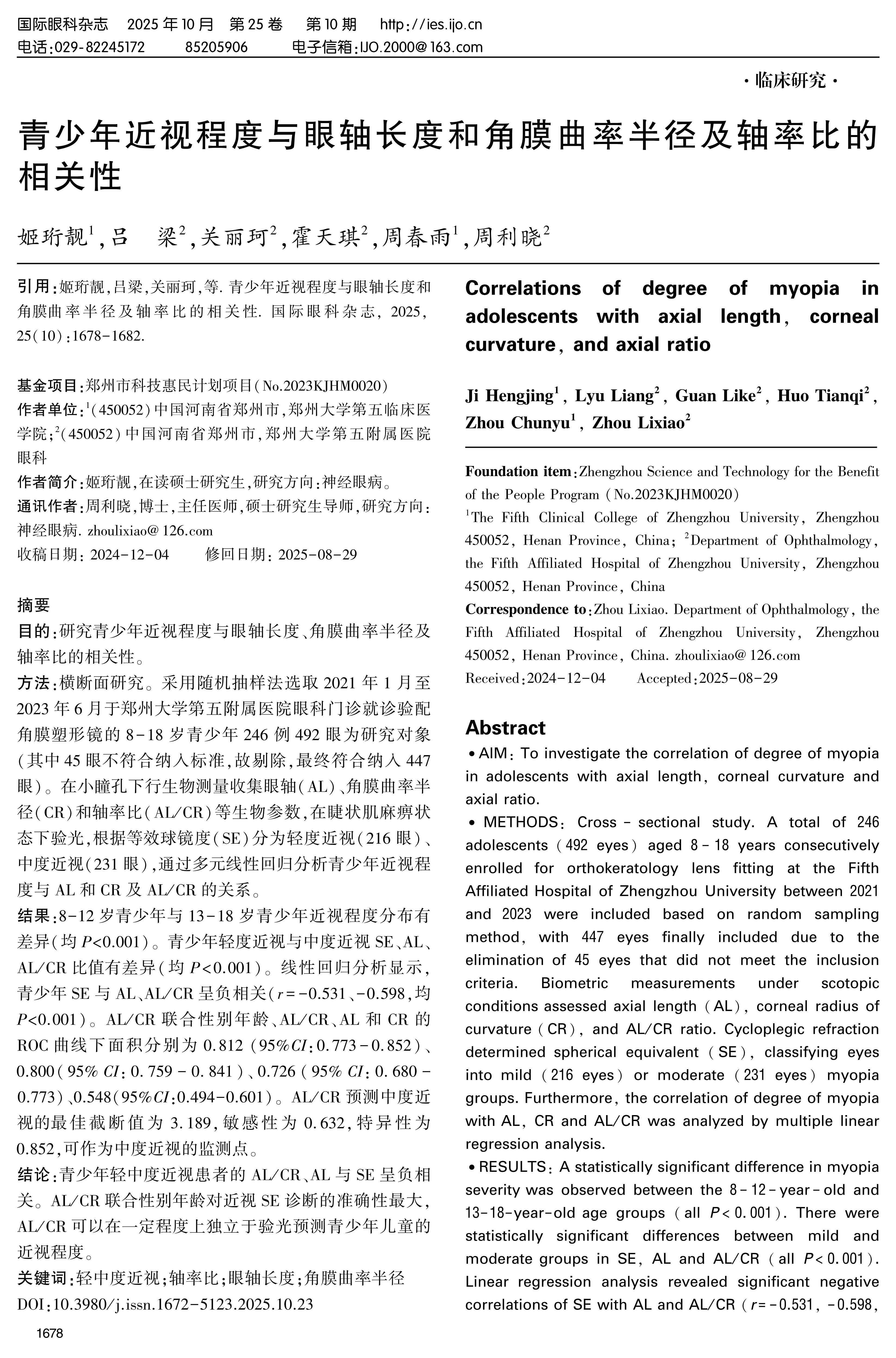 AIM: To investigate the correlation of degree of myopia in adolescents with axial length, corneal curvature and axial ratio.METHODS: Cross-sectional study. A total of 246 adolescents(492 eyes)aged 8-18 years consecutively enrolled for orthokeratology lens fitting at the Fifth Affiliated Hospital of Zhengzhou University between 2021 and 2023 were included based on random sampling method, with 447 eyes finally included due to the elimination of 45 eyes that did not meet the inclusion criteria. Biometric measurements under scotopic conditions assessed axial length(AL), corneal radius of curvature(CR), and AL/CR ratio. Cycloplegic refraction determined spherical equivalent(SE), classifying eyes into mild(216 eyes)or moderate(231 eyes)myopia groups. Furthermore, the correlation of degree of myopia with AL, CR and AL/CR was analyzed by multiple linear regression analysis.RESULTS: A statistically significant difference in myopia severity was observed between the 8-12-year-old and 13-18-year-old age groups(all P<0.001). There were statistically significant differences between mild and moderate groups in SE, AL and AL/CR(all P<0.001). Linear regression analysis revealed significant negative correlations of SE with AL and AL/CR(r=-0.531, -0.598, all P<0.001). The areas under the ROC curve(AUC)for predicting moderate myopia were 0.812(95% CI: 0.773-0.852)for AL/CR combined with gender and age, 0.800(95% CI: 0.759-0.841)for AL/CR alone, 0.726(95% CI: 0.680-0.773)for AL alone, and 0.548(95% CI: 0.494-0.601)for CR alone. The optimal AL/CR cut-off value for predicting moderate myopia was 3.189(sensitivity: 0.632, specificity: 0.852), suggesting its potential as a clinical threshold.CONCLUSION: In adolescents with mild-to-moderate myopia, AL/CR, AL, and SE showed significant negative correlations. The combination of AL/CR with gender and age demonstrated the highest diagnostic accuracy for SE. AL/CR shows independent predictive value for myopia degree in adolescents, irrespective of refractive status.