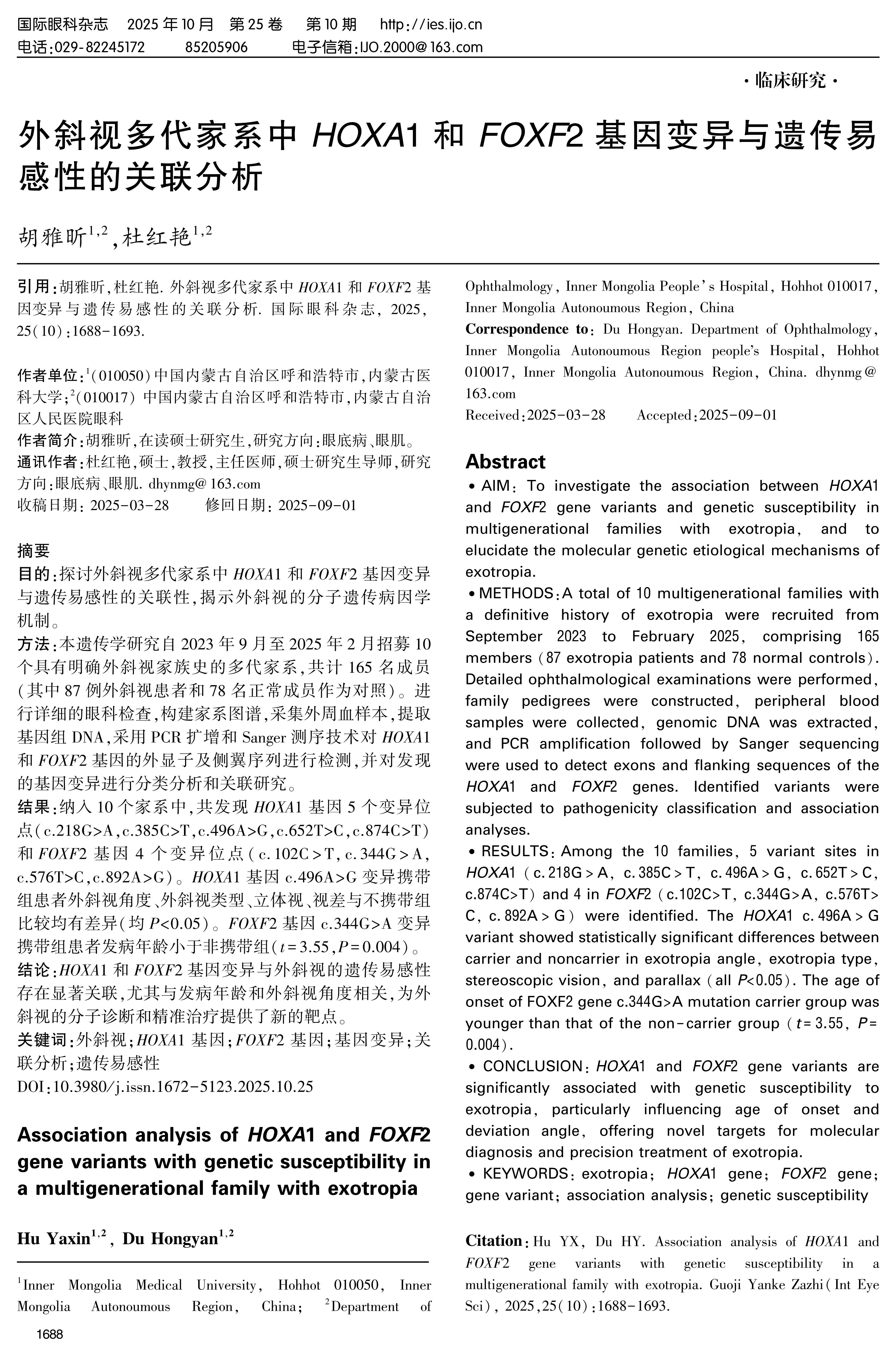 AIM: To investigate the association between HOXA1 and FOXF2 gene variants and genetic susceptibility in multigenerational families with exotropia, and to elucidate the molecular genetic etiological mechanisms of exotropia.METHODS:A total of 10 multigenerational families with a definitive history of exotropia were recruited from September 2023 to February 2025, comprising 165 members(87 exotropia patients and 78 normal controls). Detailed ophthalmological examinations were performed, family pedigrees were constructed, peripheral blood samples were collected, genomic DNA was extracted, and PCR amplification followed by Sanger sequencing were used to detect exons and flanking sequences of the HOXA1 and FOXF2 genes. Identified variants were subjected to pathogenicity classification and association analyses.RESULTS:Among the 10 families, 5 variant sites in HOXA1(c.218G>A, c.385C>T, c.496A>G, c.652T>C, c.874C>T)and 4 in FOXF2(c.102C>T, c.344G>A, c.576T>C, c.892A>G)were identified. The HOXA1 c.496A>G variant showed statistically significant differences between carrier and noncarrier in exotropia angle, exotropia type, stereoscopic vision, and parallax(all P<0.05). The age of onset of FOXF2 gene c.344G>A mutation carrier group was younger than that of the non-carrier group(t=3.55, P=0.004).CONCLUSION:HOXA1 and FOXF2 gene variants are significantly associated with genetic susceptibility to exotropia, particularly influencing age of onset and deviation angle, offering novel targets for molecular diagnosis and precision treatment of exotropia.