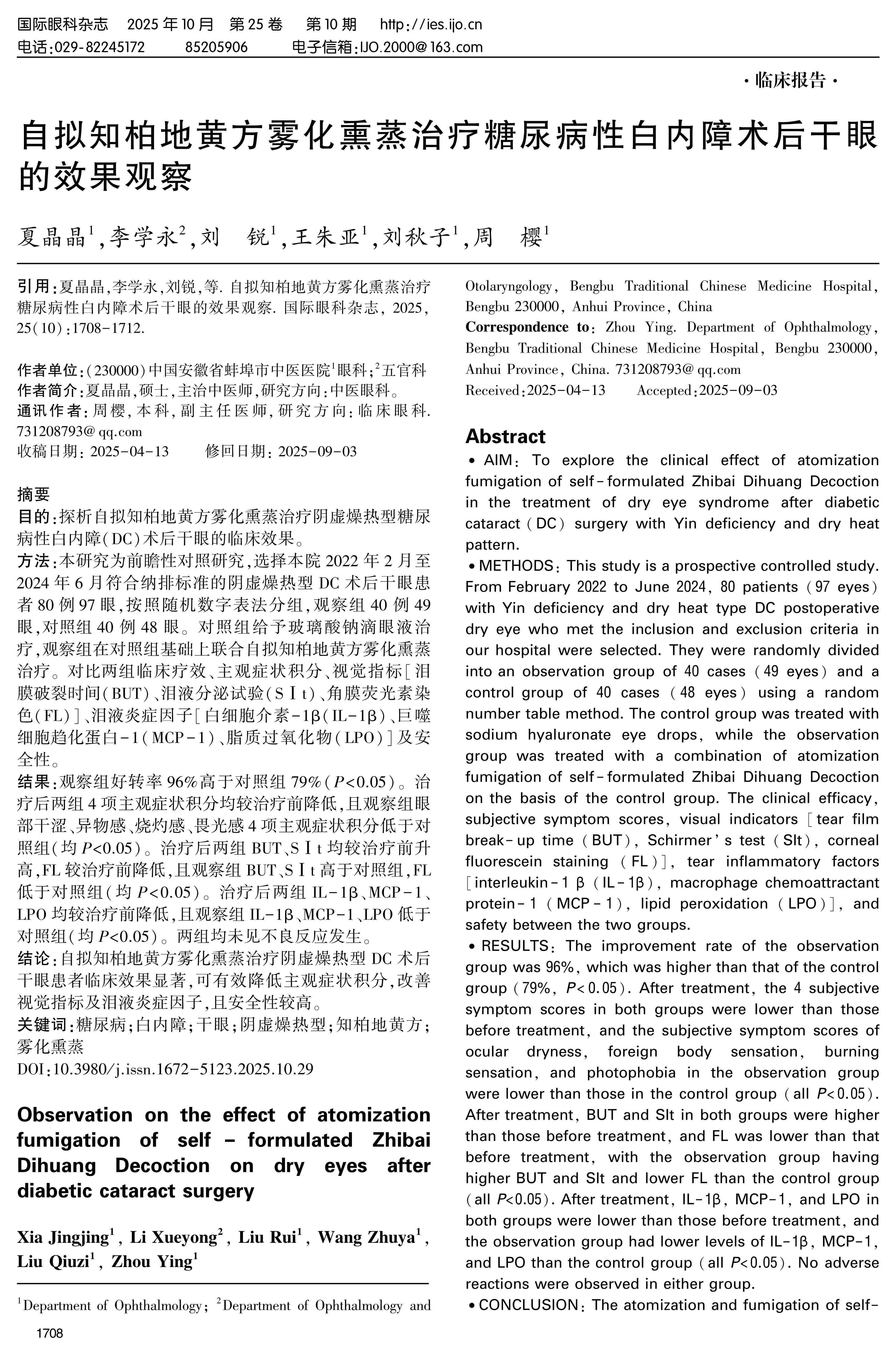 AIM: To explore the clinical effect of atomization fumigation of self-formulated Zhibai Dihuang Decoction in the treatment of dry eye syndrome after diabetic cataract(DC)surgery with Yin deficiency and dry heat pattern.METHODS: This study is a prospective controlled study. From February 2022 to June 2024, 80 patients(97 eyes)with Yin deficiency and dry heat type DC postoperative dry eye who met the inclusion and exclusion criteria in our hospital were selected. They were randomly divided into an observation group of 40 cases(49 eyes)and a control group of 40 cases(48 eyes)using a random number table method. The control group was treated with sodium hyaluronate eye drops, while the observation group was treated with a combination of atomization fumigation of self-formulated Zhibai Dihuang Decoction on the basis of the control group. The clinical efficacy, subjective symptom scores, visual indicators [tear film break-up time(BUT), Schirmer's test(SIt), corneal fluorescein staining(FL)], tear inflammatory factors [interleukin-1 β(IL-1β), macrophage chemoattractant protein-1(MCP-1), lipid peroxidation(LPO)], and safety between the two groups.RESULTS: The improvement rate of the observation group was 96%, which was higher than that of the control group(79%, P<0.05). After treatment, the 4 subjective symptom scores in both groups were lower than those before treatment, and the subjective symptom scores of ocular dryness, foreign body sensation, burning sensation, and photophobia in the observation group were lower than those in the control group(all P<0.05). After treatment, BUT and SIt in both groups were higher than those before treatment, and FL was lower than that before treatment, with the observation group having higher BUT and SIt and lower FL than the control group(all P<0.05). After treatment, IL-1β, MCP-1, and LPO in both groups were lower than those before treatment, and the observation group had lower levels of IL-1β, MCP-1, and LPO than the control group(all P<0.05). No adverse reactions were observed in either group.CONCLUSION: The atomization and fumigation of self-formulated Zhibai Dihuang Decoction is significantly effective in treating dry eye syndrome after DC surgery with Yin deficiency and dry heat pattern. It can effectively reduce subjective symptom scores, improve visual indicators and tear inflammatory factors, and has a high level of safety.