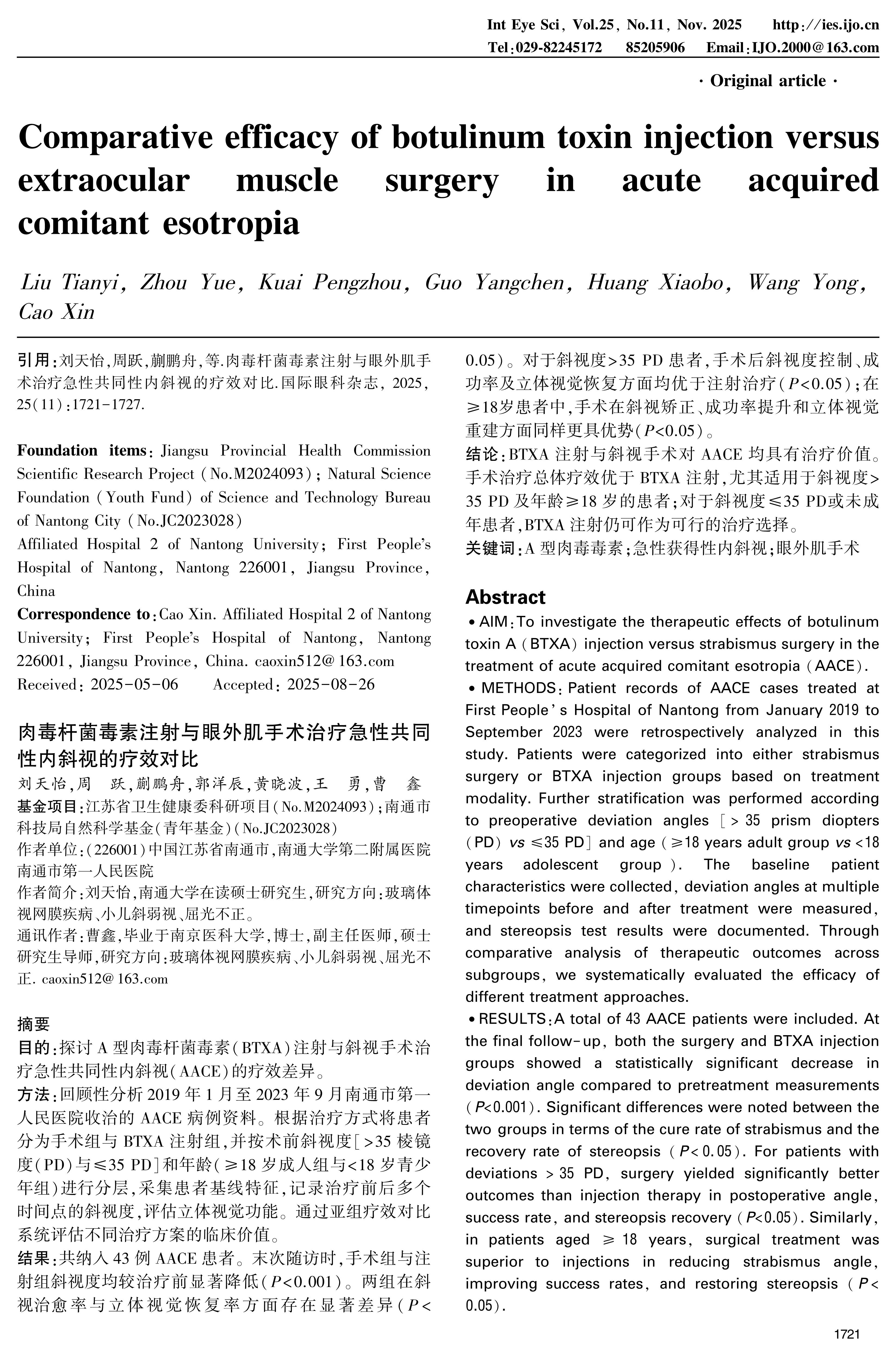 结论:BTXA注射与斜视手术对AACE均具有治疗价值。手术治疗总体疗效优于BTXA注射,尤其适用于斜视度>35 PD及年龄≥18岁的患者; 对于斜视度≤35 PD或未成年患者,BTXA注射仍可作为可行的治疗选择。